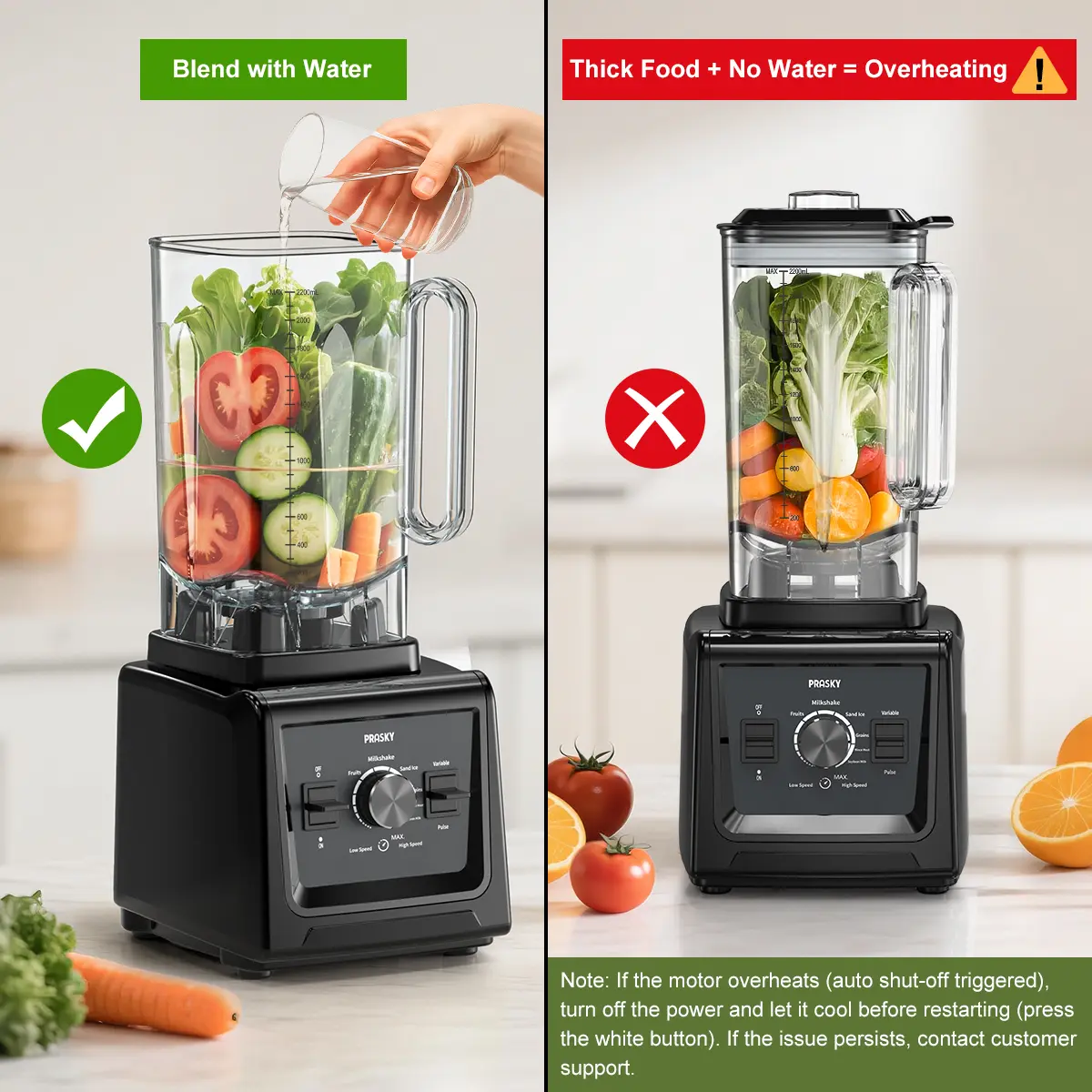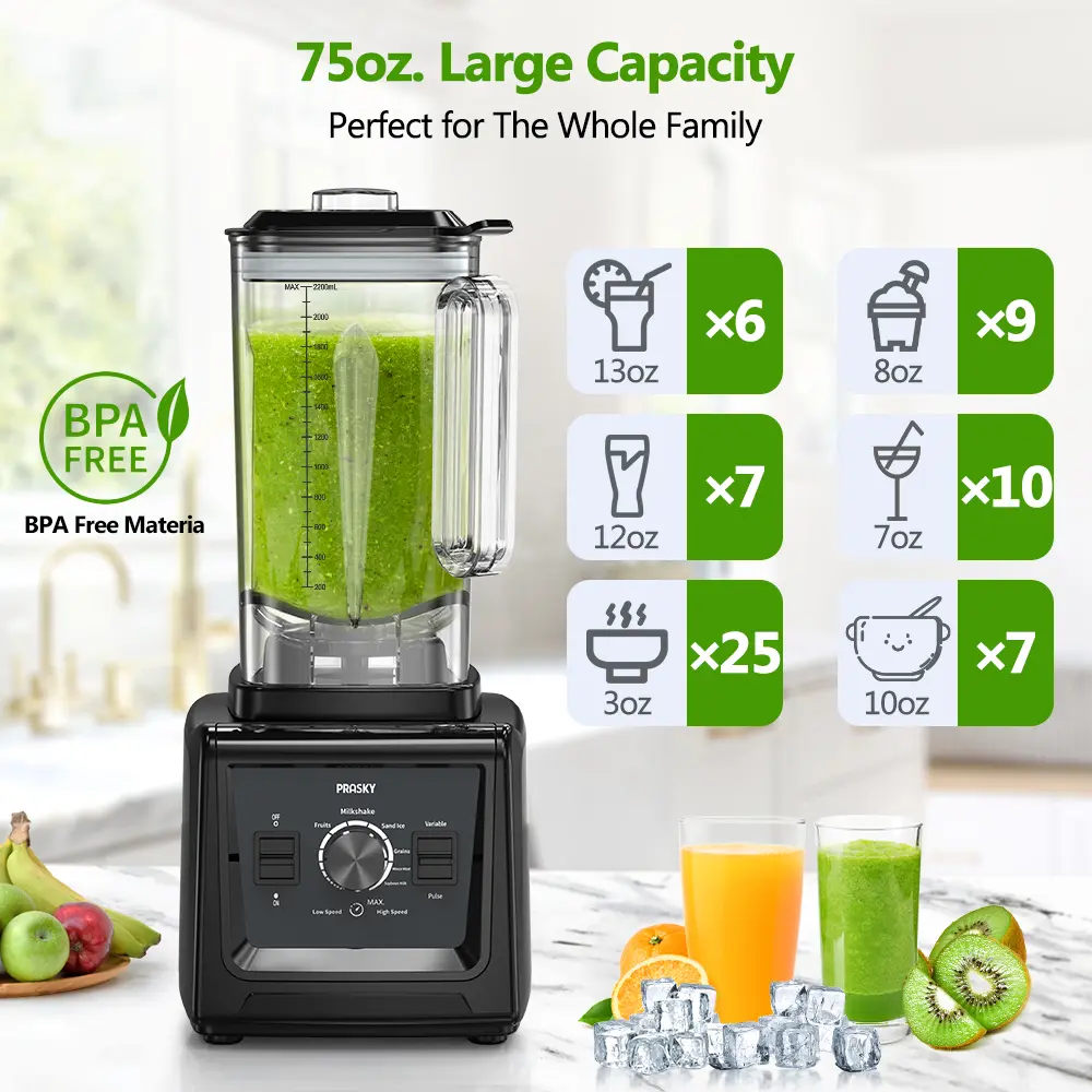 【High-Performance Power】The PRASKY blender is powered by a 3.0-horsepower motor, reaching speeds of up to 25,000 RPM, and features enhanced 6-blade sharp blades that easily crush ice, fruits, and vegetables, ensuring faster, more powerful blending for smoothies and shakes.