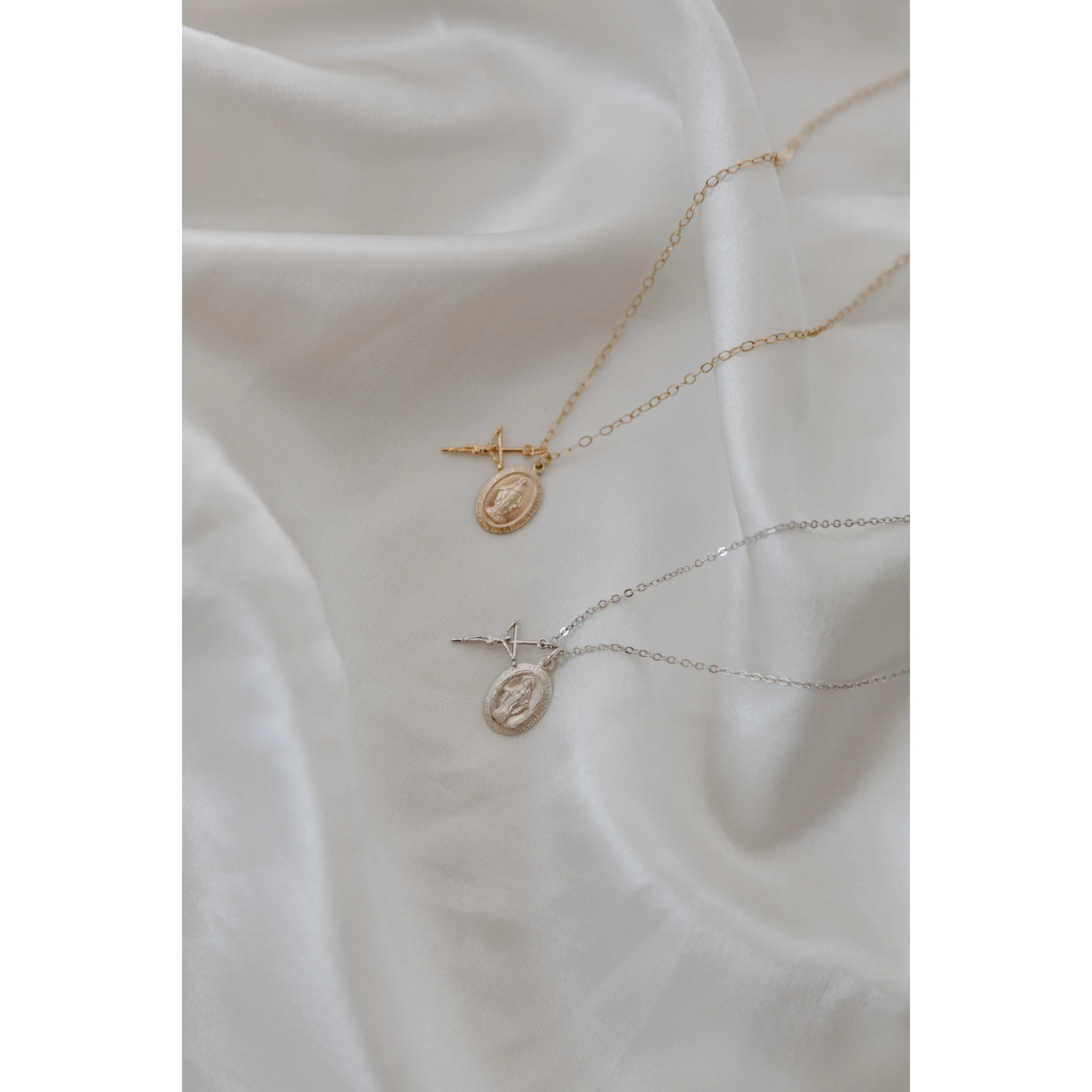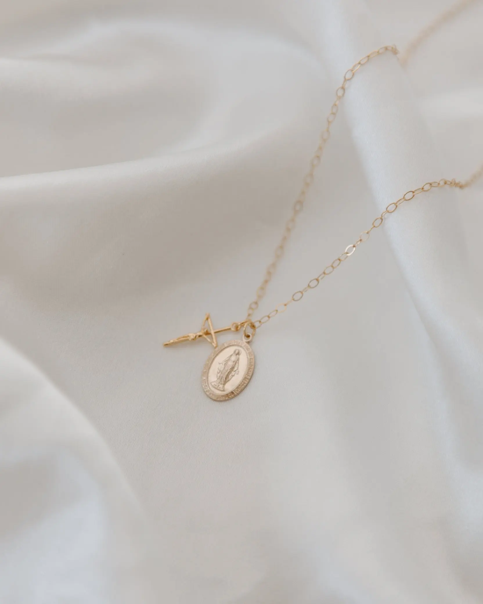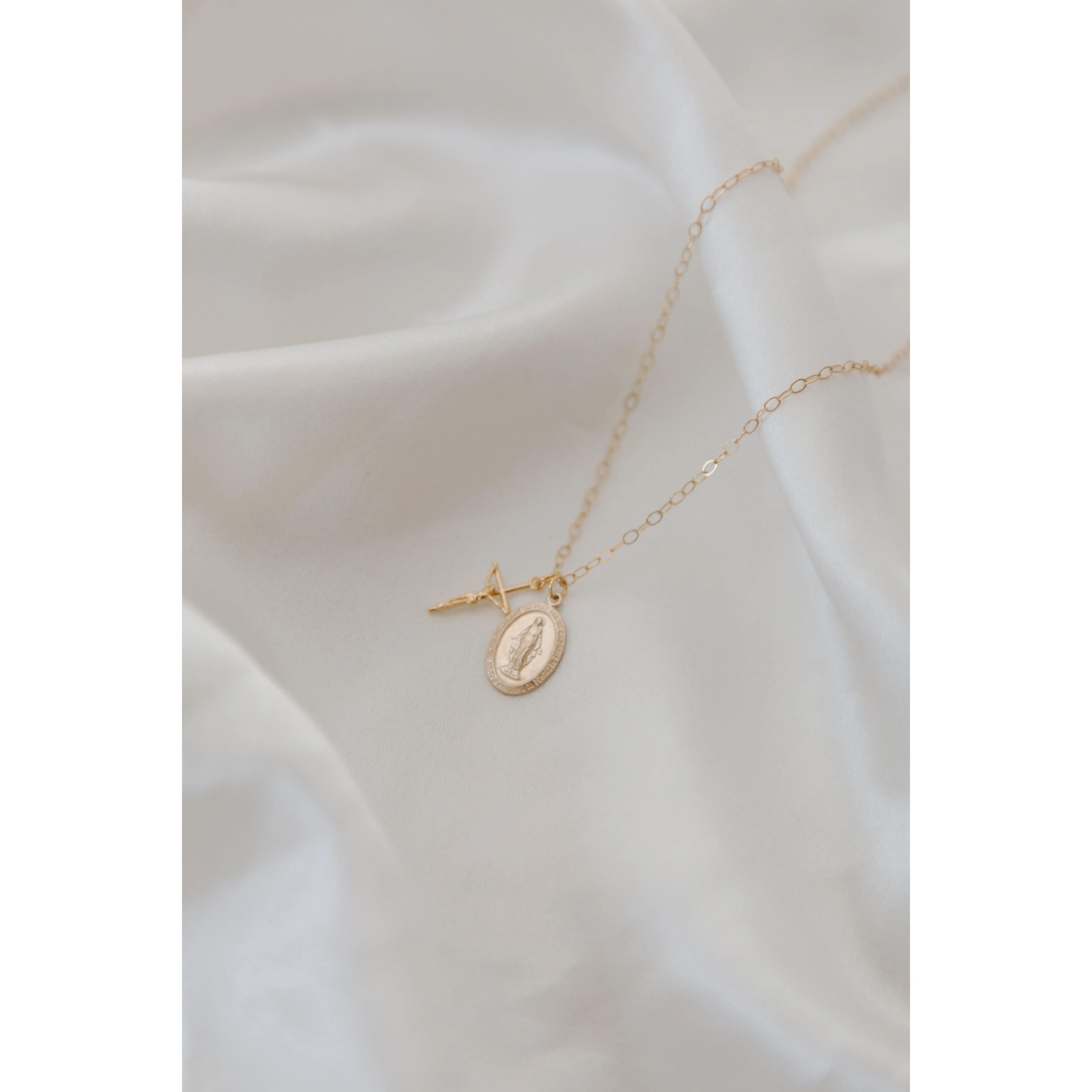 Beautiful and dainty cross and miraculous medal. My only concern is that the chain won’t stand up to the tugging of my children but it has so far! In the case it does break it would be very easy to transfer these to another chain. Love the gold color and 18in chain.
