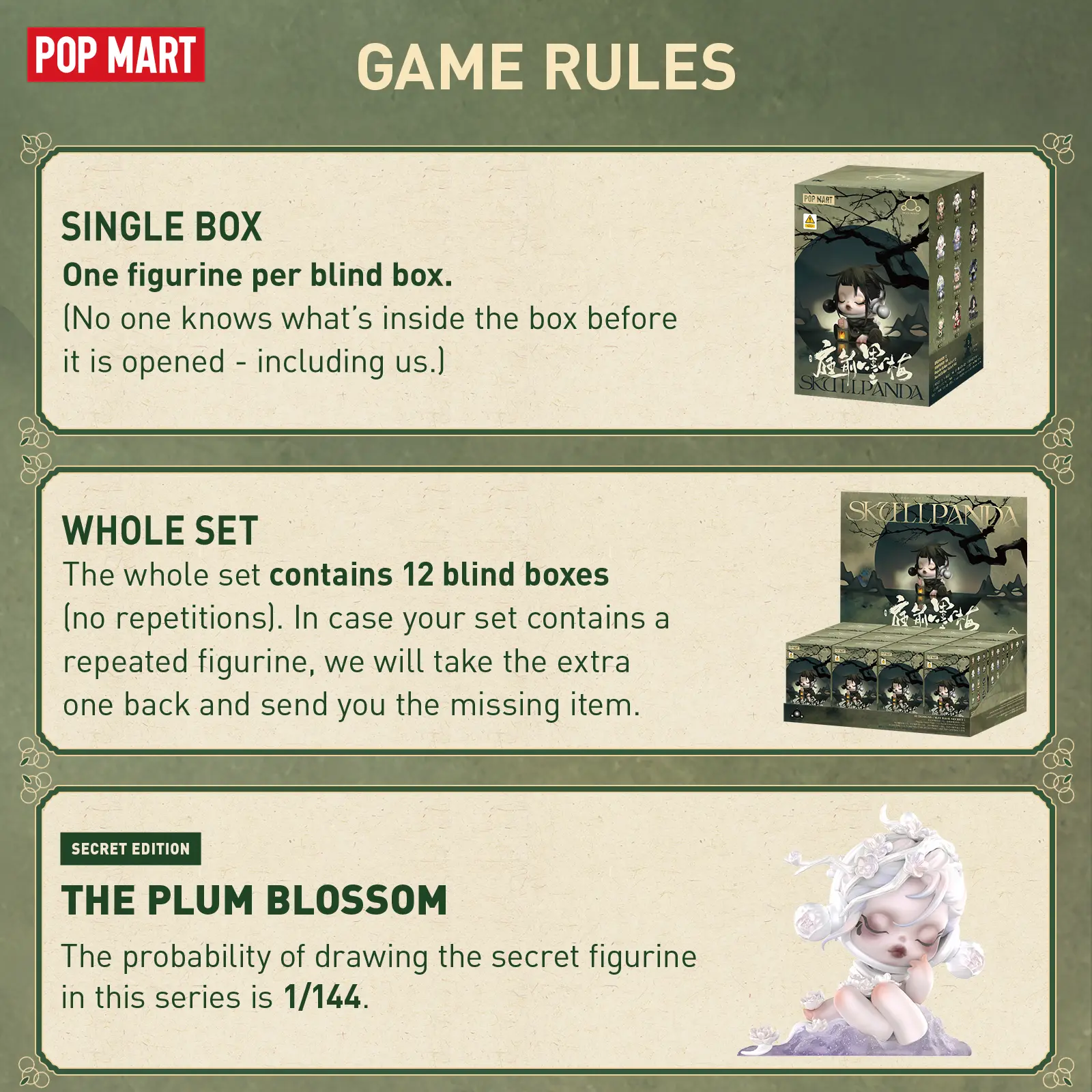“Blind box” means no one knows which exact figurine of the series you may get before opening—nor do us. A regular figurine will be replaced if the secret edition appears in the whole set (big congratulations!!!)