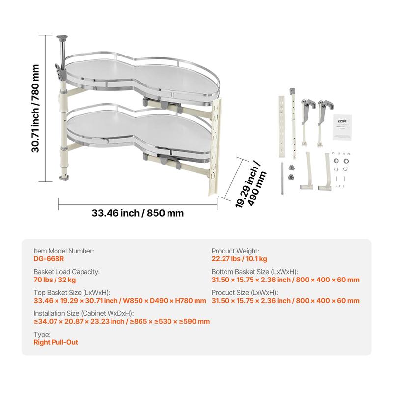 • Large Capacity Storage: The dual-layer kitchen blind corner cabinet organizer offers an extra-large capacity, with each basket measuring 31.5x15.75x2.36 inch / 800x400x60 mm, accommodating bowls, plates, spices, and jars.