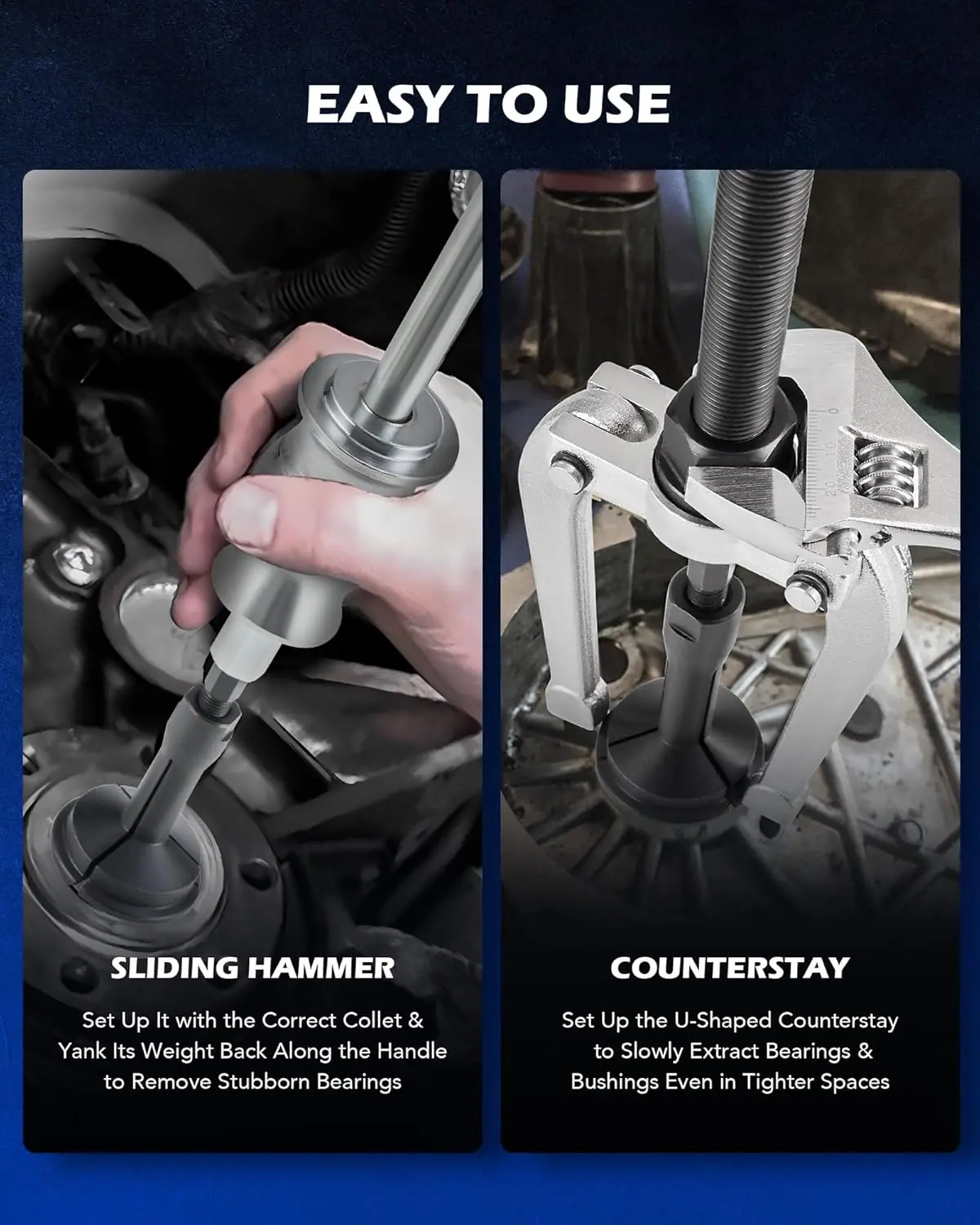 EASY TO USE: For most parts, just fit the appropriate collet, lock it into the inner race, and pull the slide hammer's weight back to easily knock out the bearing or bushing; for tighter or more delicate operation, the counterstay can be slowly tightened to more carefully extract the part