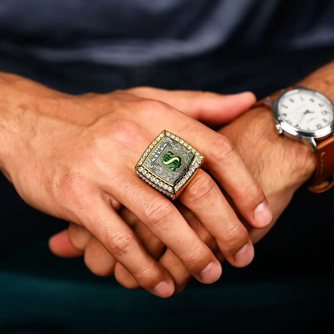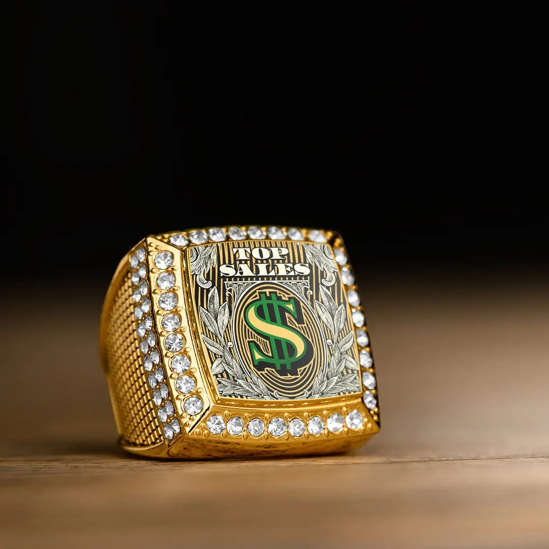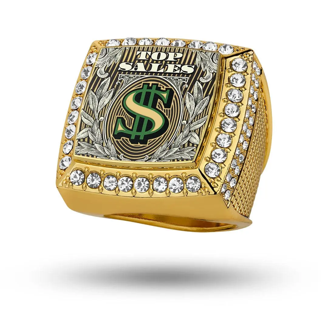 Boost employee morale and mark a top sales milestone with our Top Sales Ultimate Bling Ring. Create a culture of healthy competition and encourage positive recognition within any type of corporate marketing, sales, or real estate team. This epic ring is surrounded by dozens of blindingly bright not-real diamonds and is available in a silver or gold metallic finish.