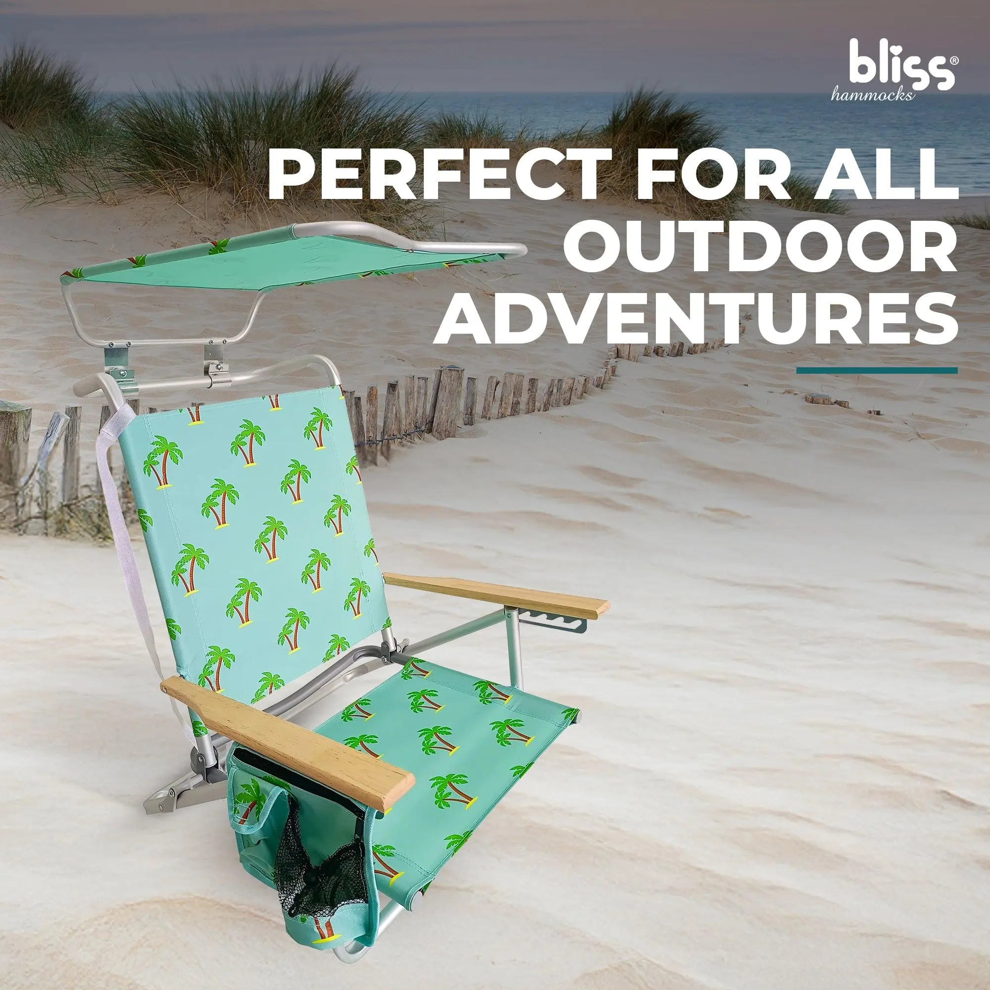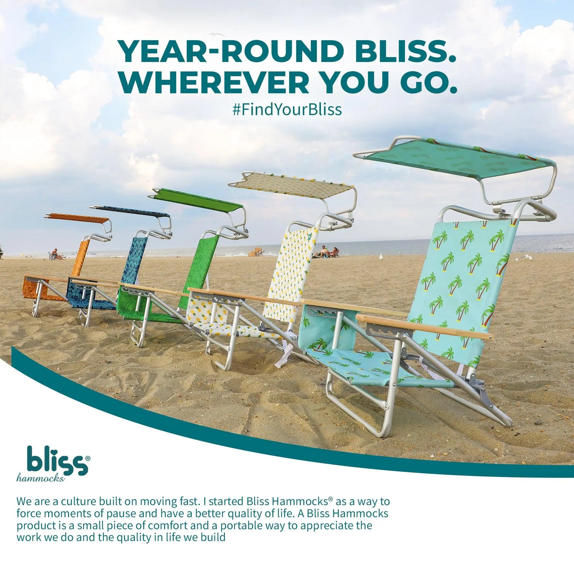 Bring some style to the beach or campsite, lakefront, or your yard, deck, or patio with the Folding Beach Chair from Bliss Hammocks. This chair is designed to provide maximum comfort while you lounge, offering 5 adjustable reclining positions, including a fully reclined option. Whether you're at the beach, camping, or just enjoying a sunny day at the park, you'll find your bliss in this versatile chair. Built for durability and convenience, the chair features 600-denier polyester fabric supported by a lightweight, rust-proof aluminum frame. With an 8.7-pound frame, the lightweight chair can comfortably support up to 275 pounds, making it a reliable choice for a wide range of users. For added protection, the chair includes an adjustable canopy that blocks over 90% of UV rays to ensure your safety from the sun. Bliss Hammocks has thought of everything to enhance your outdoor experience. The chair comes equipped with shoulder straps for easy and comfortable transport and a zippered lined storage pouch for keeping essentials close. Additionally, the chair features cell phone holders, storage pockets, a mesh cup holder, and even a folding towel rack, providing all the storage you need while relaxing. Bliss Hammocks believes in creating outdoor seating and accessories that encourage you to slow down, relax, and enjoy the simple moments. With the Bliss Hammocks Beach Chair, you can take a break from the fast-paced world and embrace true relaxation, wherever you go - Find your Bliss.