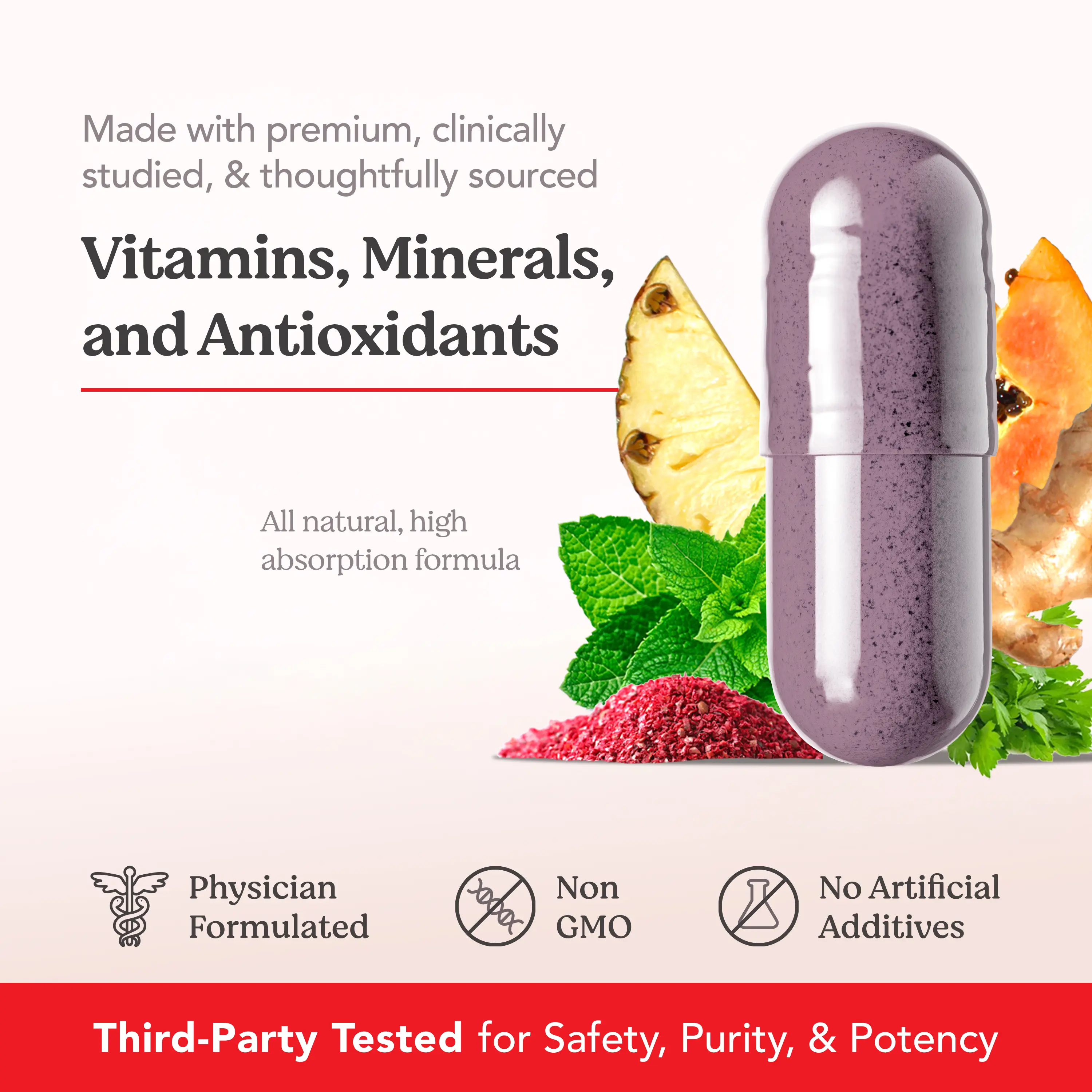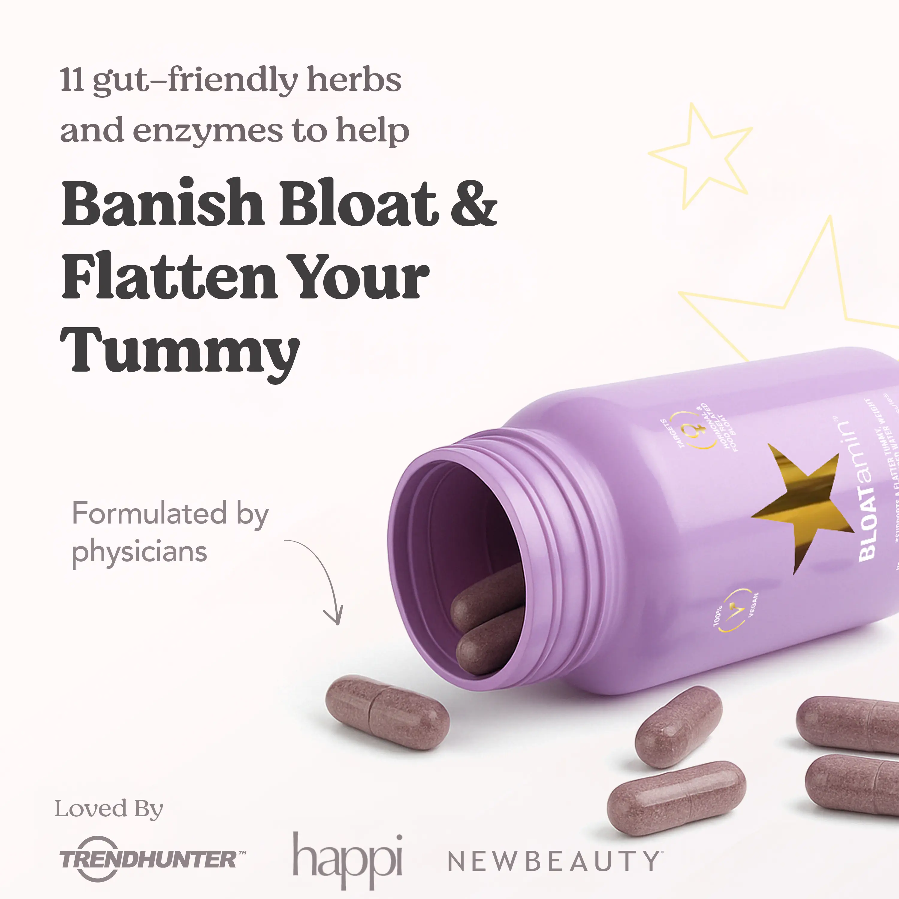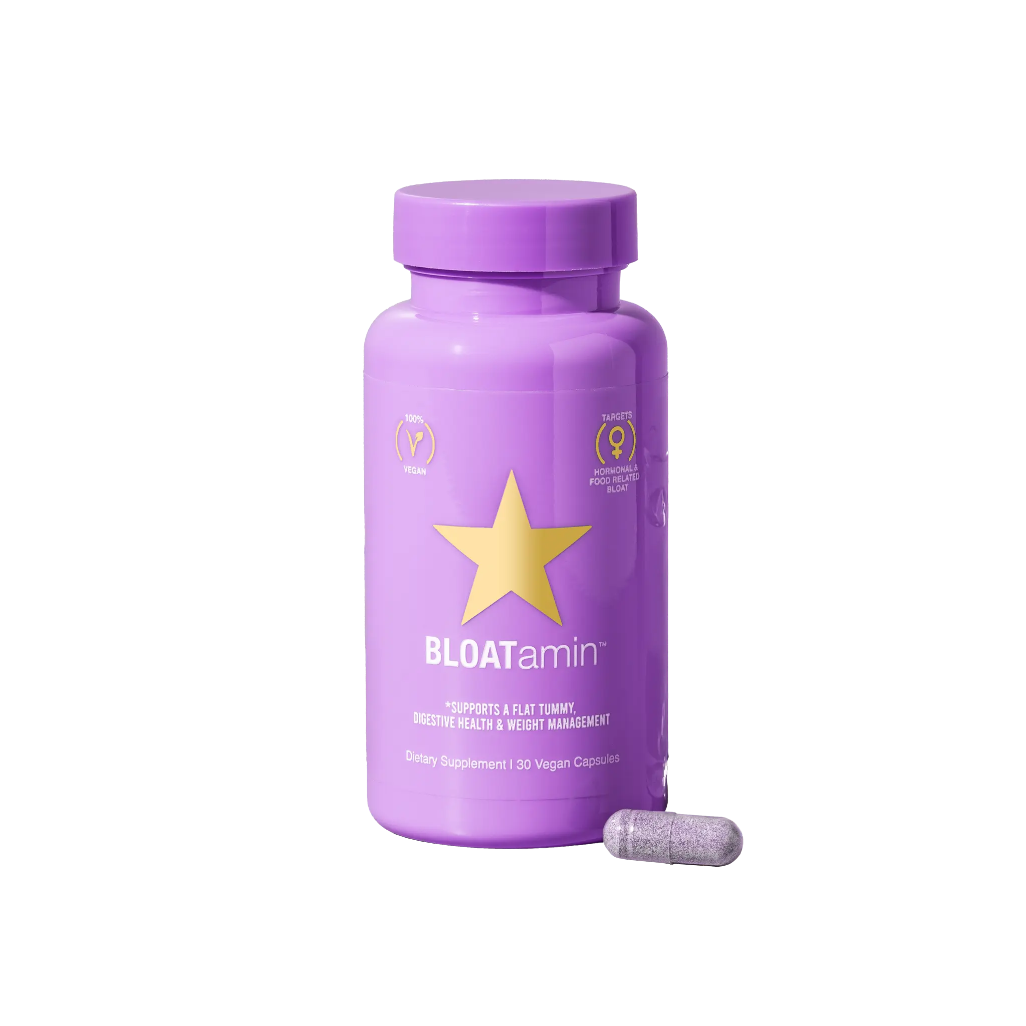 BLOATamin is a clean, physician-formulated blend of 11 herbs like sumac, chamomile, peppermint, and fennel, plus fruit-based enzymes—papain, bromelain, lipase—to help relieve occasional bloating, gas, and water retention. Each vegan capsule supports healthy metabolism and digestion with natural plant extracts your body recognizes.