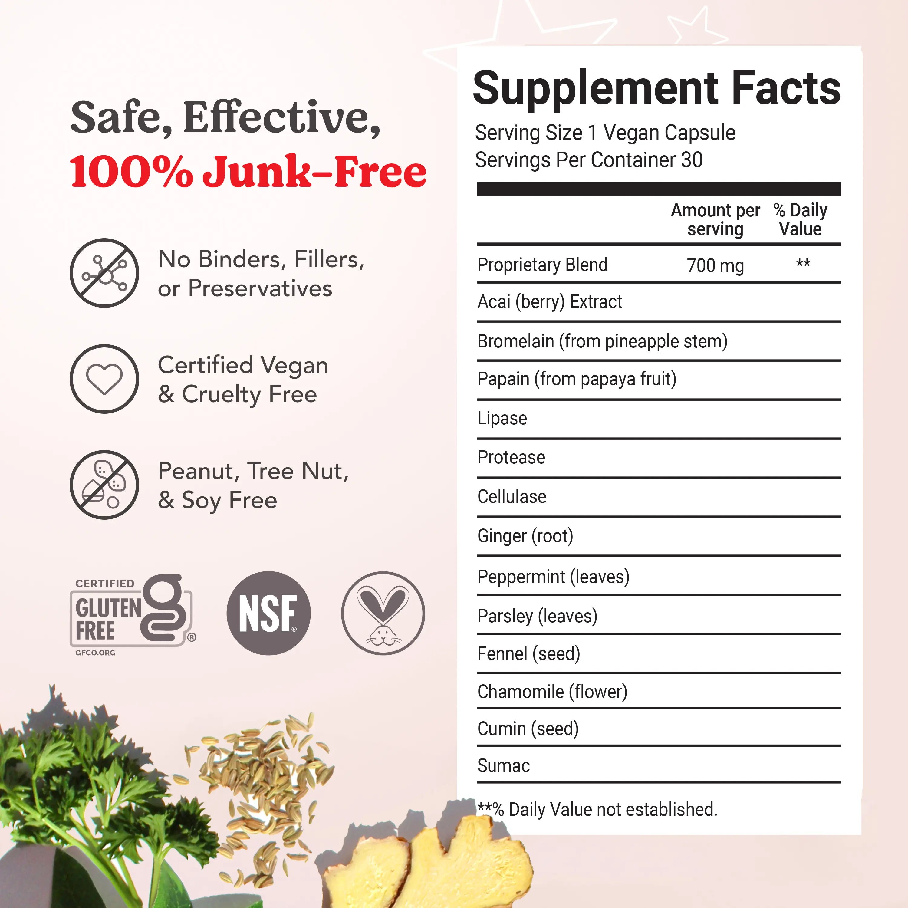 Nutritional Value: Each vegan capsule contains a 700 mg proprietary blend of digestive enzymes (bromelain, papain, lipase), herbs like chamomile, peppermint, fennel, ginger, parsley, cumin, and superfruits including acai and sumac. Designed to support digestion, reduce bloating, and ease occasional stomach discomfort.