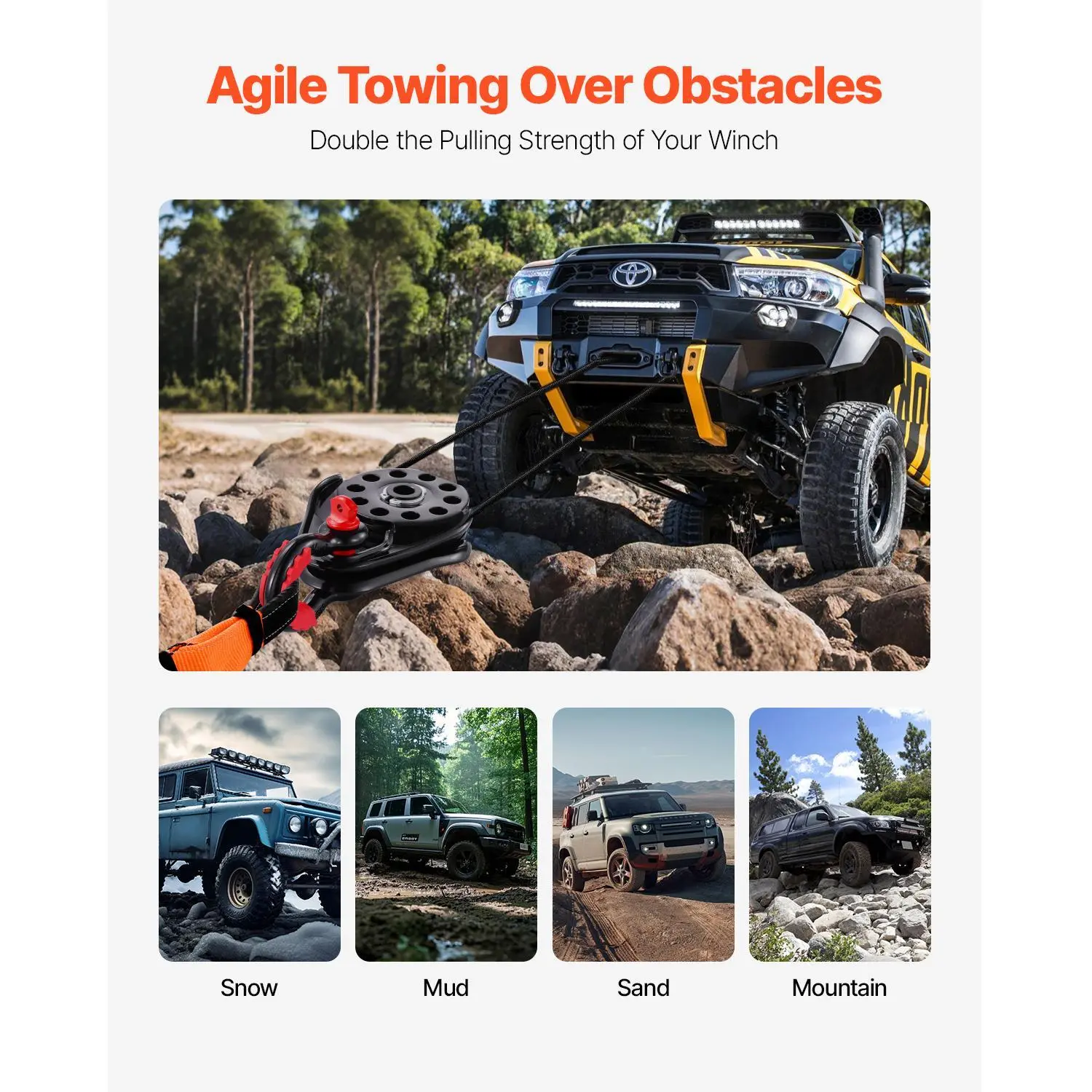 • Double Pulling Power: Doubling the winch's pulling power, this winch pulley reduces strain on your winch and maximizes its strength. Change the direction of the force with ease, making it simple to get your vehicle unstuck from tough terrains like snow, mud, sand, and ice.