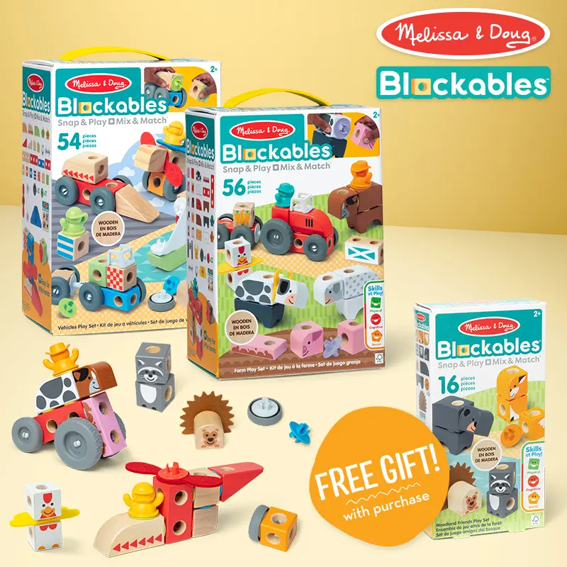 Melissa & Doug Blockables™ are connectable, stackable, and playable! The solid wood connect-and-play building blocks are perfect manipulatives to help preschoolers two and older boost developmental skills (fine motor, problem-solving, matching, storytelling, and self-esteem), while using their imaginations and having fun.