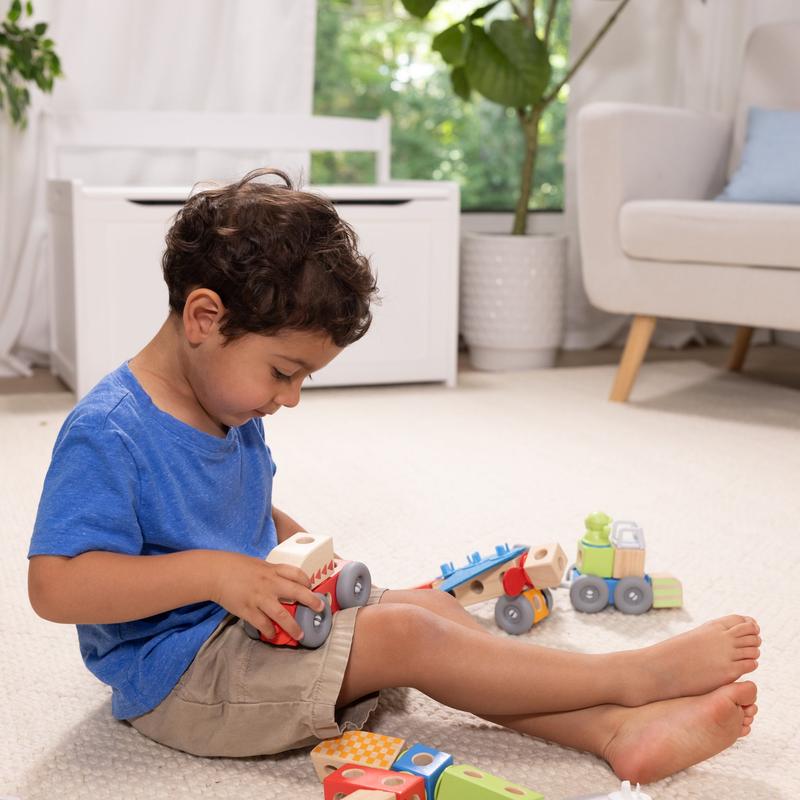 Easy-to-grasp smooth, colorful wooden blocks fit together in a snap with large connectors that even little hands can push in and pull out.