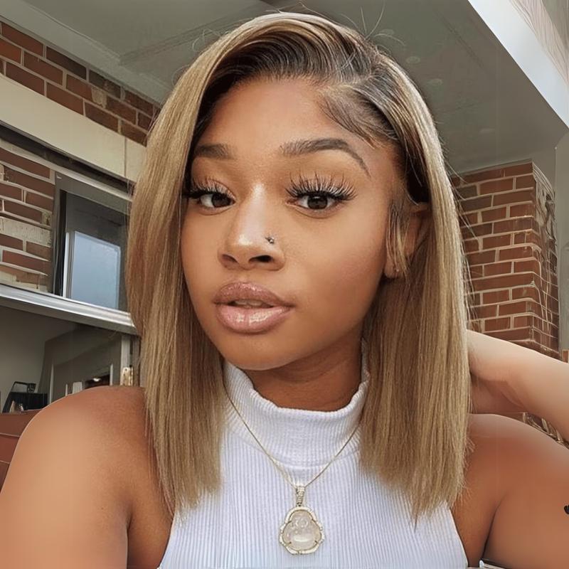 Sunber Blonde with Brown Roots Side Part Blunt Short Bob Wigs 7x5 Glueless Human Hair Wigs Straight Shoulder length Pre Cut Lace Invisible Knots Front Wigs Put on and Go