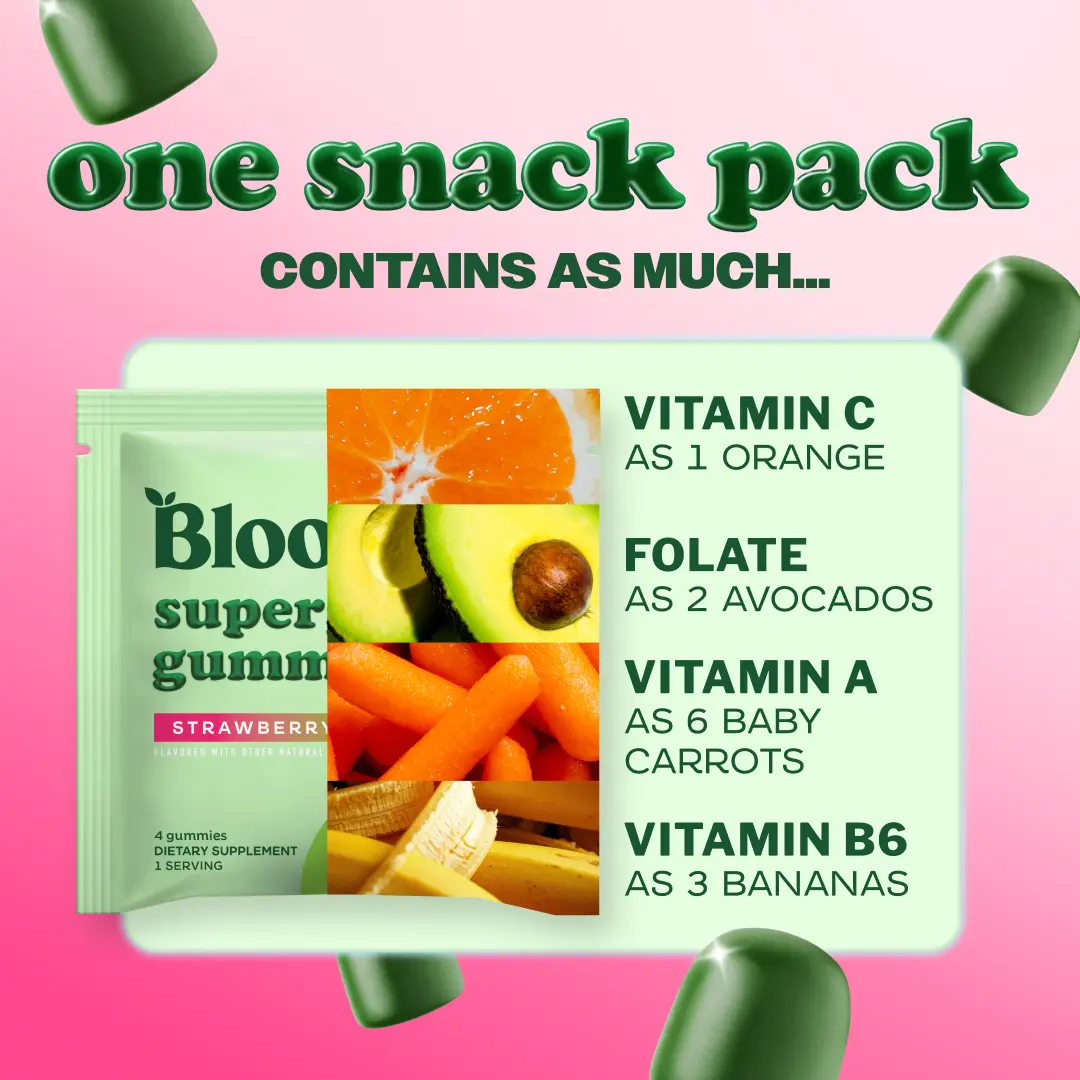 No scooping, mixing, or shaking — just pop, chew, and enjoy! With a naturally fruity flavor, Bloom Supergreens Gummies make sticking to your wellness routine effortless and enjoyable.