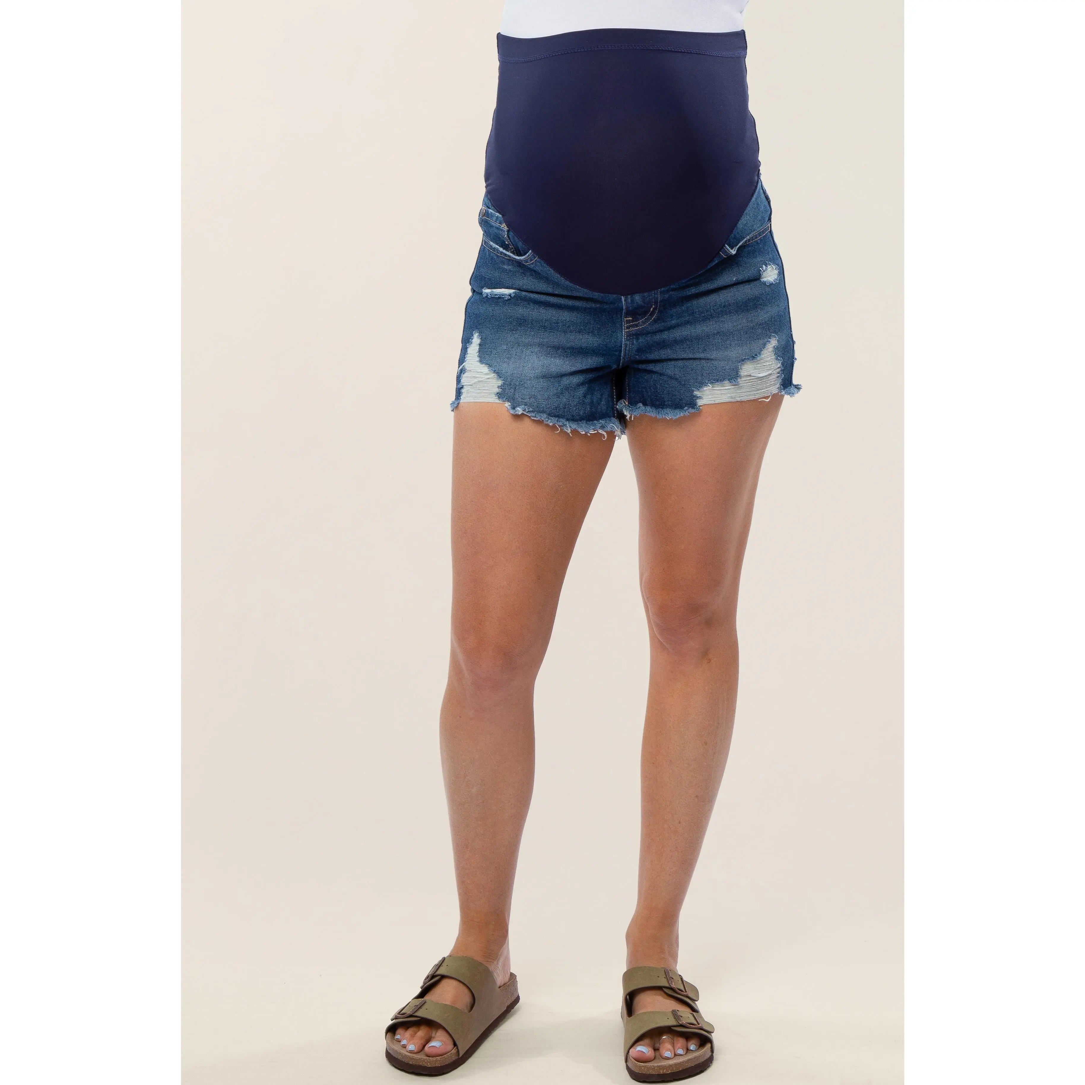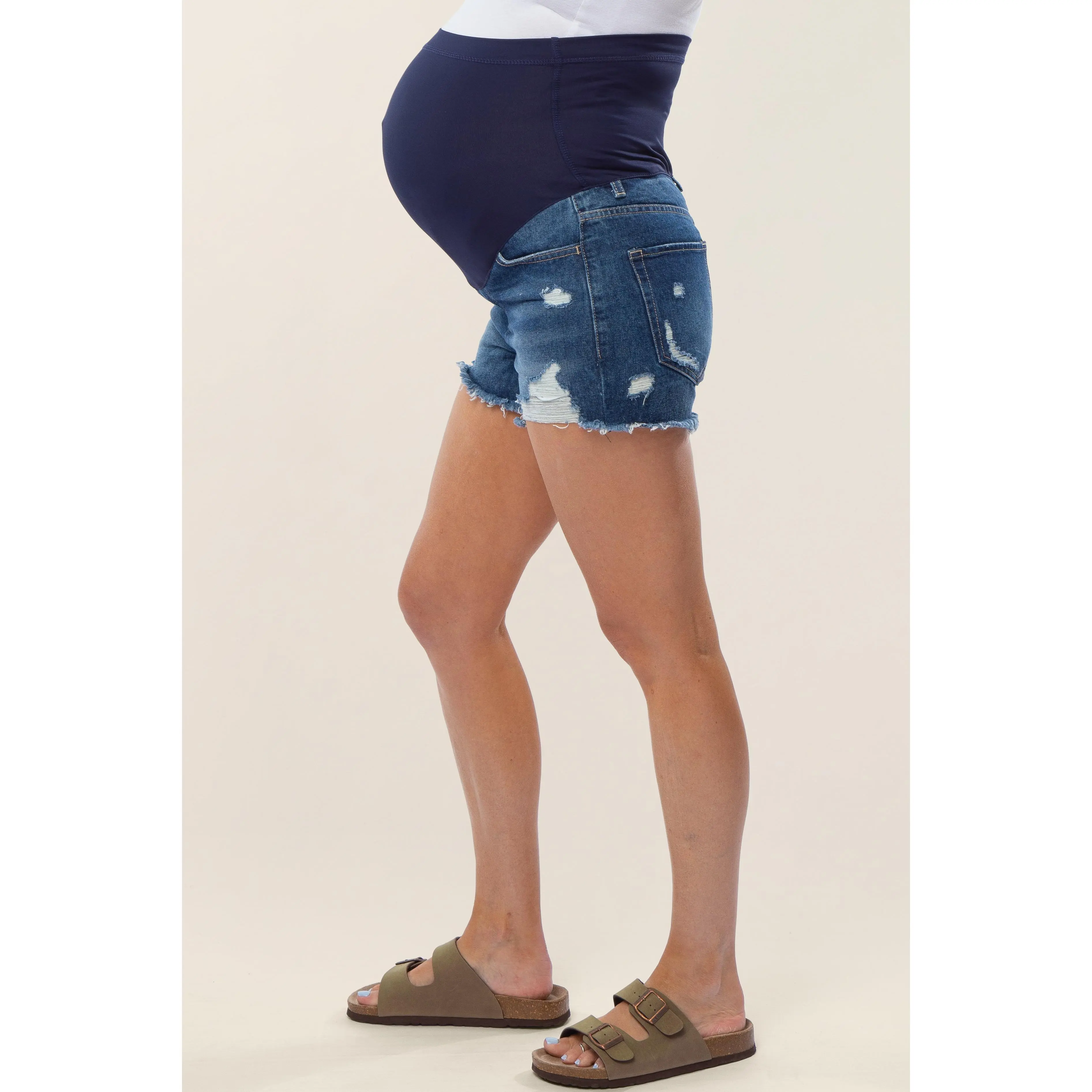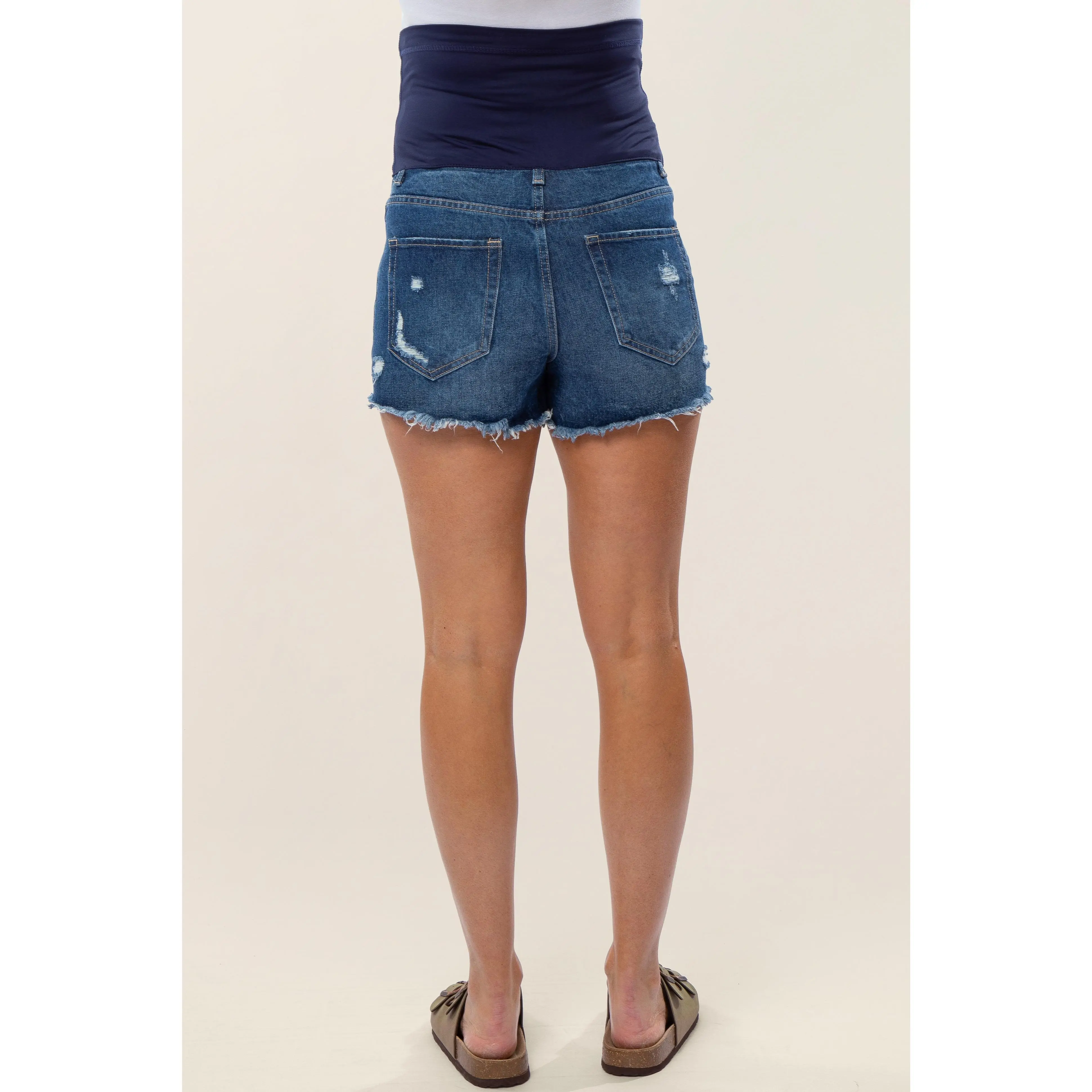 A pair of maternity jean shorts with five pockets, heavy distressing and a full panel belly band. Material has no stretch.