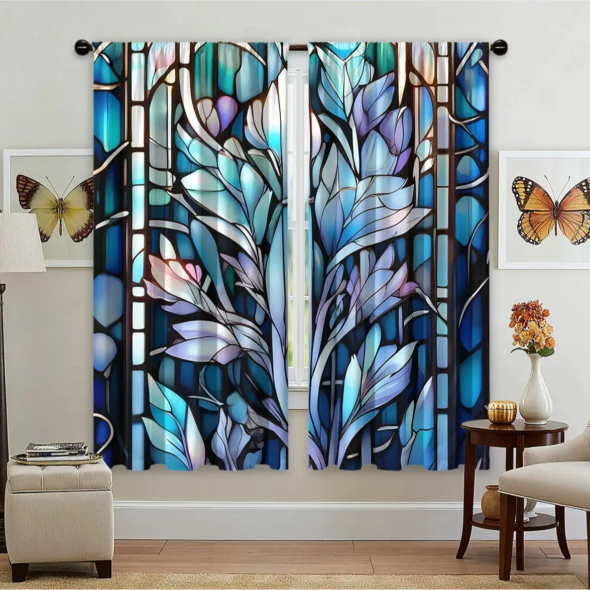 2pcs Blue Leaf Pattern Curtains with Art Texture Print, Easy Clean Polyester Blackout Material for Living Room & Vintage Decor, Window Curtain