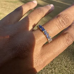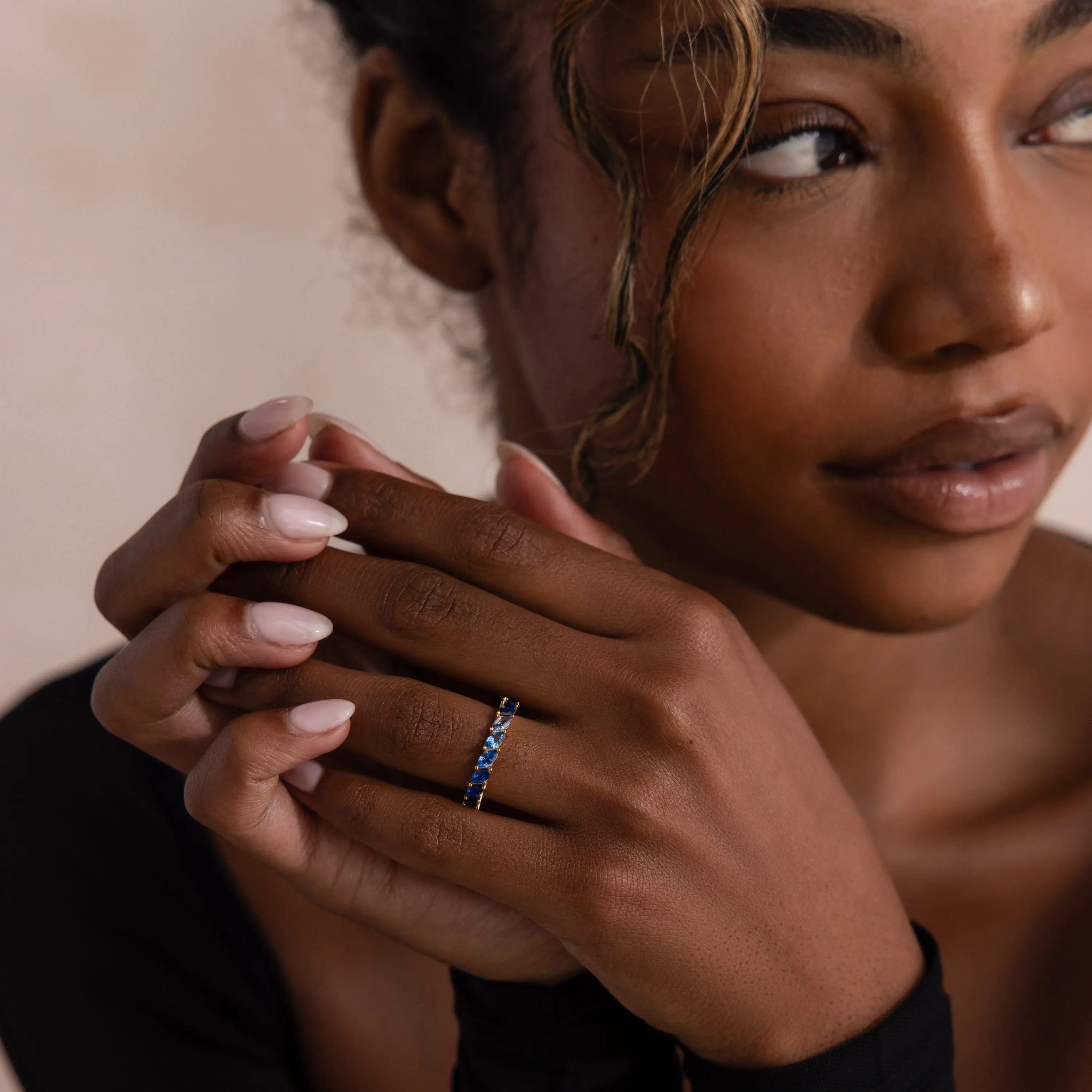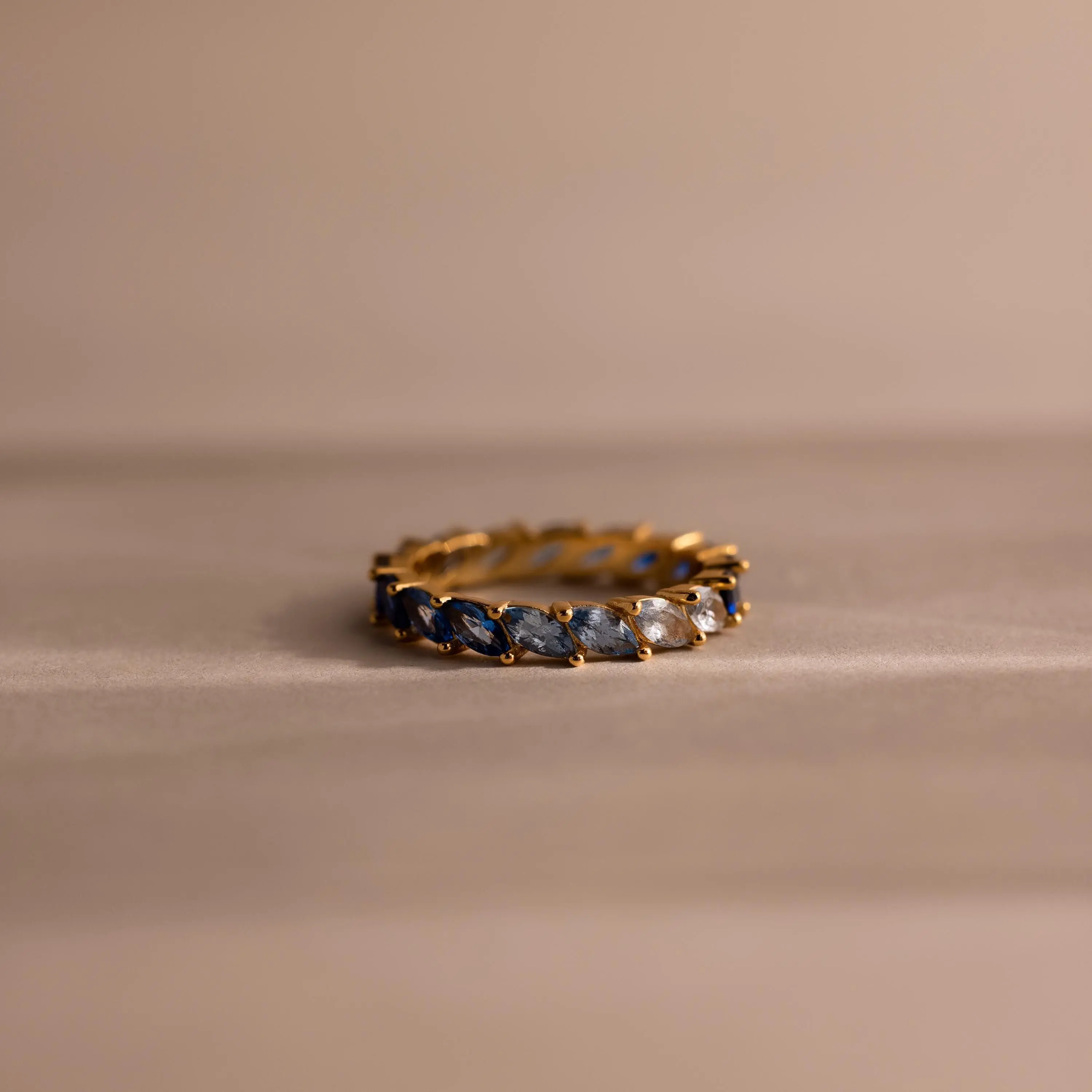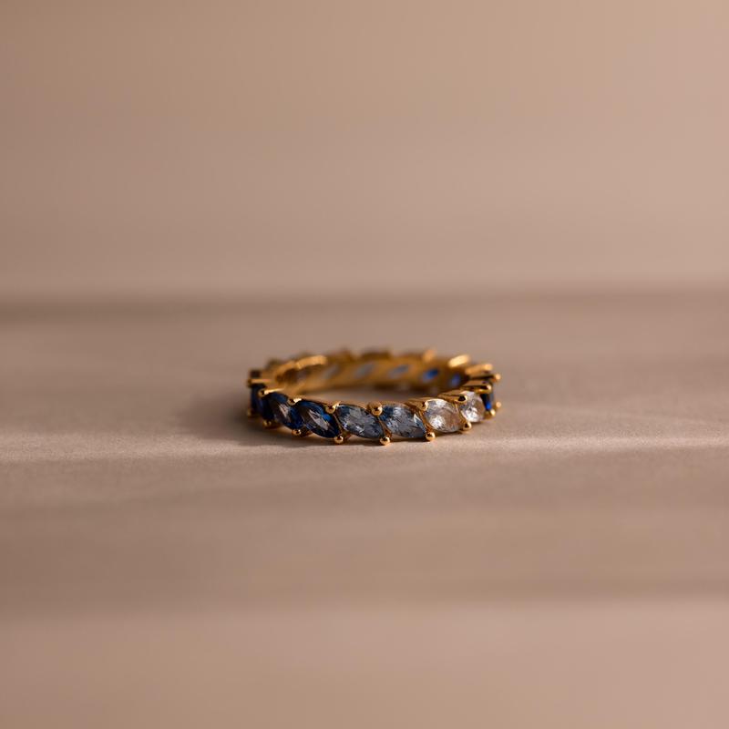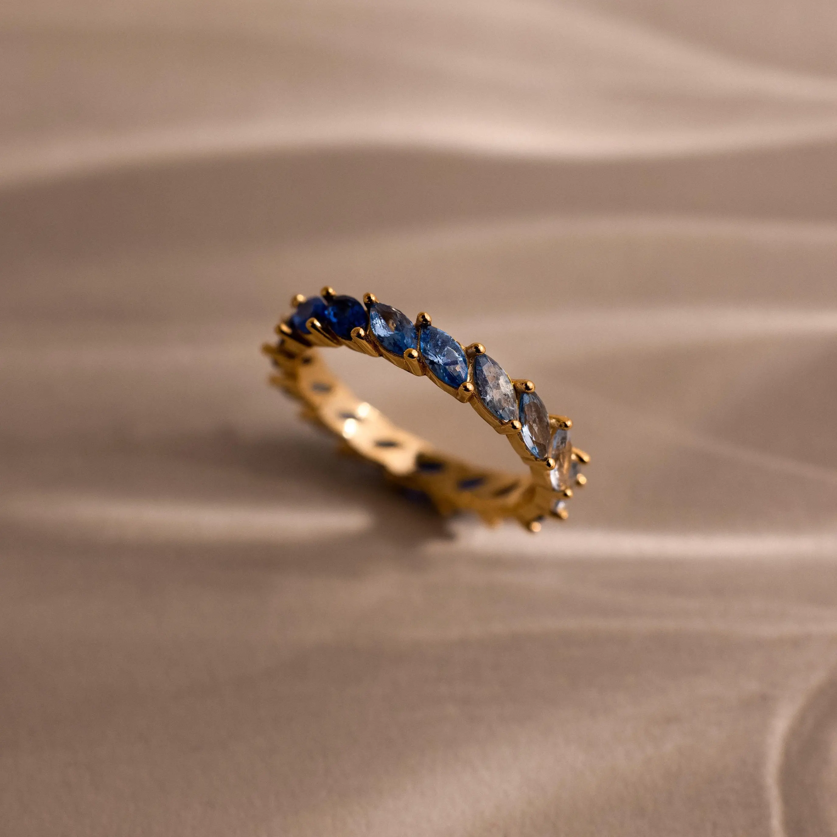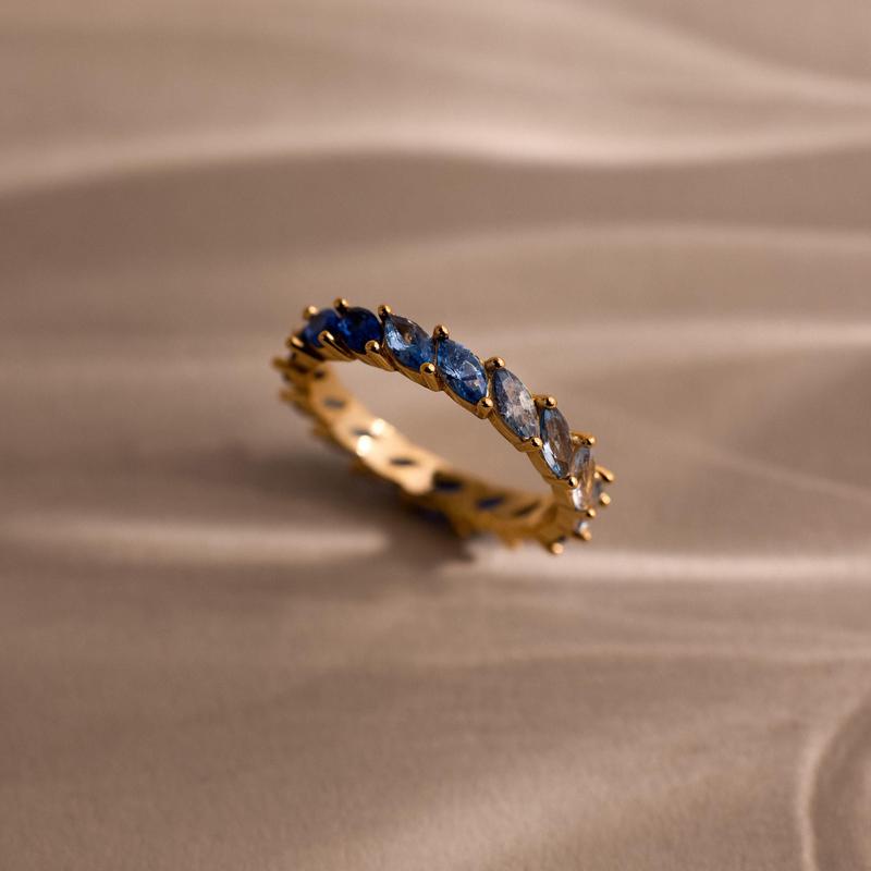 A wave of cool tones wraps around your finger with our Blue Marquise Ombre Ring. From deep sapphire to icy aqua, the ombré gradient shifts like ocean tides, set in a delicate gold vermeil band for a luxe finish. The color flow makes it a perfect match for coastal outfits or elevated everyday wear ♡