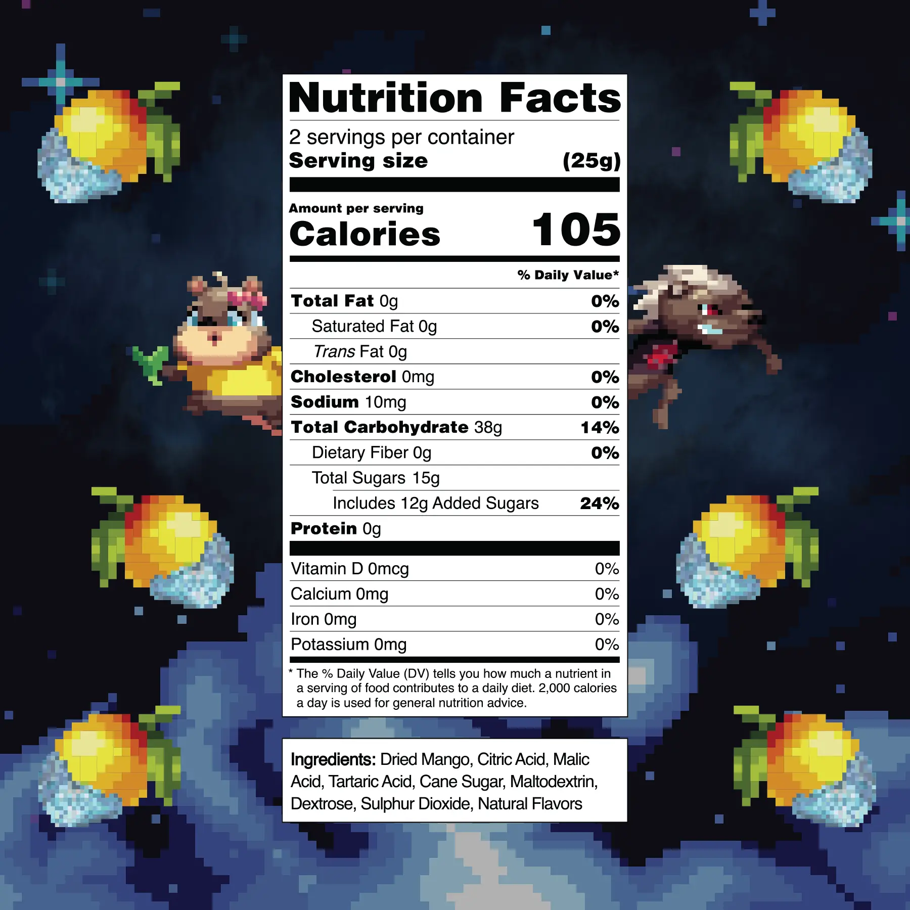 The pack came with dehydrated mango. (5pc). The powder was a good amount of sour! Pairing the dry fruit with sour candy is a good idea! My kids liked it as well!