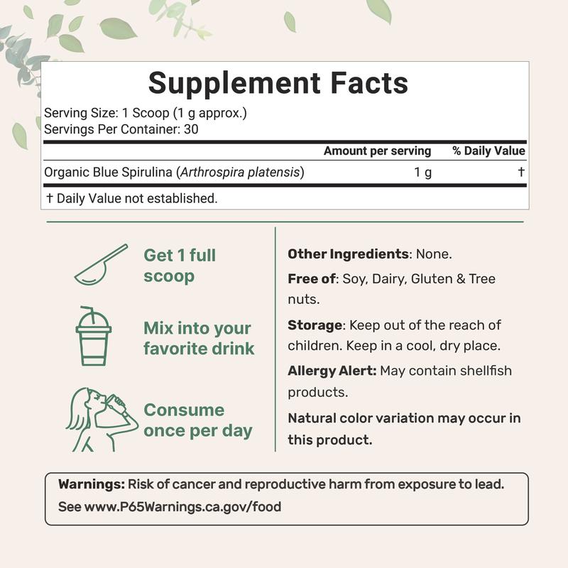 ·Comes from an authentic Arthrospira Platensis extract that contains vegan protein, vitamins, minerals, antioxidants, and much more. Adds beautiful blue color to any dish and is packed with essential nutrients that may support immune and brain health, as well as energy levels and complexion.