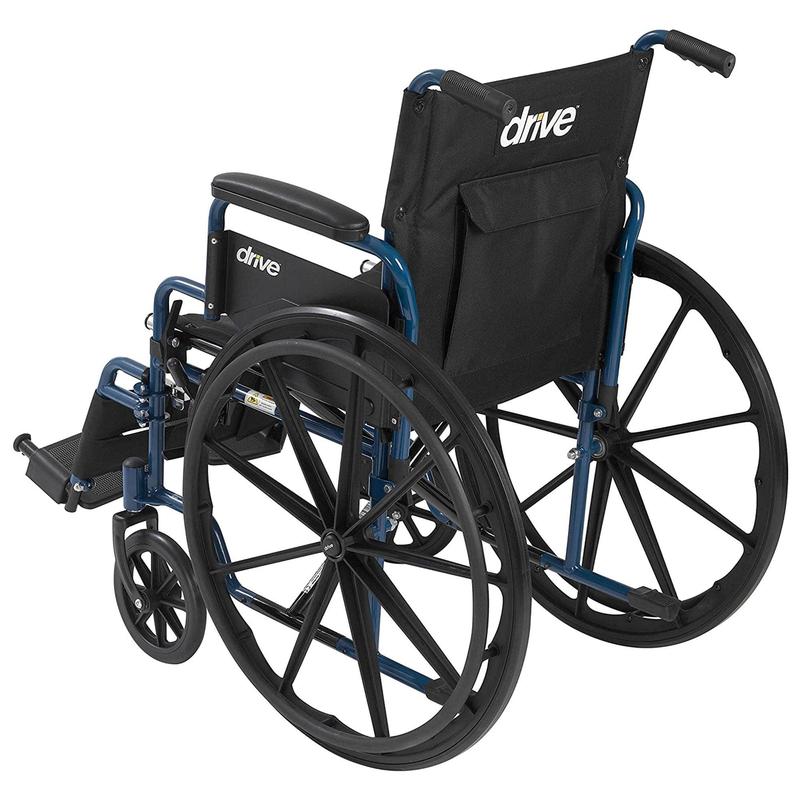 As a mobility aid user, you need a wheelchair that not only keeps you safe but also keeps you comfortable during day-to-day activities. The Blue Streak Wheelchair from Drive Medical features dependable construction and quality materials that do just that.This wheelchair is designed with flip-back armrests and swing-away footrests to not only make getting in and out of the chair easy, but also give you controllable comfort. For elderly users with weak legs, the attached calf straps allow you to fully relax your legs without your feet slipping off. The wheelchair's nylon-padded seat measures 20 inches wide, giving you more room to spread out and relax while sitting. Solid rubber tires enhanced with push-to-lock functionality and mounted on composite wheels provide durability and low maintenance that you can depend on for years to come. The lightweight foldable design makes storage and transportation a breeze! It folds in seconds and is light enough to easily place in the trunk when you're on the go. The powder-coated steel frame and nylon upholstery stay are simple to clean. Invest in the wheelchair you know is going to support you for years to come with the Blue Streak Wheelchair from Drive Medical.