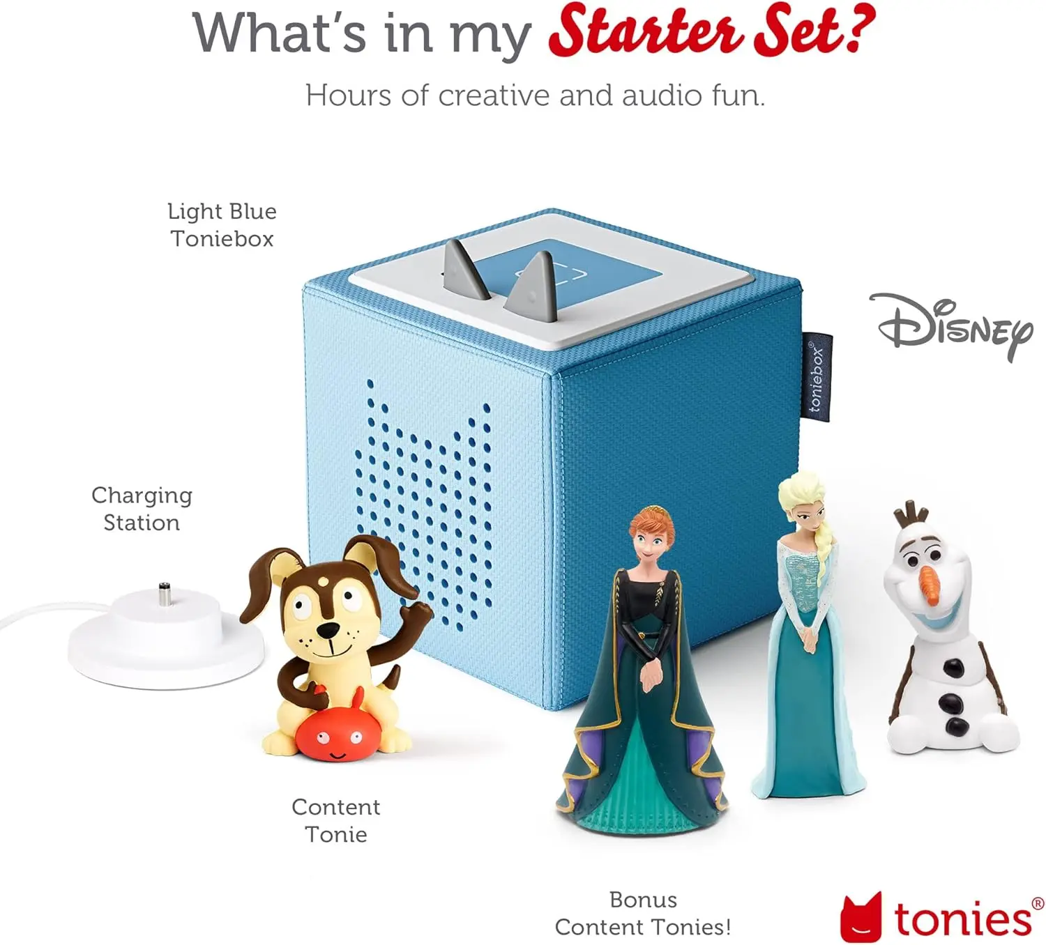 ·Bundle includes a light blue Toniebox 1, charging station, Elsa, Anna, Olaf, and Playtime Puppy Tonies.
