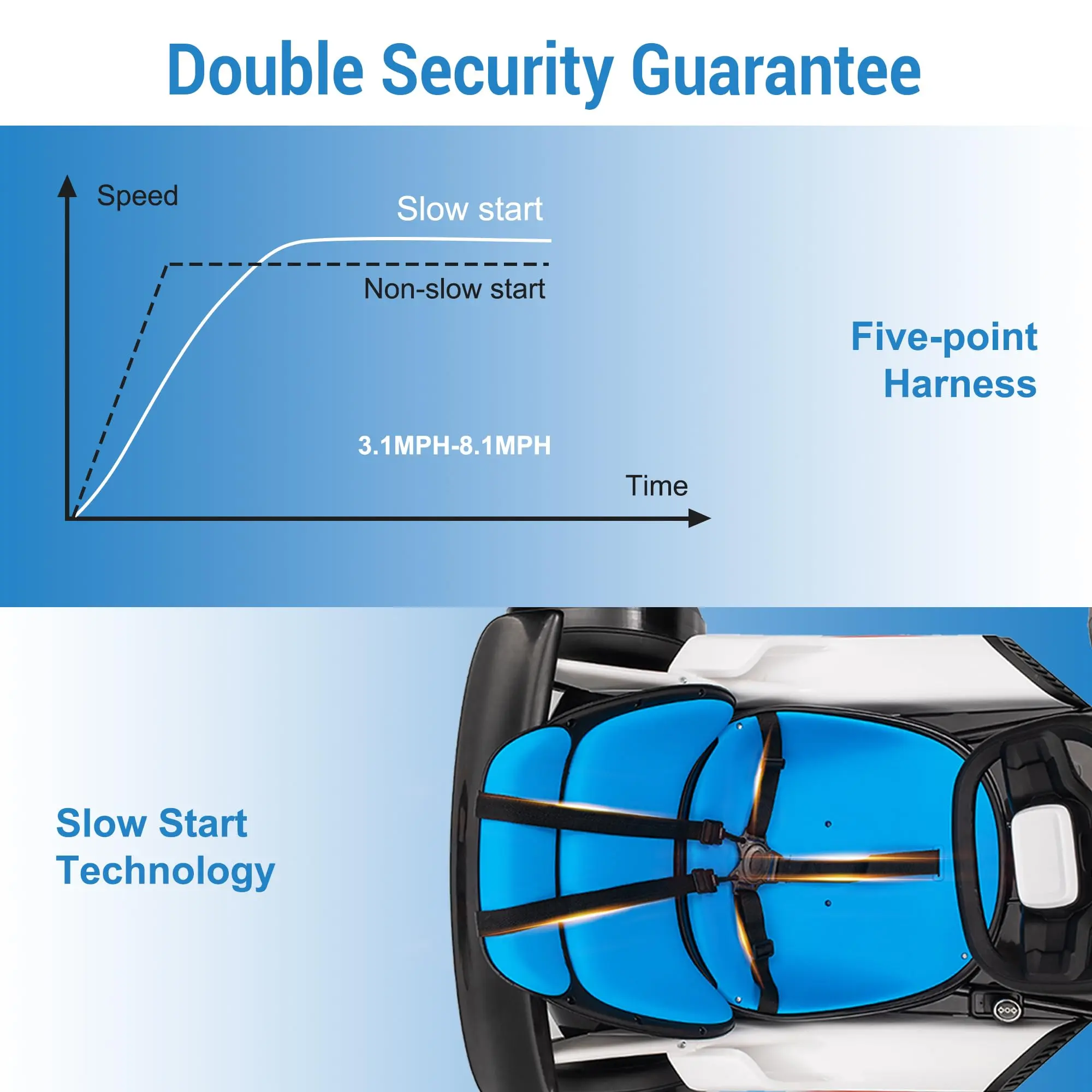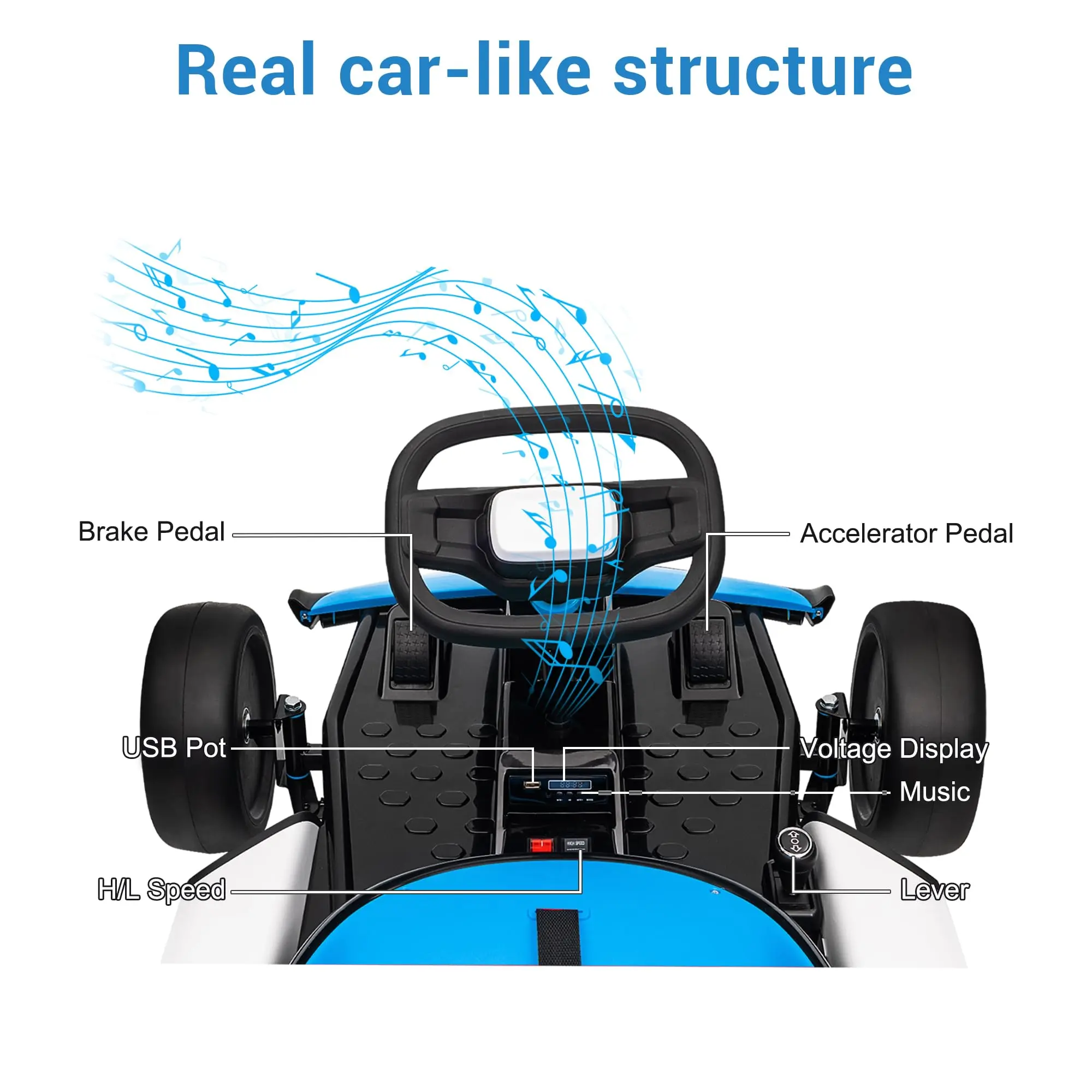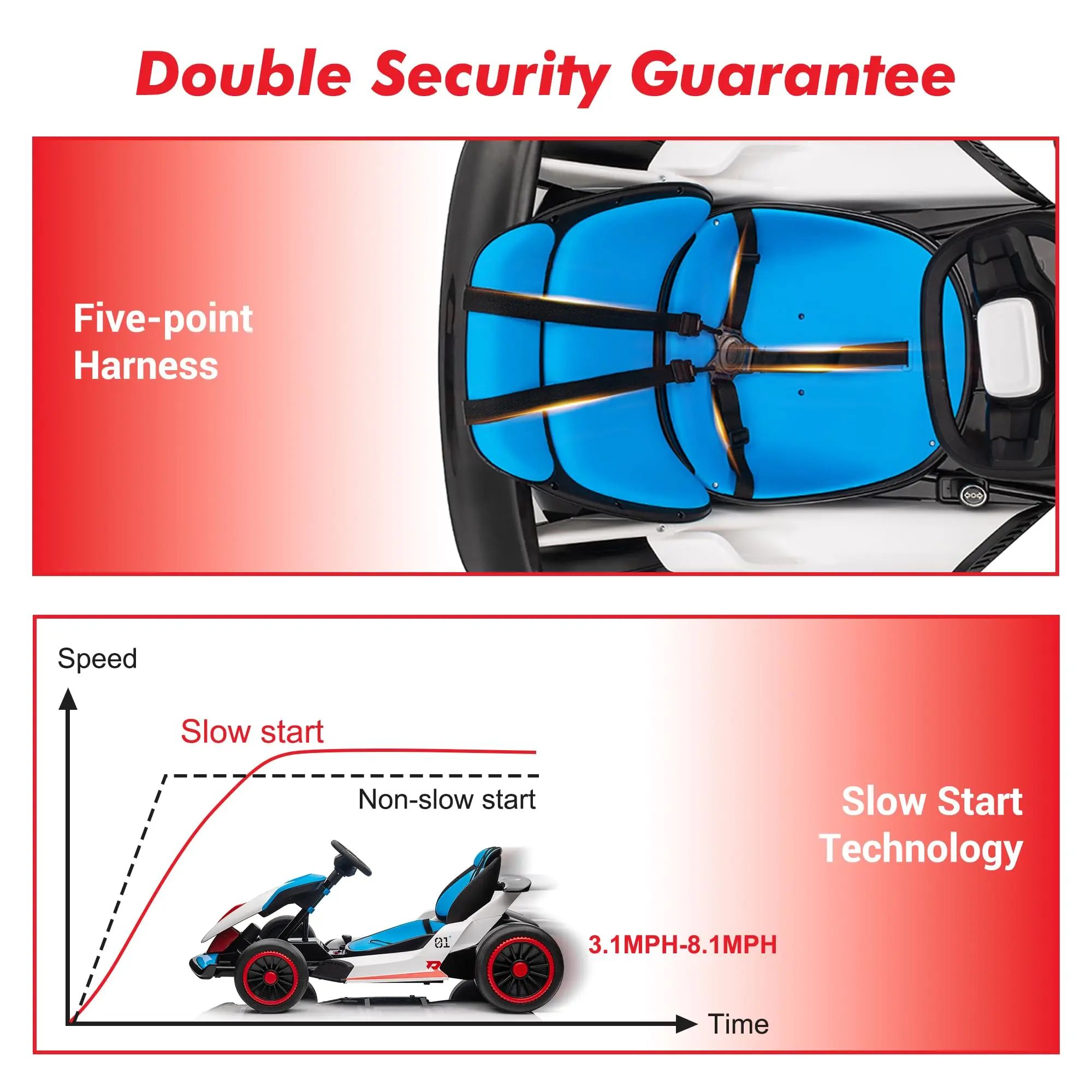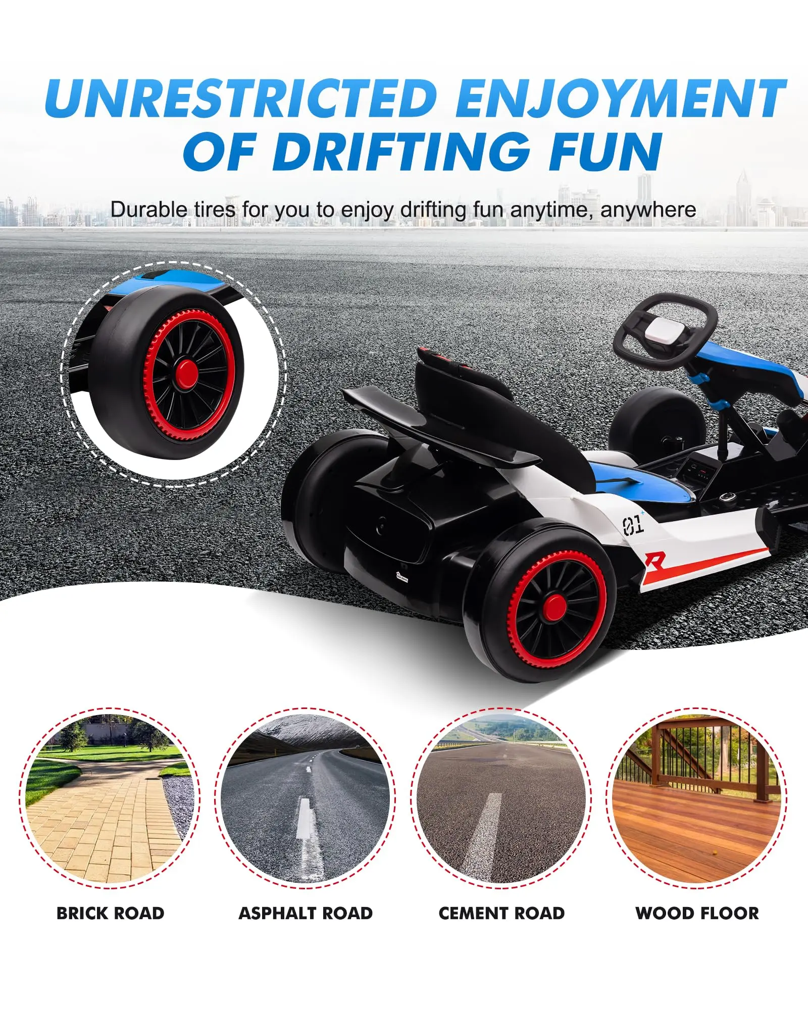 Safety First Drift Experience - Designed with dual pedals for easy control, the gas pedal lets kids accelerate, while the brake pedal stops them instantly, ensuring safe and enjoyable driving. The kart also features a slow-start function and a seatbelt for added safety. EVA front tires and larger nylon rear tires provide excellent drifting performance.