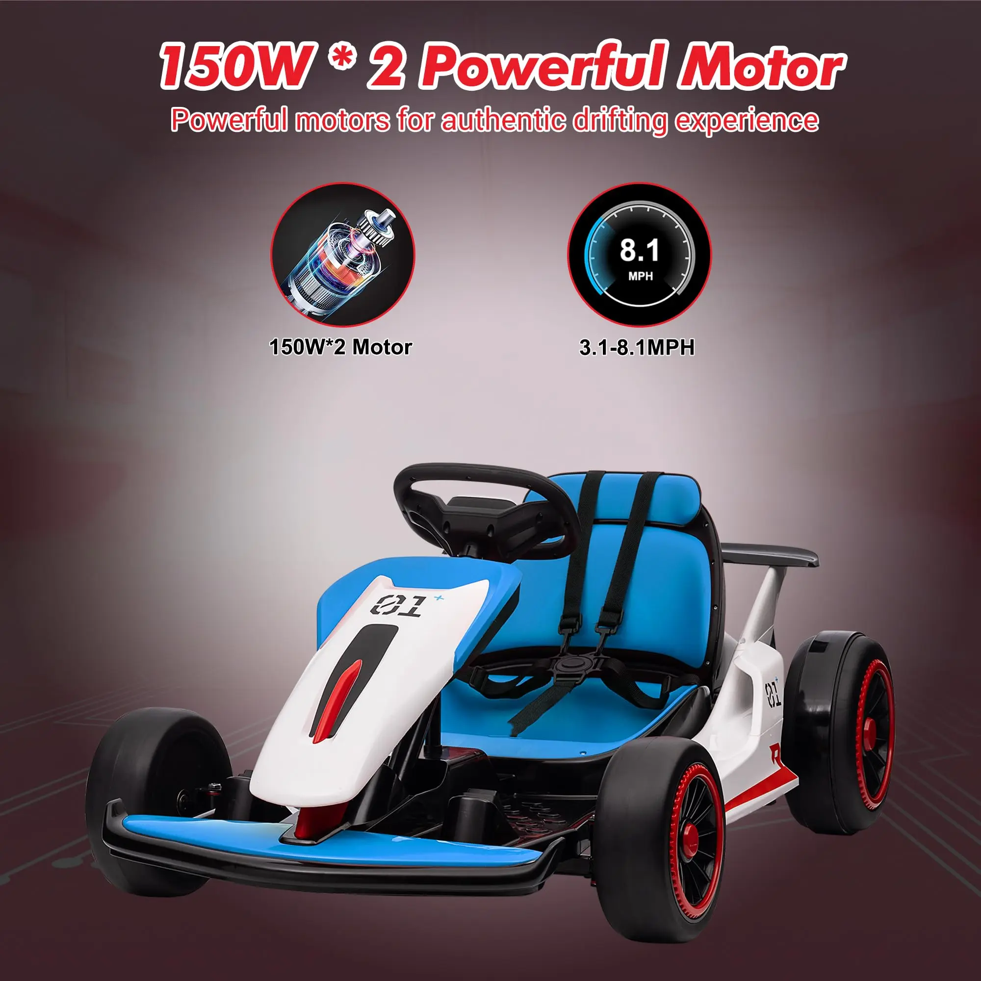 High-Speed Drift Go Kart - Experience the thrill of speed with dual 200-watt motors that offer two speed settings ranging from 6.2 to 8.1 MPH. The high/low speed switch lets kids choose the perfect pace, providing an exciting ride for young racers.