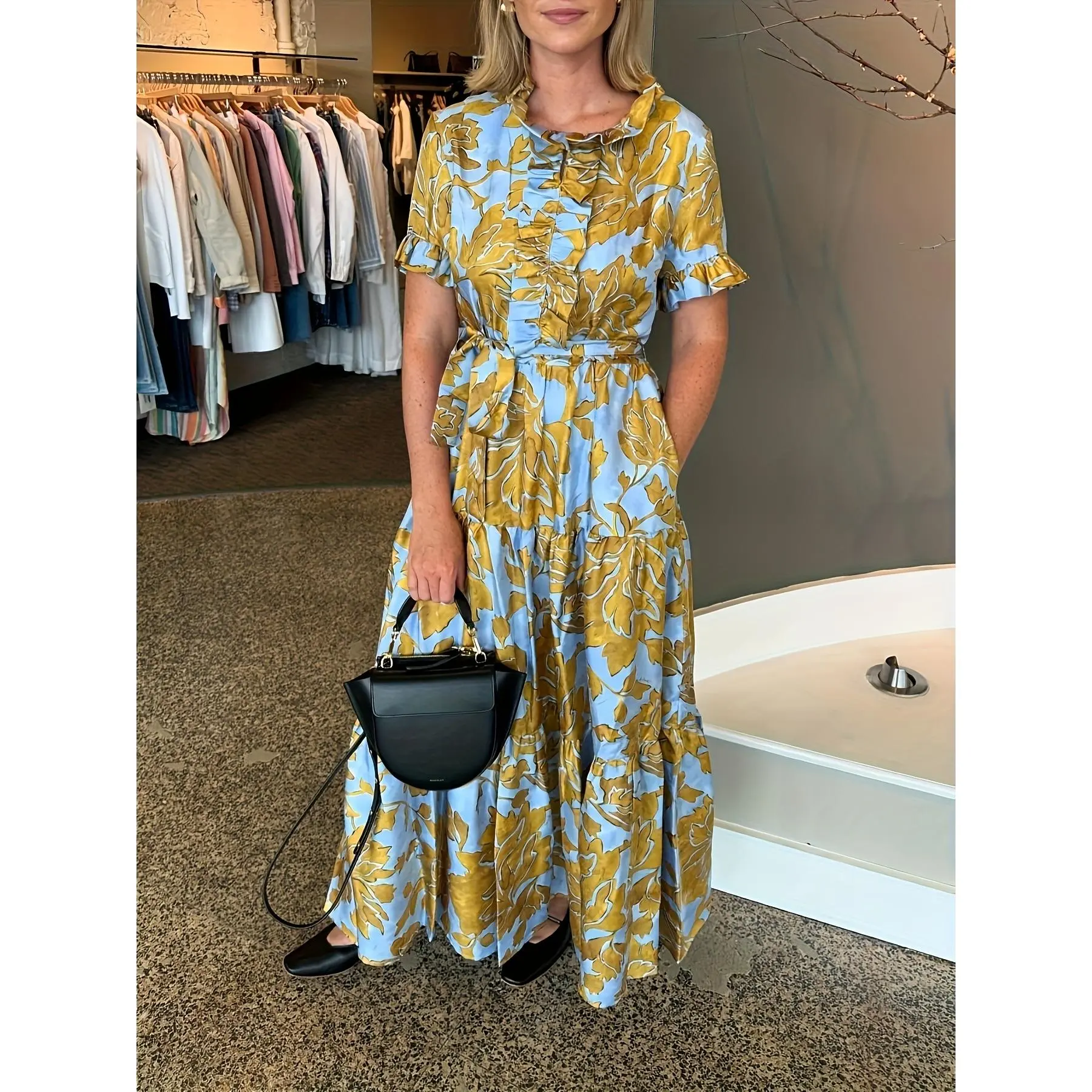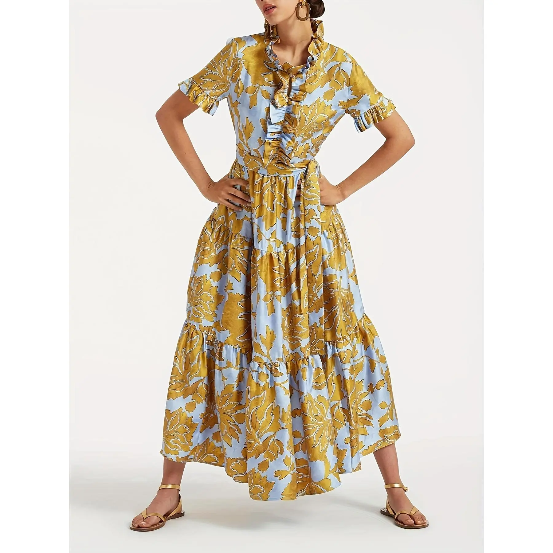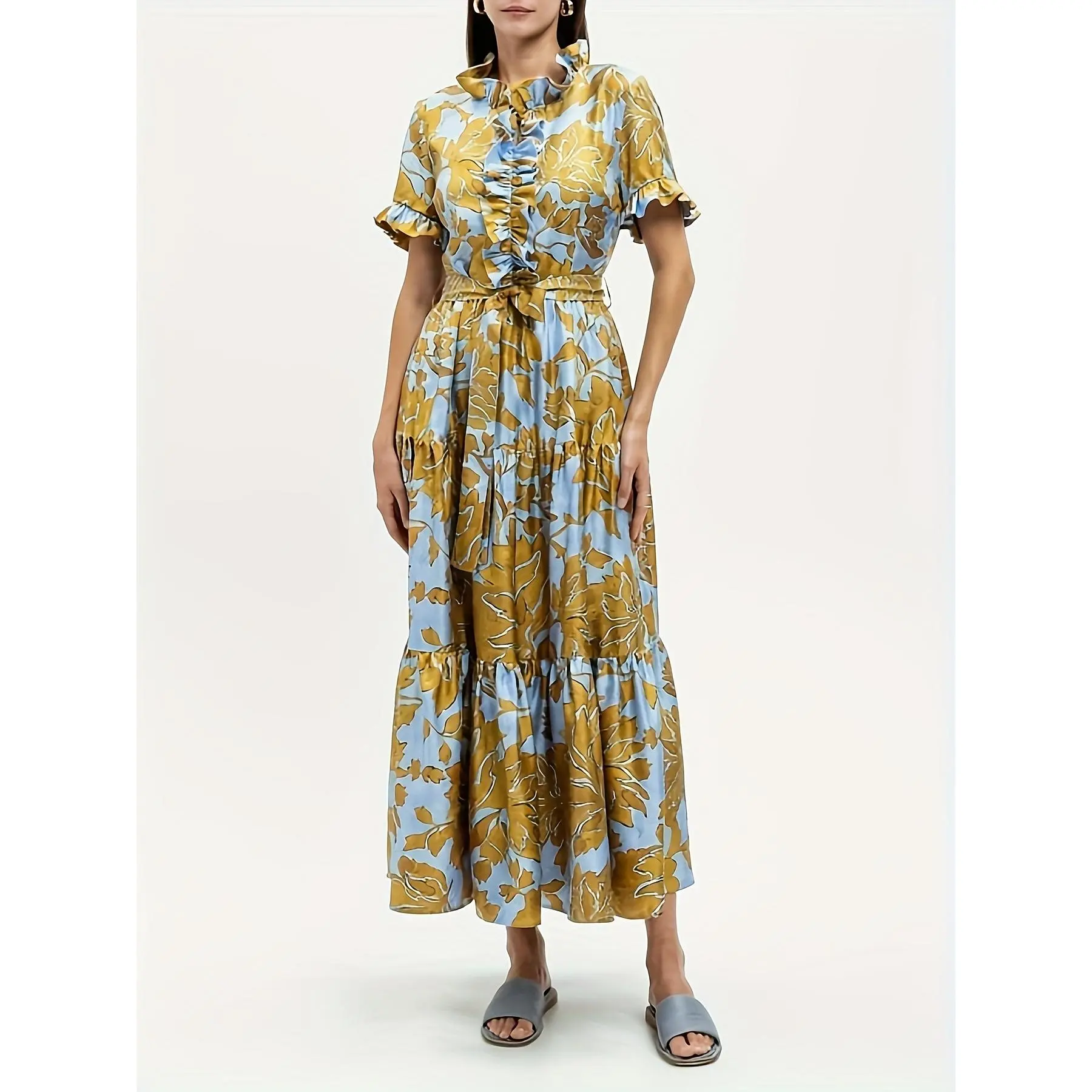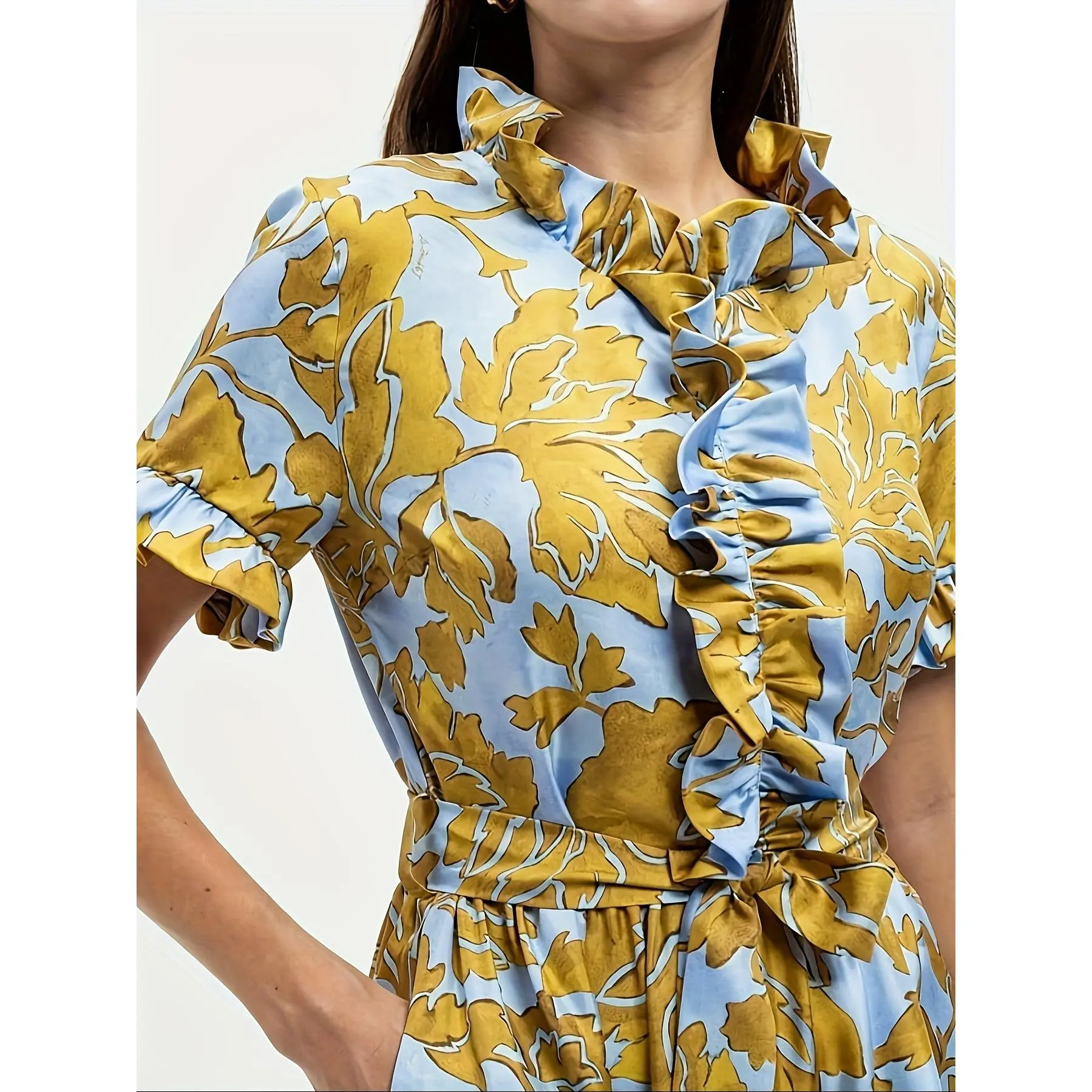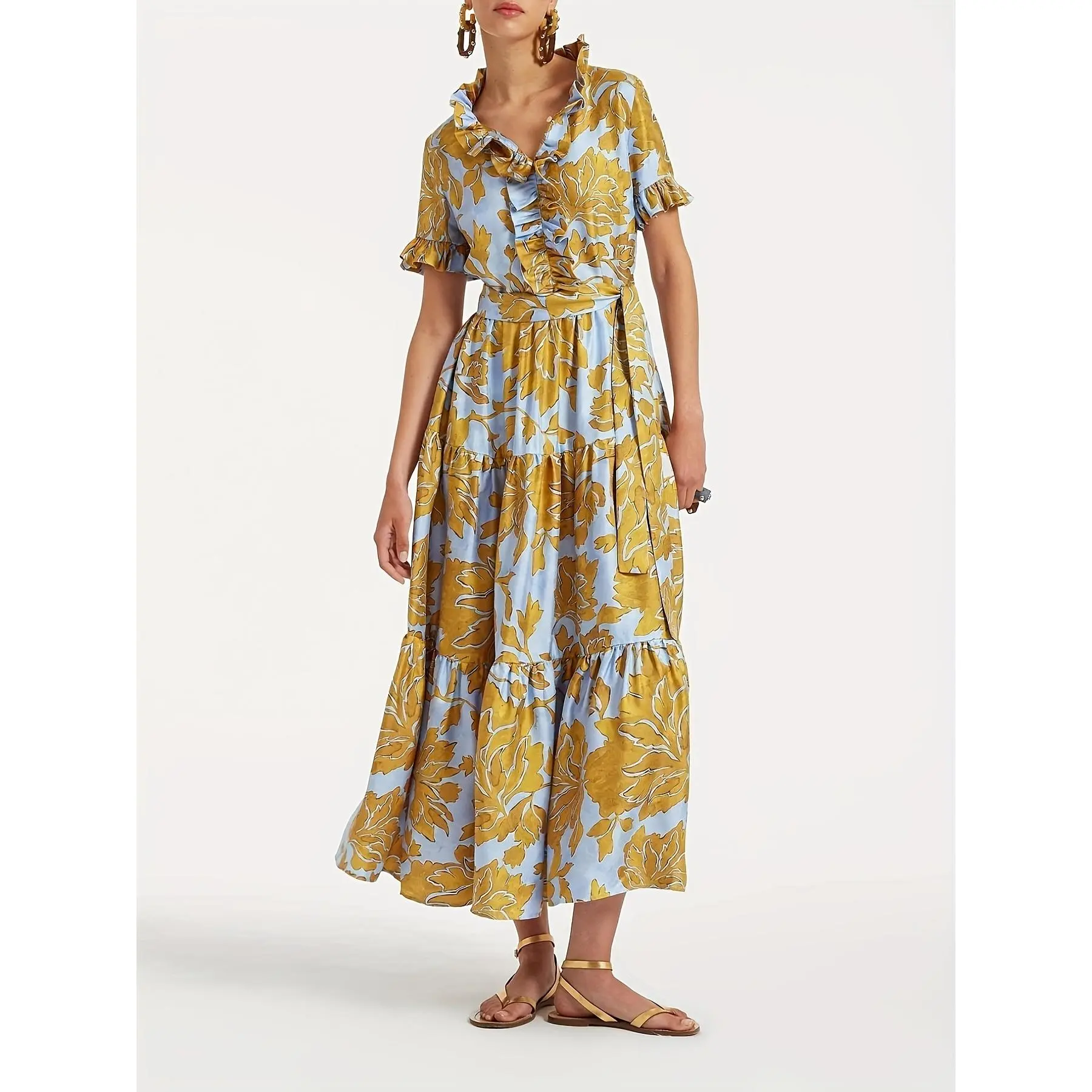 Features a fresh blue and yellow floral print that creates a feminine and eye-catching look — perfect for spring and summer outings, vacation photos, and lifestyle content.
