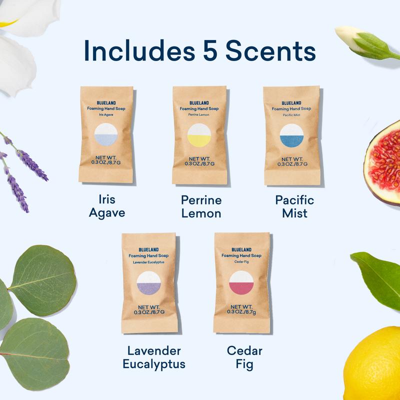 This set includes one refillable glass bottle and either 3 or 5 refill tablets in a variety of scents, including Classic Variety (Iris Agave, Perrine Lemon, Lavender Eucalyptus, Pacific Mist, & Cedar Fig) or Fragrance-Free. Each tablet makes one full bottle of hand soap.