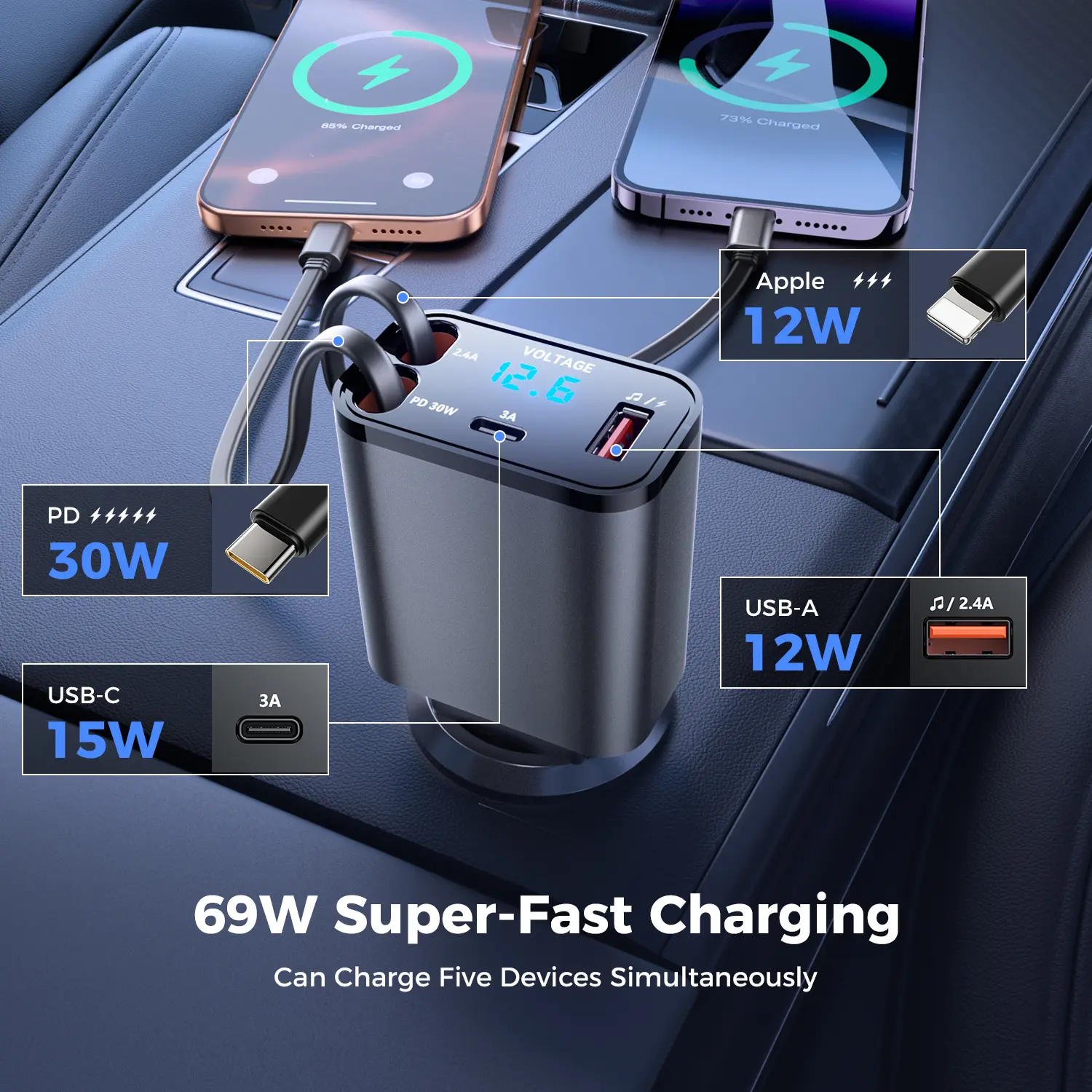 ⚡ Convenient Charging: The retractable cables make it easy to charge multiple devices simultaneously, enhancing convenience during your drive.