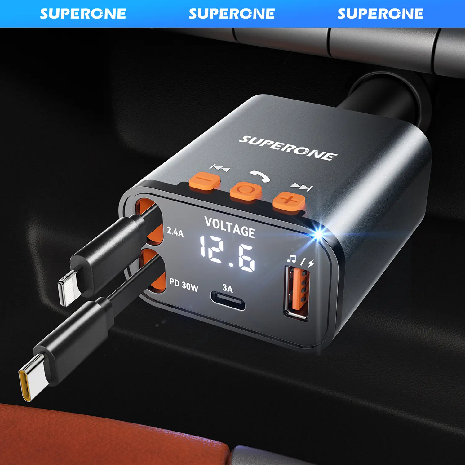 Tired of juggling chargers and tangled cords during your drives? The SUPERONE Bluetooth 5.3 Car Adapter is here to simplify your ride. This tiny powerhouse plugs right into your car’s 12-24V socket, delivering fast and stable Bluetooth 5.3 connectivity for crystal-clear calls and Hi-Fi music streaming enhanced by CVC noise suppression technology. Its retractable charger cables include PD USB-C and Apple connectors, so you can easily charge multiple devices without the mess. With four blazing-fast charging ports (up to 69W total), your phone, tablet, smartwatch, and more stay powered up on the go. The bright LED display keeps you updated on connection status and charging info, while the FM transmitter lets you stream music directly to your car stereo. Compatible with a wide range of devices—from iPhones and Android phones to Nintendo Switch and DJI drones—this adapter is perfect for cars, trucks, SUVs, and RVs alike. Included in the box is the SUPERONE Bluetooth 5.3 Car Adapter with retractable charger cables. Upgrade your drive with convenience, sound quality, and power all in one compact gadget. Ready to transform your car experience? Plug in and play!