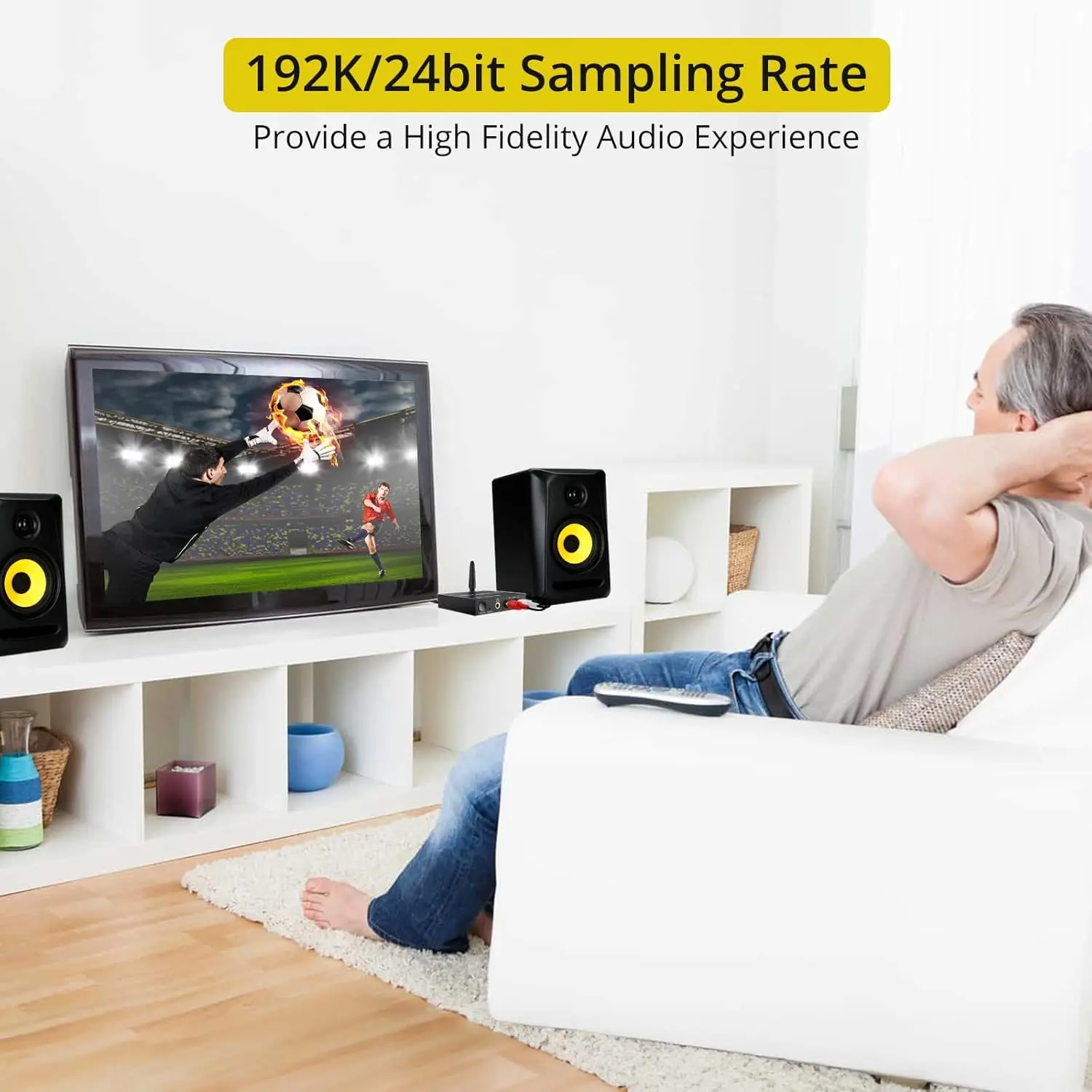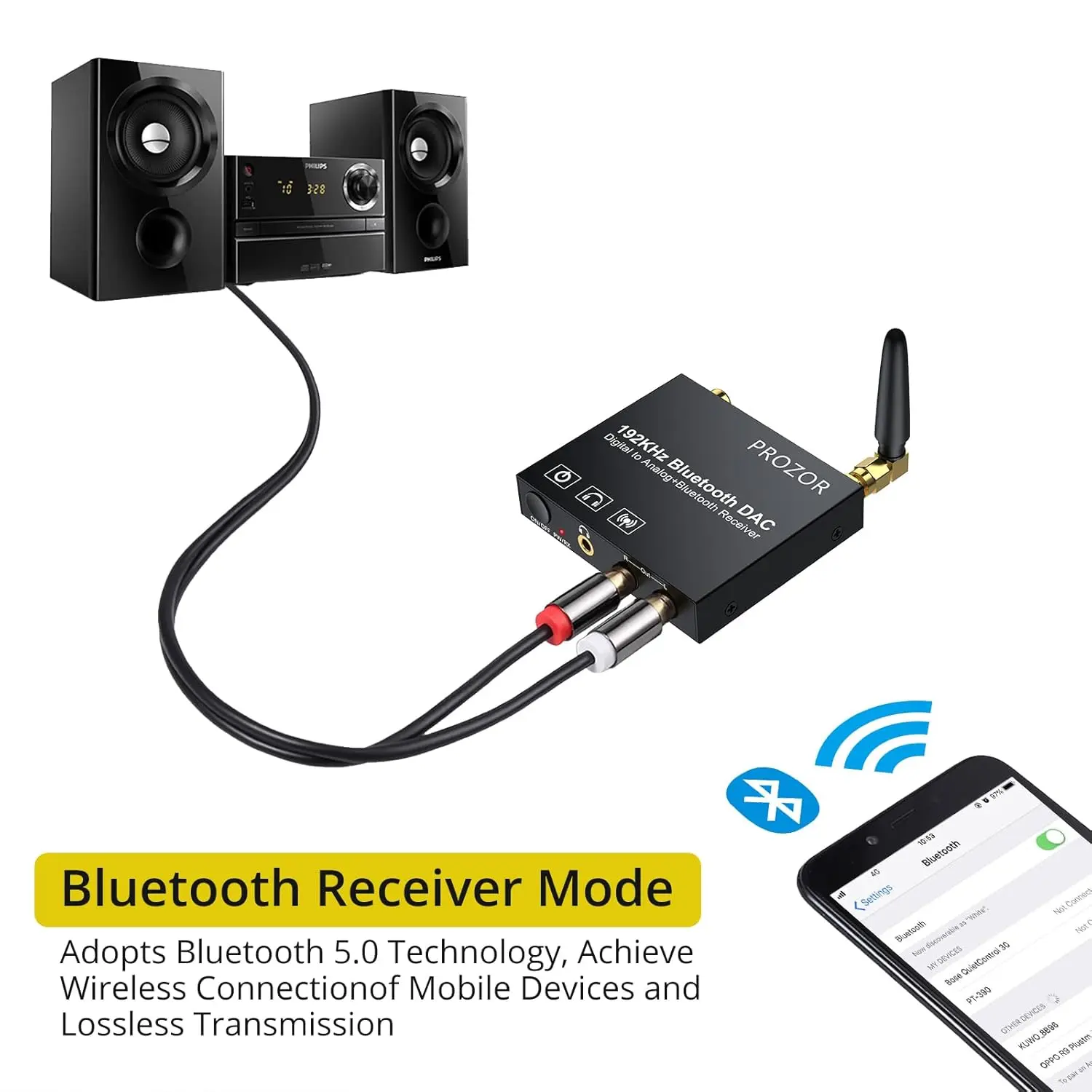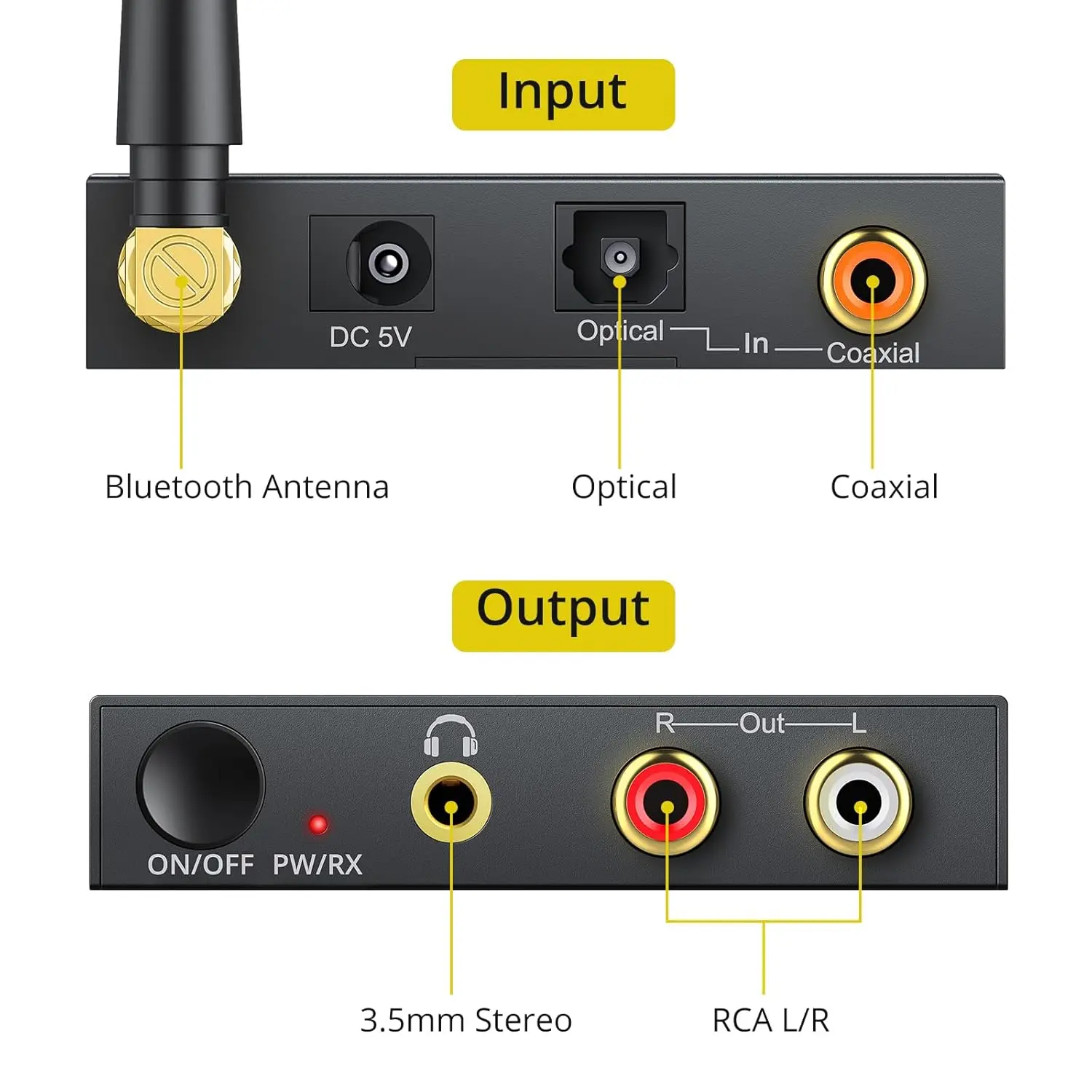 digital to analog converter supports optical coaxial bluetoothtransmitted digital audio signals into stereo rca u 35mm audio output when connecting modern devices to legacy amplifiersbluetooth audio adapter builtin bluetooth 50 receiver module and dualantenna design supports wireless connections to mobile devices through lossless transmission technology ensuring stable connectivity within a 5065ft 1520m indoor rangehigh performance builtin highperformance dac chip supports 192k24bit sampling rate adopts bluetooth dedicated antenna for stable signal transmission adopts personalized status indicatorpulgandplay automatically switch to bluetooth playback mode after successful bluetooth connection power onoff switch long press 3 seconds to turn off short press to turn onversatile application input one optical and one coaxial output one rca and one 35mm audio for home theater teaching training structure conference rooms appliance stores and other places