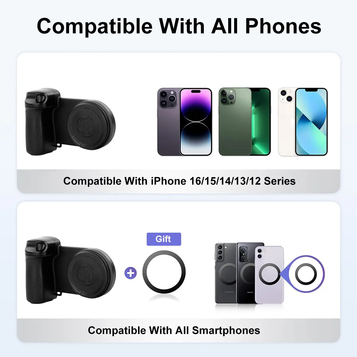 【Universal Compatibility】: Designed with a 1/4-inch screw and a metal ring, compatible with all smartphone models, ensuring broad usability.