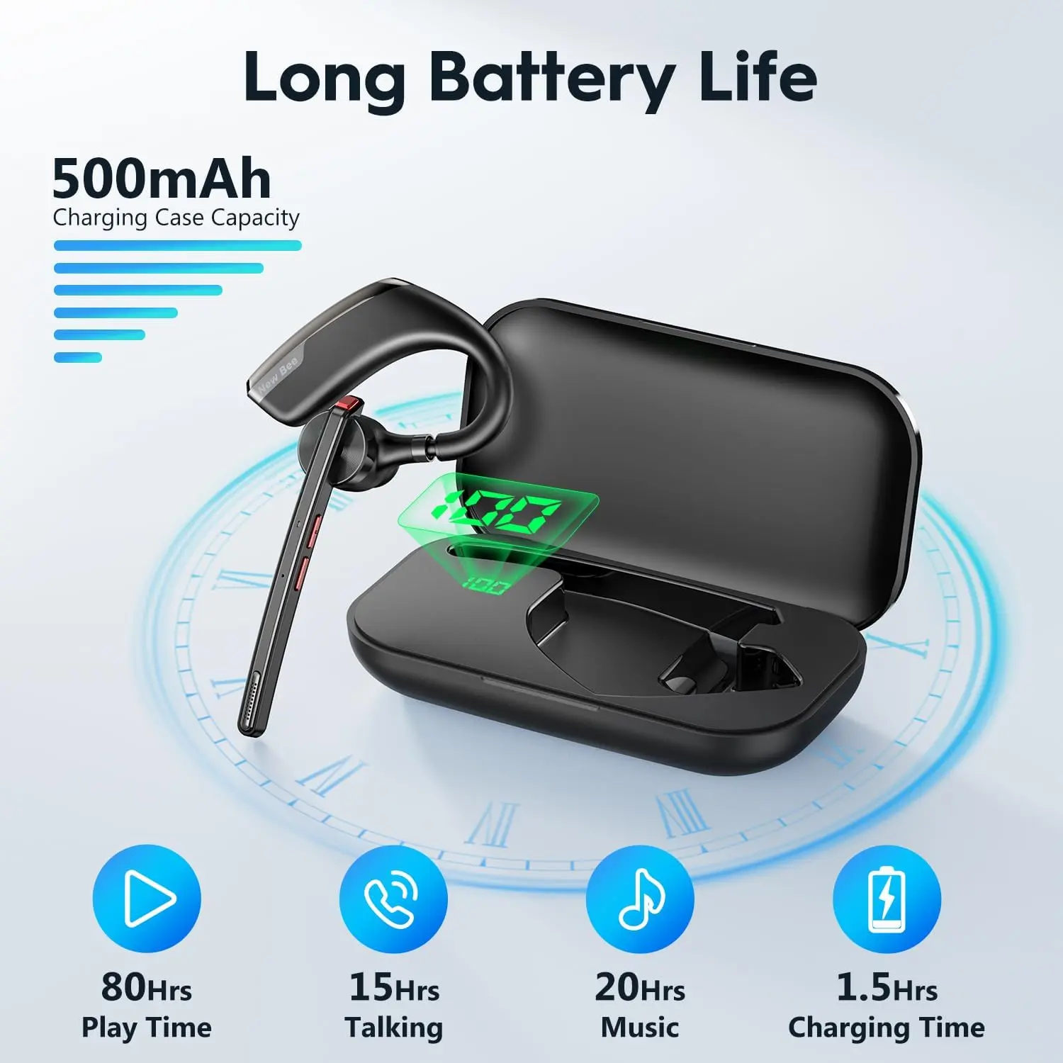 [Large Capacity Battery Support] Equipped with a 500mAh charging case, the New Bee m51 ensures nearly 80 hours of music/call time for your Bluetooth earpiece. The single headset offers 15-20 hours of usage time, providing flexibility for extended use. Choose between two charging methods to address any battery concerns.