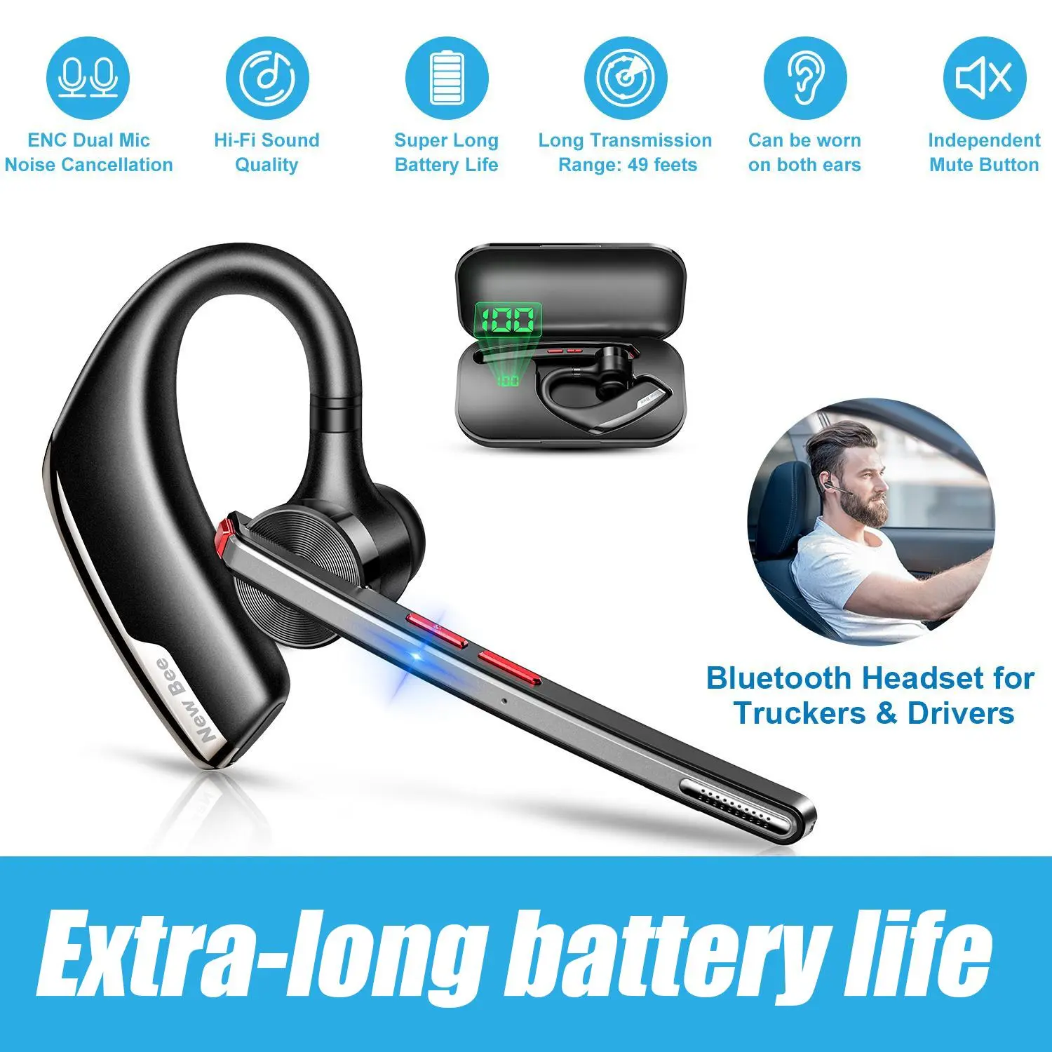[Newest 5.2 Bluetooth Technology] Stay connected seamlessly with the latest 5.2 Bluetooth technology of the New Bee wireless earpiece. Quickly and stably connect devices within a 15m range, with the convenience of dual connection to link two devices simultaneously. Compatible with iOS, Android, Windows, and more.