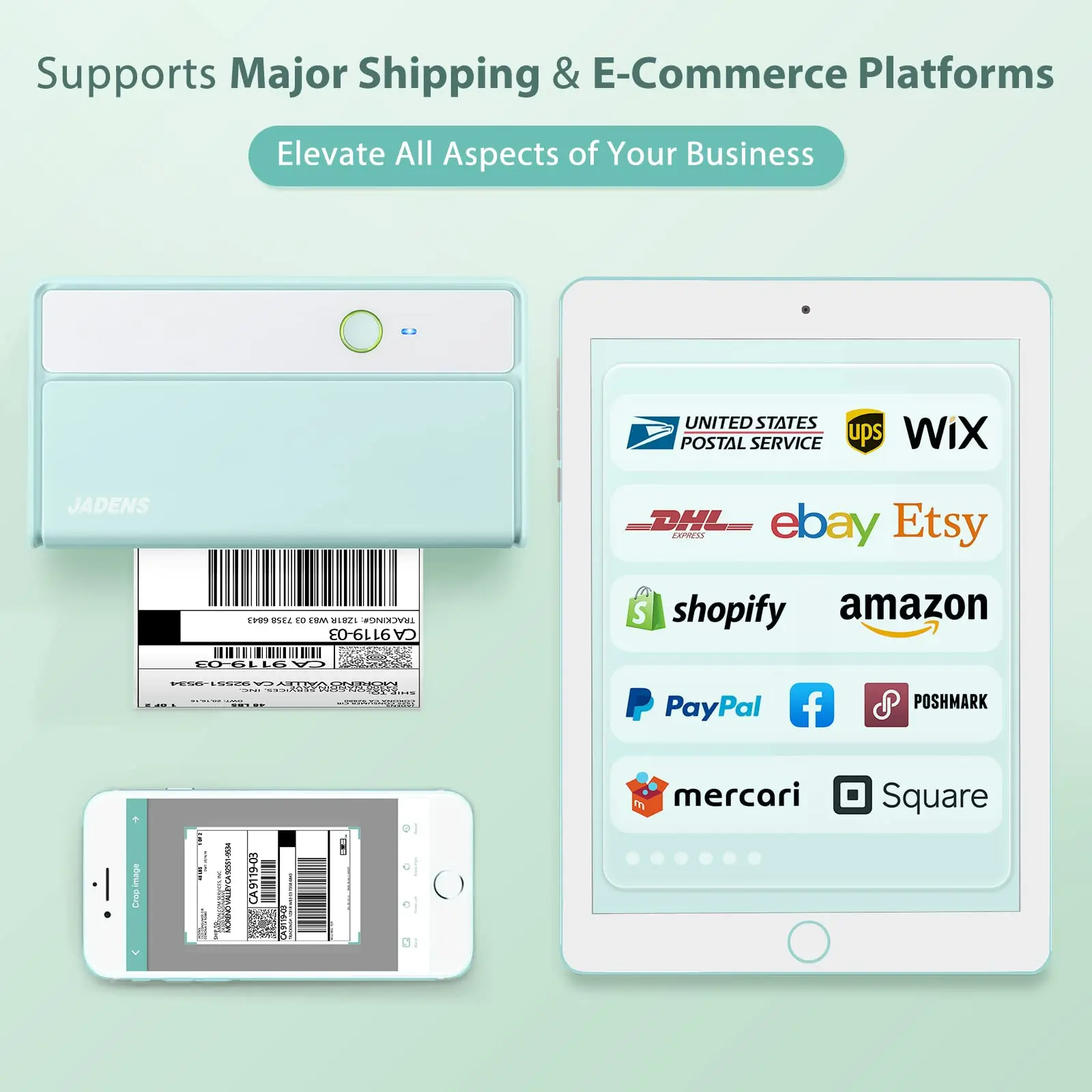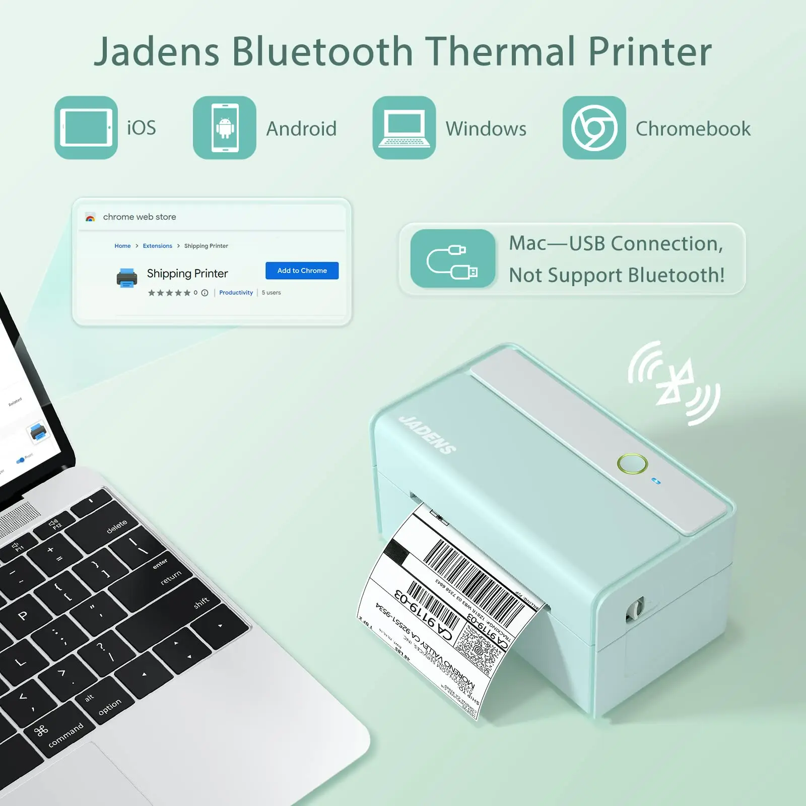 Jadens Bluetooth thermal shipping printer prints labels wirelessly via Bluetooth from your smartphones (iPhone & Android), iPad, PC (Windows.10.11 or newer), Mac (10.9 and newer). (Tips: Mac devices prints via a USB cable only)