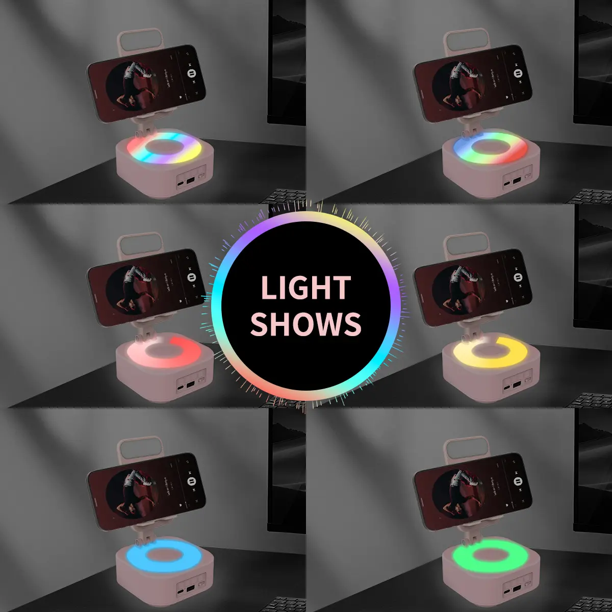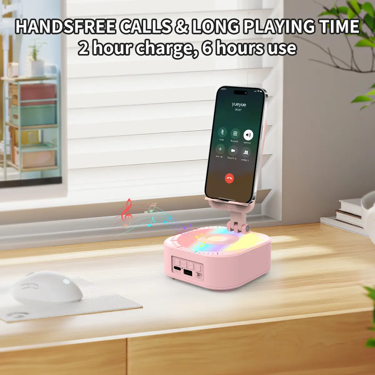 Elecomo phone holder frees your hands while enhancing your phone's sound. The Bluetooth speaker amplifies your calls, making them clearer. Insert a USB drive for simultaneous music playback. Cool LED lights add a stylish touch. Perfect for men and women, this is an ideal gift. Enjoy the convenience of a foldable, rotatable stand that saves space and is easy to carry.