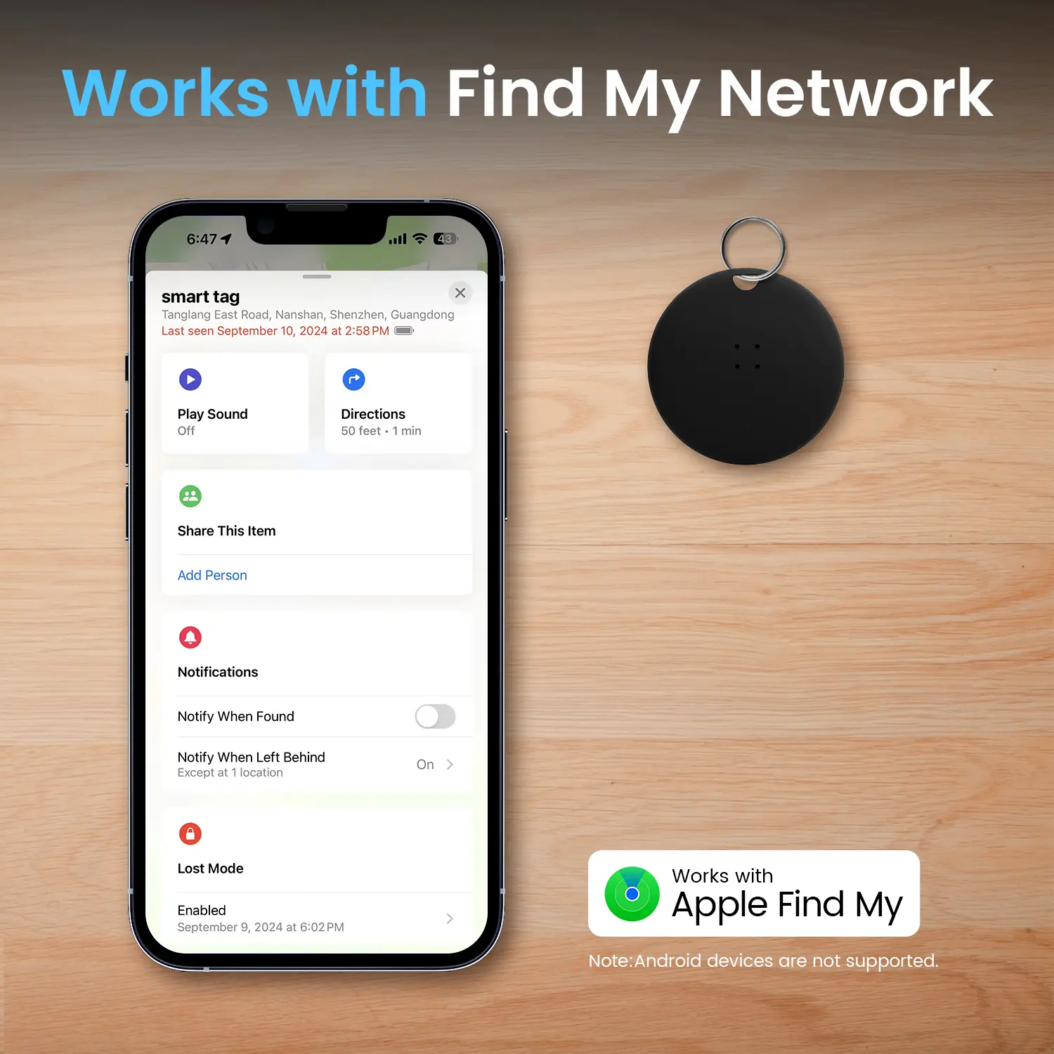 ·Left Behind Remind and Lost Mode: If an item with a Smart Bluetooth tracker is forgotten and the Bluetooth connection to your iOS device is disconnected, the Find My app will immediately send you a notification that the item is missing. If you preset Lost Mode and retain your contact information, the Key Finder Tracker will allow nearby Apple devices to access your contact information and remotely provide you with the location of the tag.