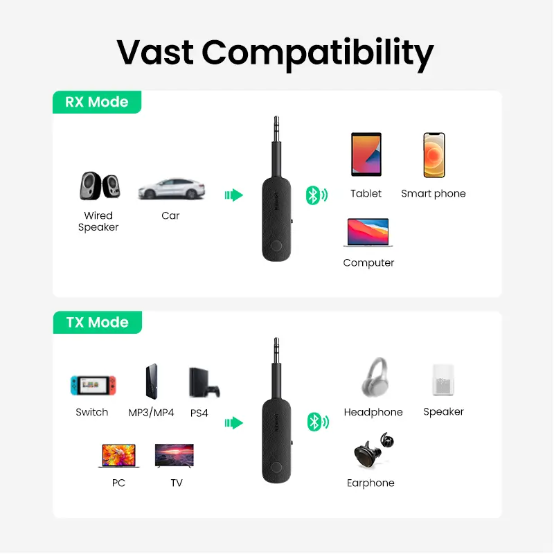 ·2 in 1 Bluetooth Transmitter Receiver: This UGREEN 3.5mm wireless adapter supports both TX and RX modes. Whether at home, in the car, or on a plane, it can easily meet your wireless Bluetooth needs. Simply connect it to a non-Bluetooth device, such as a plane or car stereo, and enjoy Bluetooth wireless sound. Not only is it a great gadget for enabling wireless Bluetooth, but it's also an airplane travel essential, eliminating the hassle of wired connections!