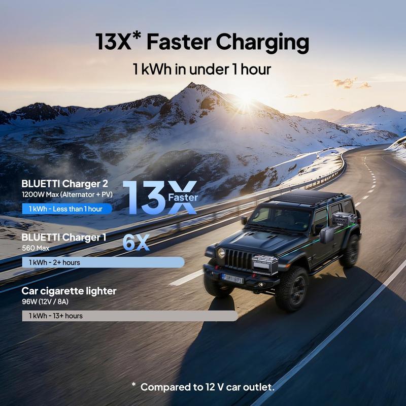 1. Alternator and solar panels charge the power station, extra batteries, and DC panel while driving, without the need to switch cables or choose between charging and powering devices.