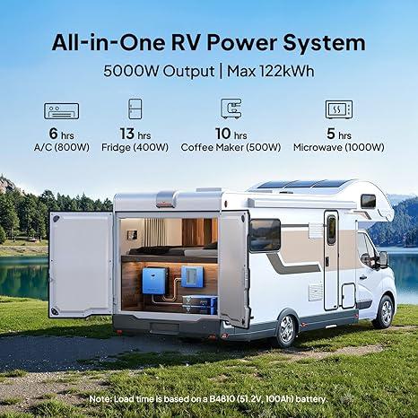 Equipped with an advanced LiFePO4 battery, the RV5 Power Hub offers 6,000+ cycles. Run your A/C, microwave, coffee maker, and more simultaneously with 5,000W. Never run out of power on your long road trips.