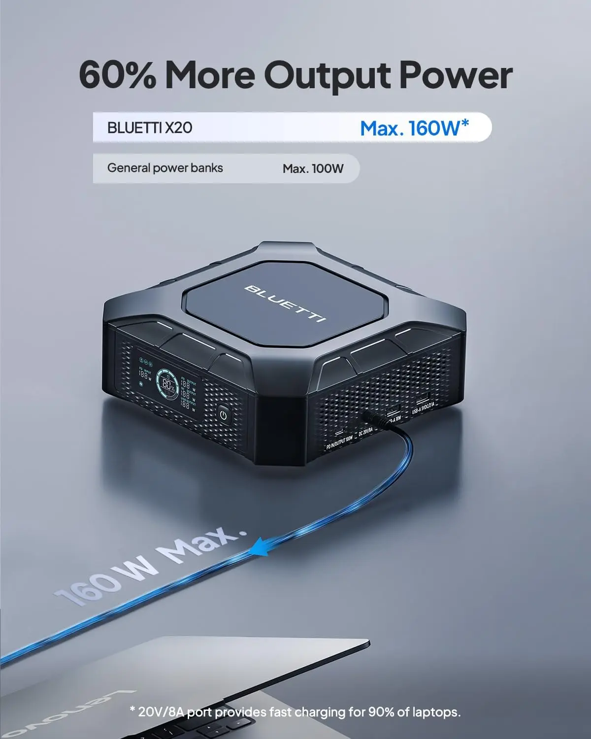 ·[Powerful 160W Output] - With a unique 20V port delivering up to 160W of stable power, the X20 is perfect for powering gaming laptops and other high-demand devices, ensuring full performance even under heavy load.