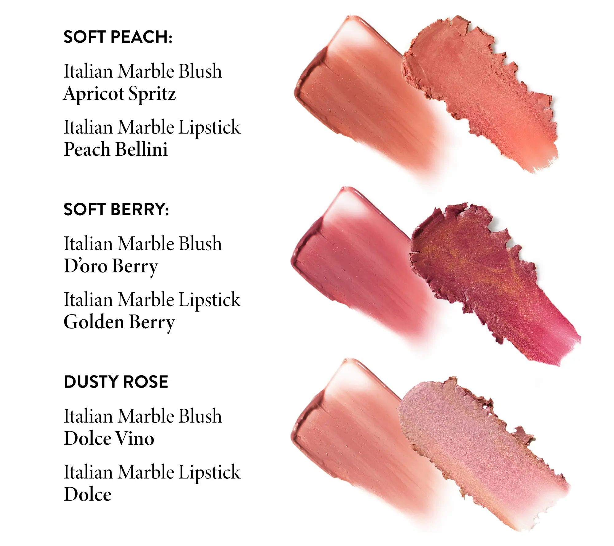 | Ingredients | ITALIAN MARBLE BLUSH STICK INGREDIENTS (APRICOT SPRITZ,DORO BERRY,DOLCE VINO): C12-15 ALKYL BENZOATE,HYDROGENATED VEGETABLE OIL,JOJOBA ESTERS,OCTYLDODECANOL,POLYETHYLENE,BIS-DIGLYCERYL POLYACYLADIPATE-2,CERA MICROCRISTALLINA / MICROCRYSTALLINE WAX / CIRE MICROCRISTALLINE,HYDROGENATED POLYISOBUTENE,NYLON-12,SILICA,MICA,PENTAERYTHRITYL TETRA-DI-T-BUTYL HYDROXYHYDROCINNAMATE,TOCOPHEROL,ETHYLHEXYL PALMITATE,TIN OXIDE,TRIHYDROXYSTEARIN,SODIUM HYALURONATE,GLUCOMANNAN. MAY CONTAIN: RED 7 LAKE (CI 15850),YELLOW 5 LAKE (CI 19140),BLUE 1 LAKE (CI 42090),RED 22 LAKE (CI 45380),IRON OXIDES (CI 77491,CI 77492,CI 77499),TITANIUM DIOXIDE (CI 77891). ITALIAN MARBLE LIPSTICK INGREDIENTS (PEACH BELLINI,GOLDEN BERRY,DOLCE): POLYBUTENE,CAPRYLIC/CAPRIC TRIGLYCERIDE,DIPENTAERYTHRITHRITYL,TETRAHYDROXYSTEARATE/TETRAISOSTEARATE,RICINUS COMMUNIS SEED OIL / RICINUS COMMUNIS (CASTOR) SEED OIL,OZOKERITE,DICALCIUM PHOSPHATE,PENTAERYTHRITYL TERA-DI-T-BUTYL- HYDROXYHYDROCINNAMATE,FLAVOR / AROMA,PRUNUS AMYGDALUS DULCIS OIL / PRUNUS AMYGDALUS DULCIS (SWEET ALMOND) OIL,TOCOPHEROL ACETATE,ASCORBYL PALMITATE,HYDROGENATED CASTOR OIL,LIMOLENE,MICA. MAY CONTAIN : TITANIUM DIOXIDE (CI 77891),TIN OXIDE (CI 77861),RED 28 LAKE (CI 45410),CARMINE (CI 75470),RED 7 (CI 15850),RED 7 LAKE (CI 15850),RED 6 (CI 15850),RED AKA202 (CI 15850),YELLOW 6 LAKE (CI 15985),MANGANESE VIOLET (CI 77742). |