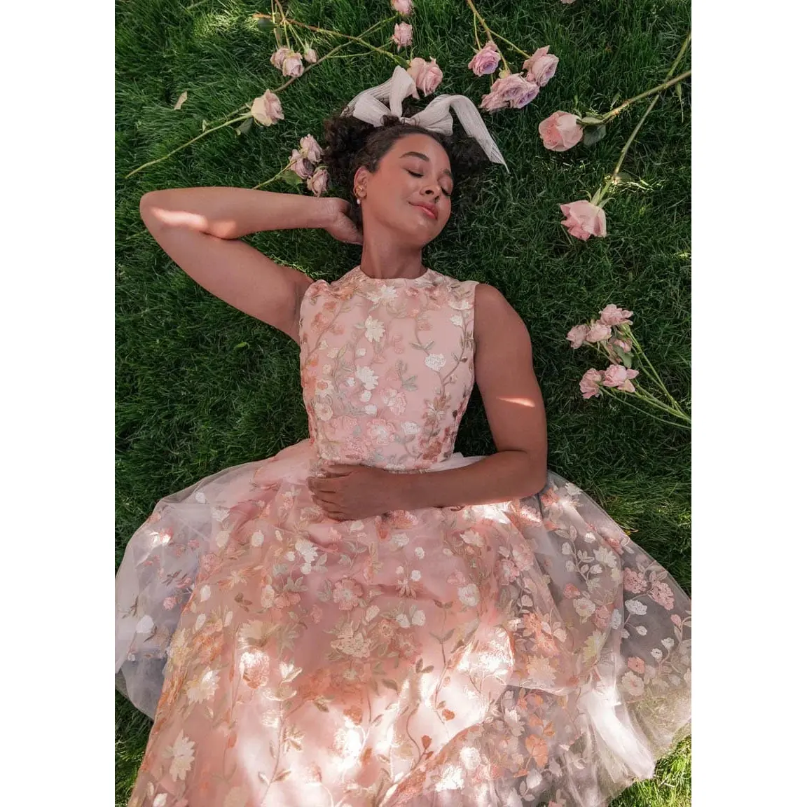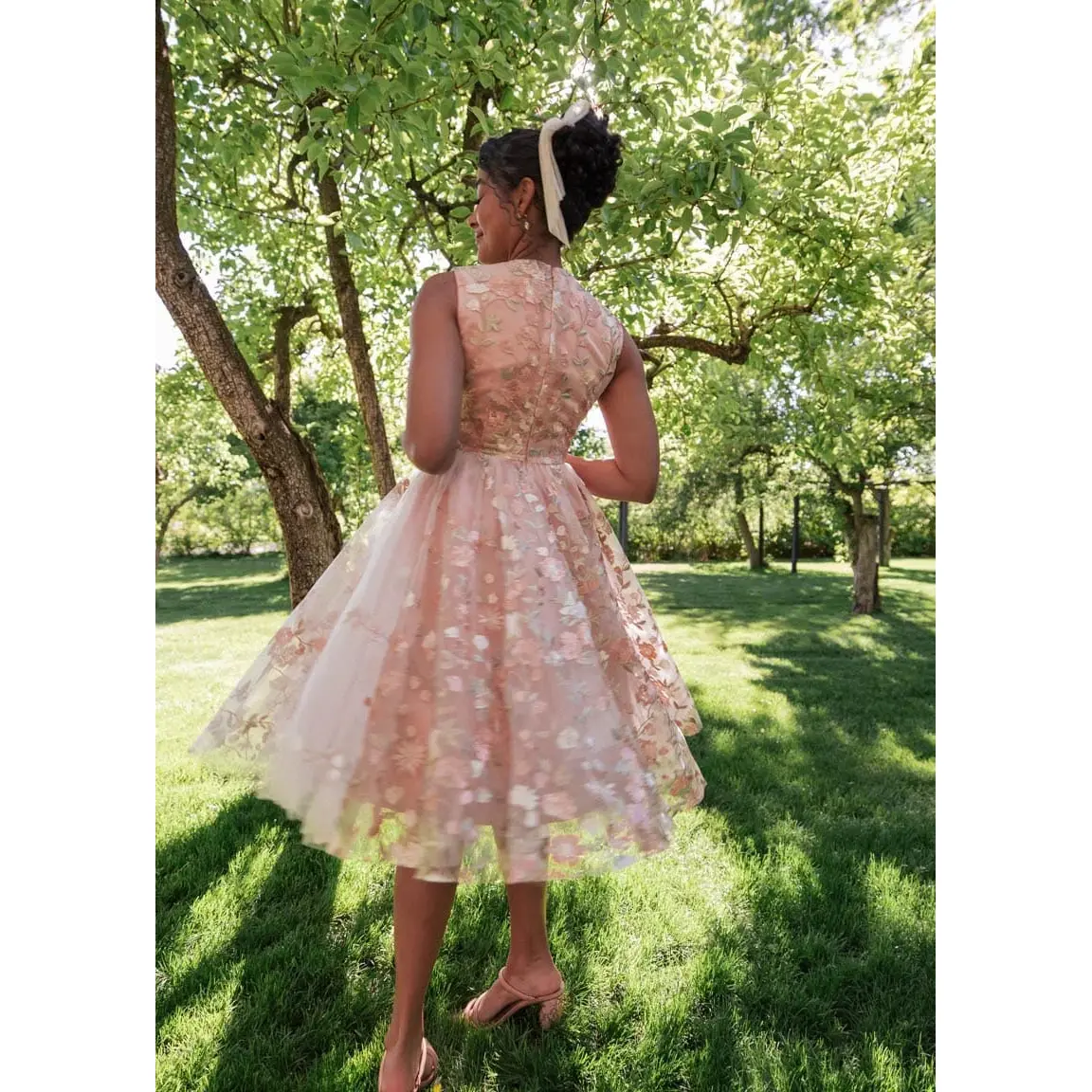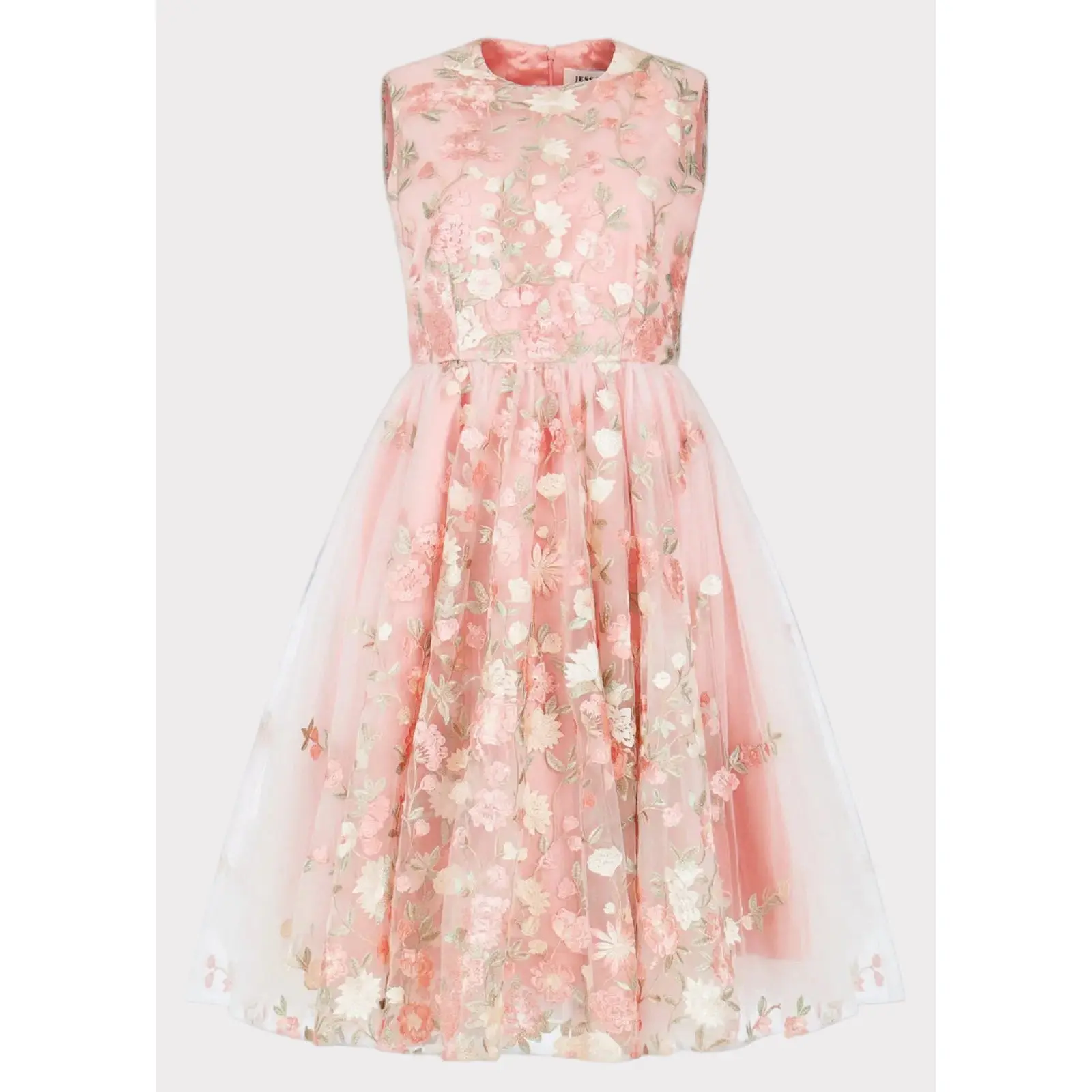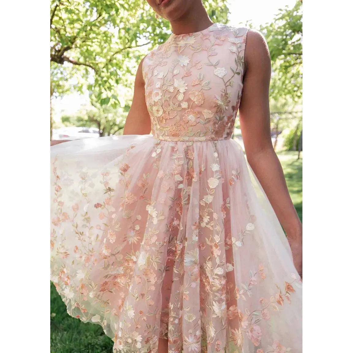 Delicate blush pink with intricate floral embroidery and a soft tulle overlay — the Lucille Dress is a timeless choice for formal occasions, garden parties, and romantic bridal celebrations.