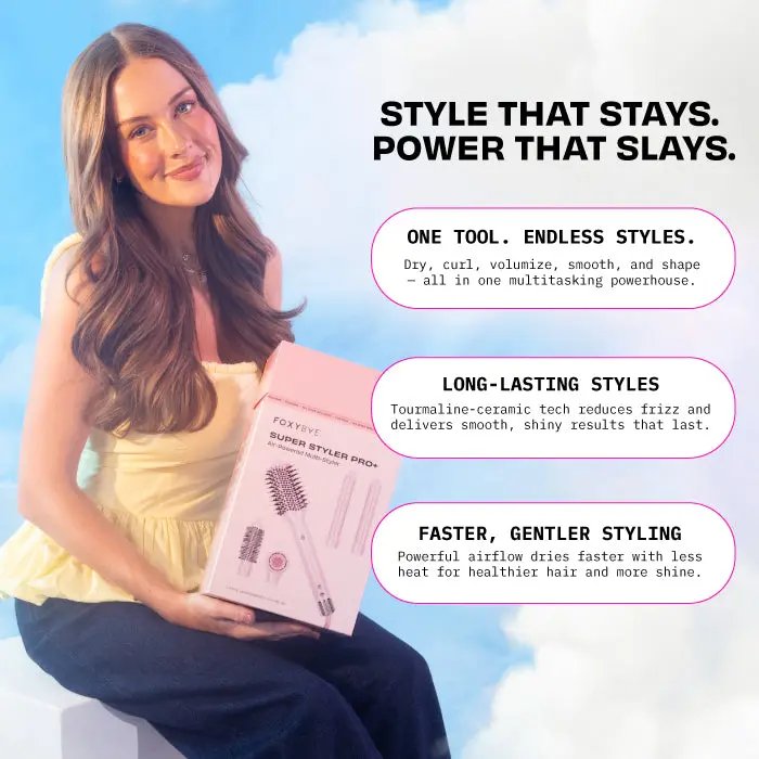 Meet the Super Styler Pro+, your 5-in-1 styling tool! It dries, curls, volumizes, smooths, and styles with minimal damage. Say goodbye to hard work styling and hello to sleek, shimmering hair. This sleeker, slimmer tool is your secret to smarter styling.