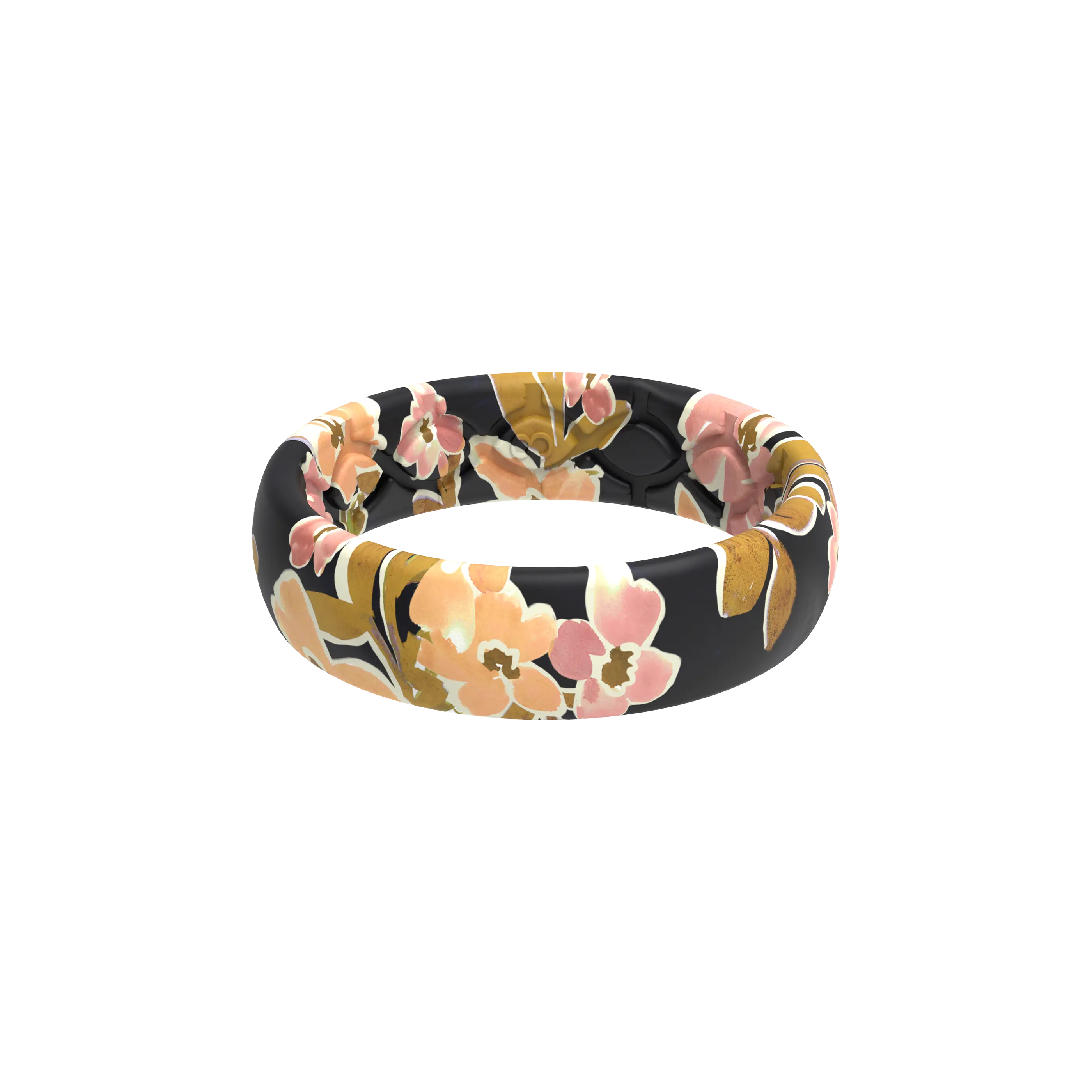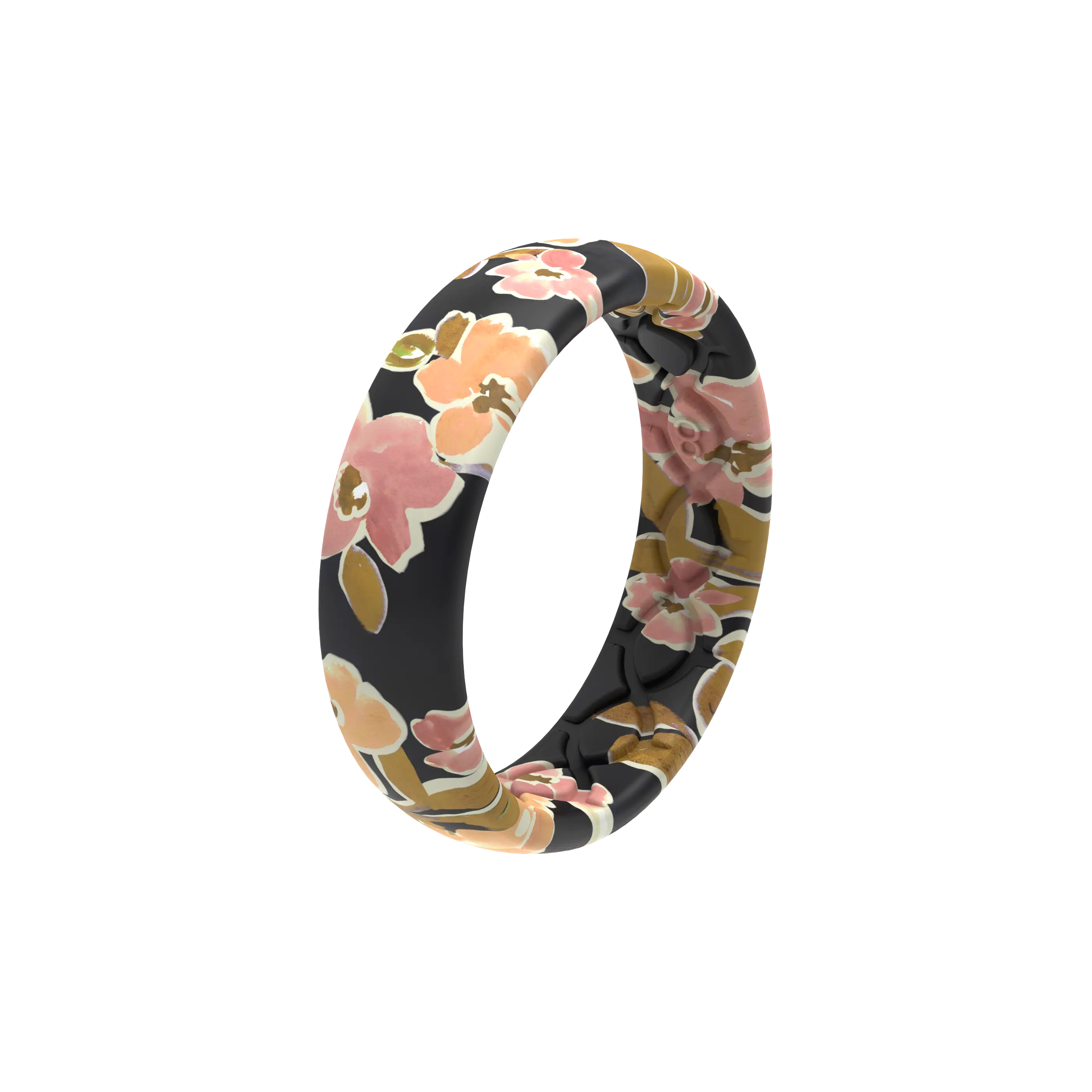 As other reviewers noted, the online ring pattern is not very similar to the actual ring. By the time the flower photo is reduced and printed onto the silicone ring base, the flowers are shrunken and distorted, the color shifts, small ridges appear, and the seam/joint becomes a noticeable perpendicular band cutting across the flowery design. However, I find the distortion and color shift attractive, in an understated way. The ring looks good on a wide range of skin colors and the colors coordinate with a lot of neutral shades, black, and white. The ring is a little thicker and stiffer than the lighter, stretchier, “thin” bands, so I need soapy water to get it off/on.