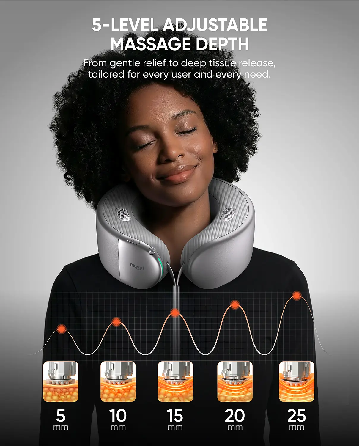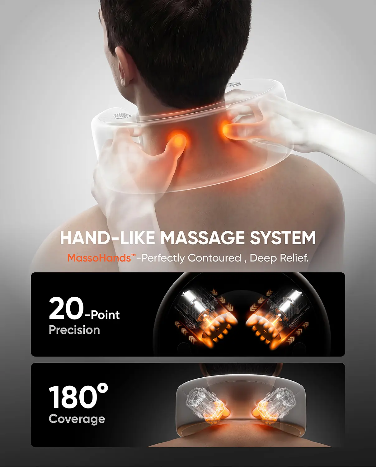 ·3D Massage with 5 Intensity LevelsWith dual 3D kneading nodes, 20 precise massage points and 5 adjustable intensities, it delivers a professional 180° all-around deep massage.