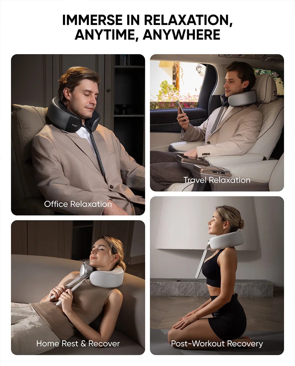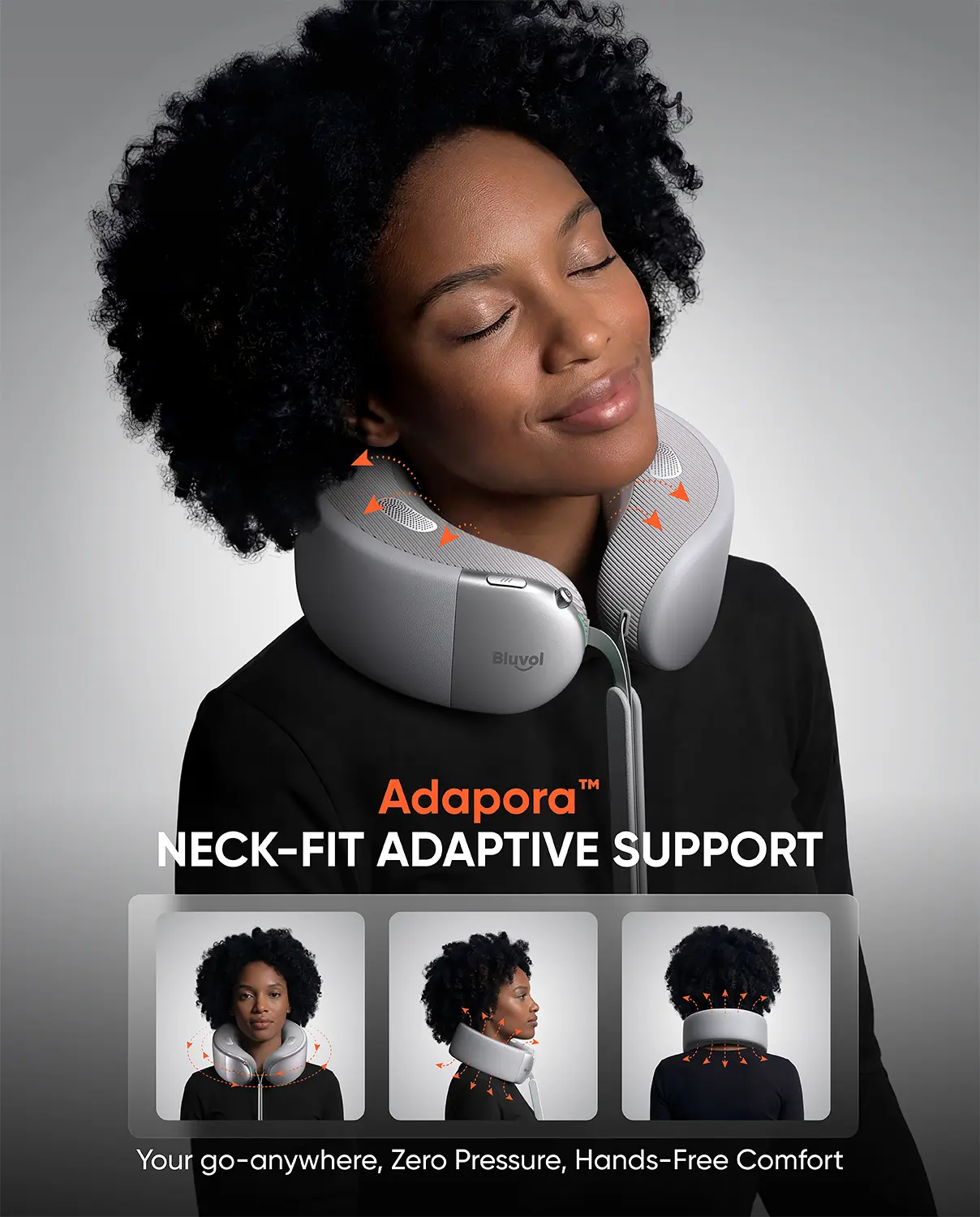·360° Neck Support, Auto FitThe Adapora neck massager uses a C-shaped ergonomic design to automatically fit your neck’s natural curve and provide balanced support.