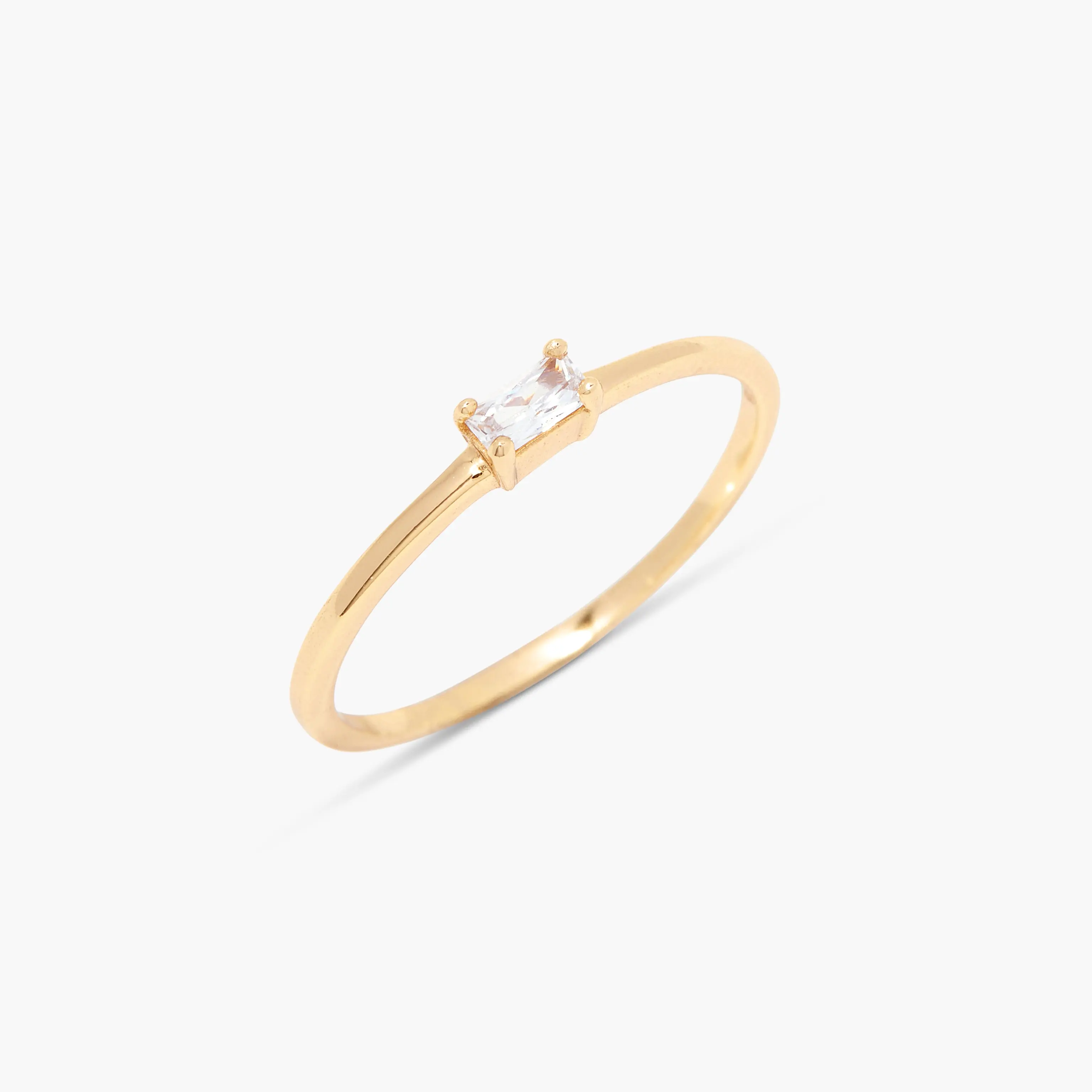 Fall in love with the Blythe Petite Ring, a true masterpiece in fine jewelry. Crafted from 14k gold-plated sterling silver, this elegant ring features a dazzling baguette CZ stone, measuring 5mm x 3mm. The ring's sleek band, only 1mm wide, ensures a delicate and refined look, while an anti-tarnish barrier keeps it looking pristine. Make an unforgettable statement and become the envy of your friends with this exquisite piece.