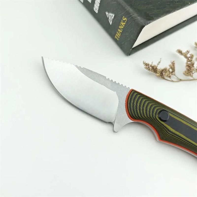 The BM 15017 Fixed Blade Outdoor Knife is perfect for camping, hiking, fishing, and everyday use. Made from 8Cr13MoV steel with a textured G10 handle, it's a durable EDC gear. The knife weighs 119 grams net and includes a K sheath. Total weight is 225 grams with packaging. Ideal for outdoor lovers.