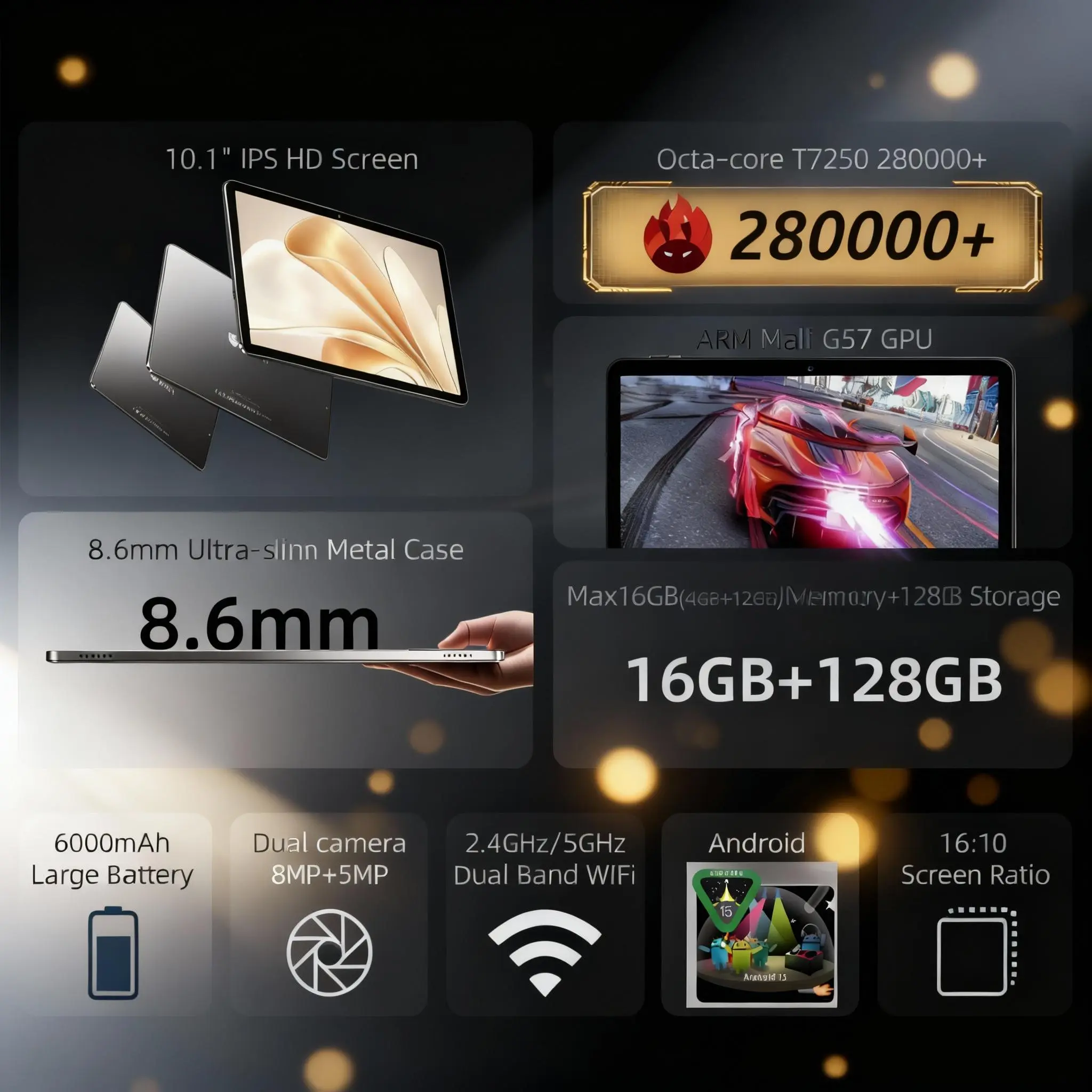 10.1-inch 16:10 screen with 330 nits brightness and 1280 x 800 HD resolution. Rich colors and crisp clarity bring your content to life.