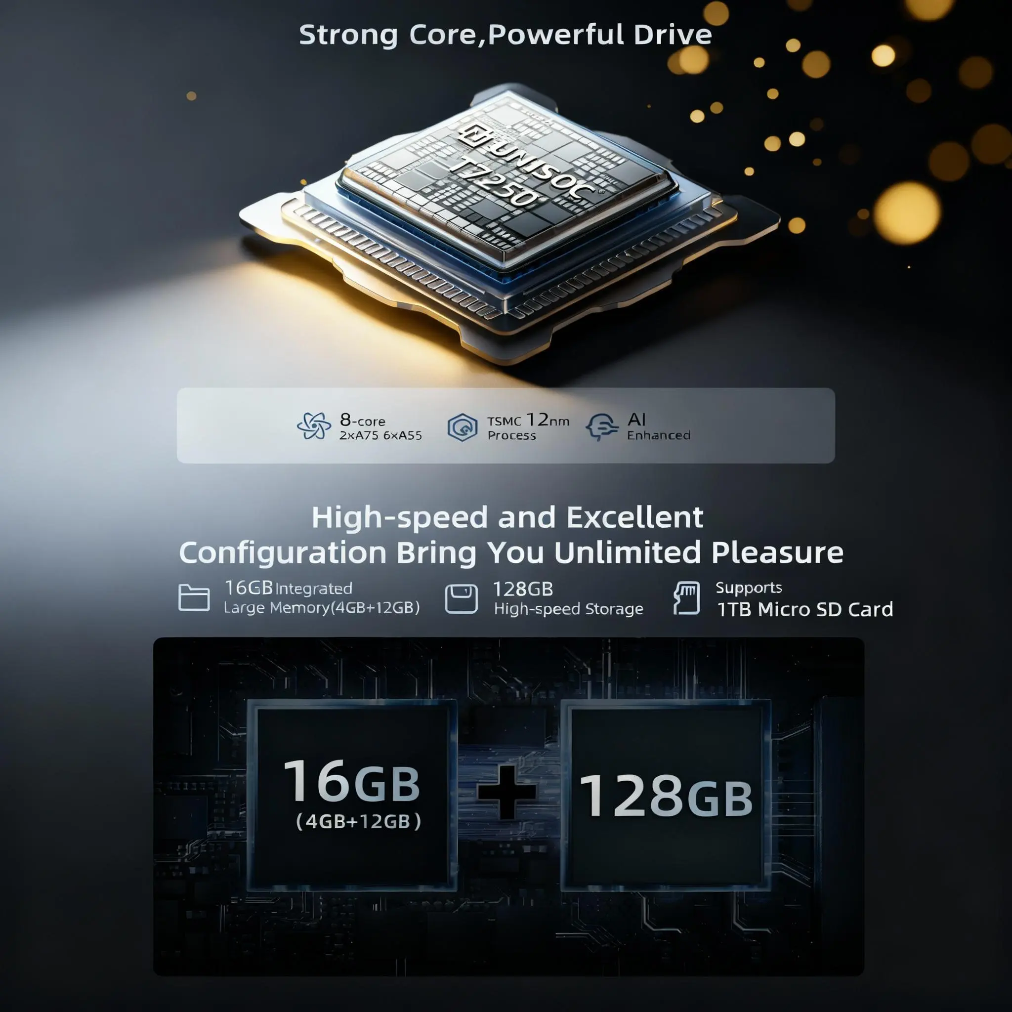 4GB RAM + 12GB Virtual RAM for faster, smoother app performance. 128GB internal storage for games, movies, photos, and more. Expandable up to 1TB with a microSD card for extra space when you need it.