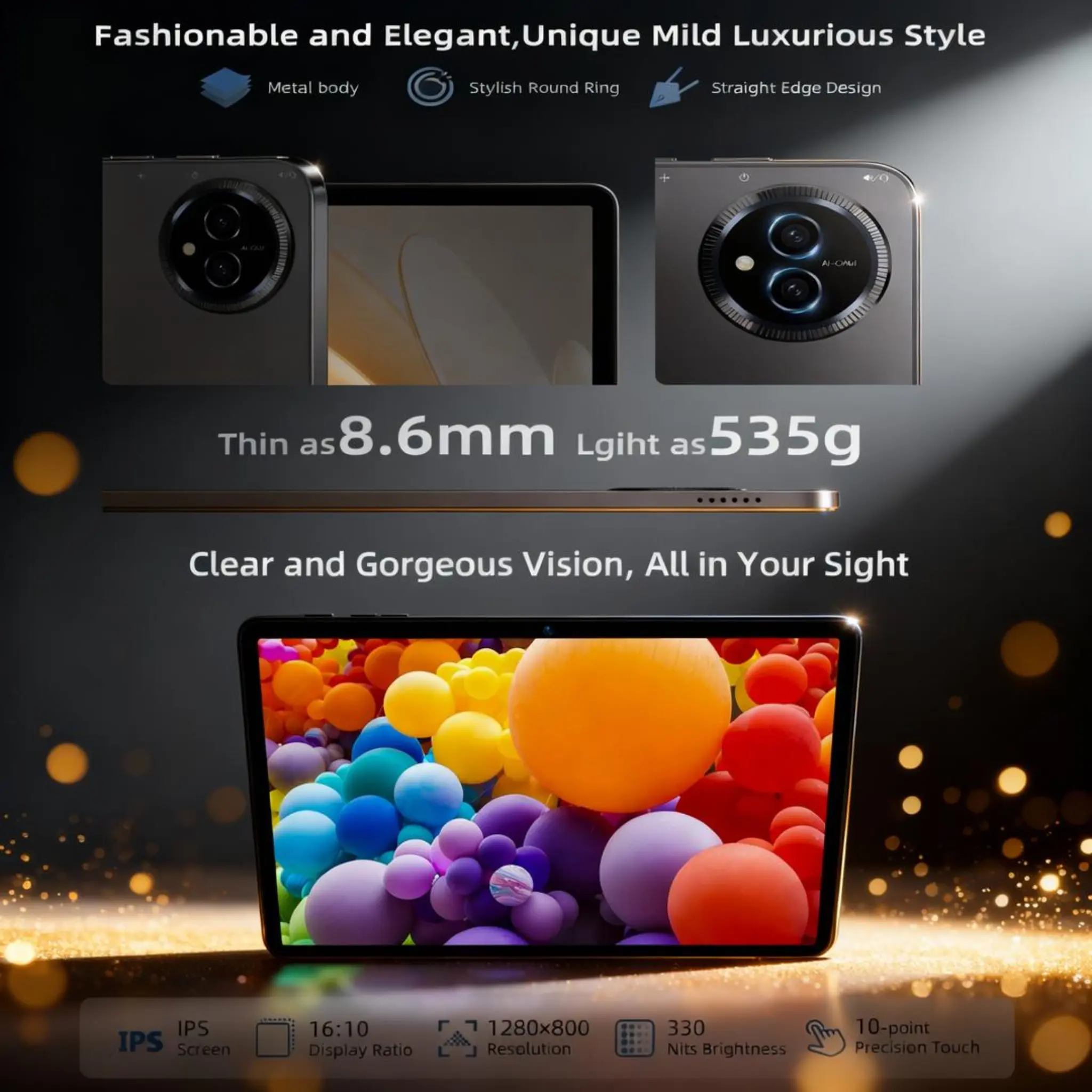 Featuring a stylish deep space gray finish, flat-edge construction, and a slim 8.6mm profile. Weighs only 535g for easy portability.