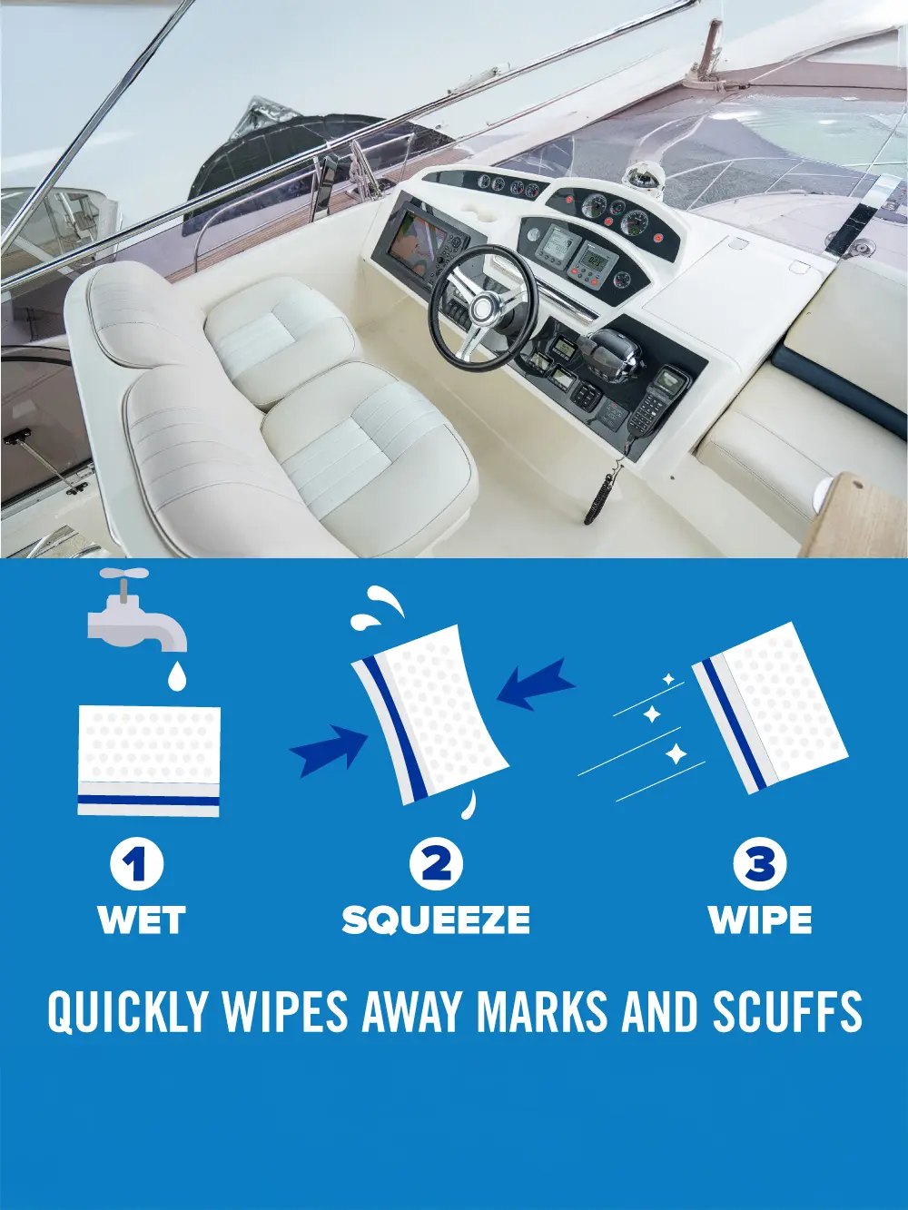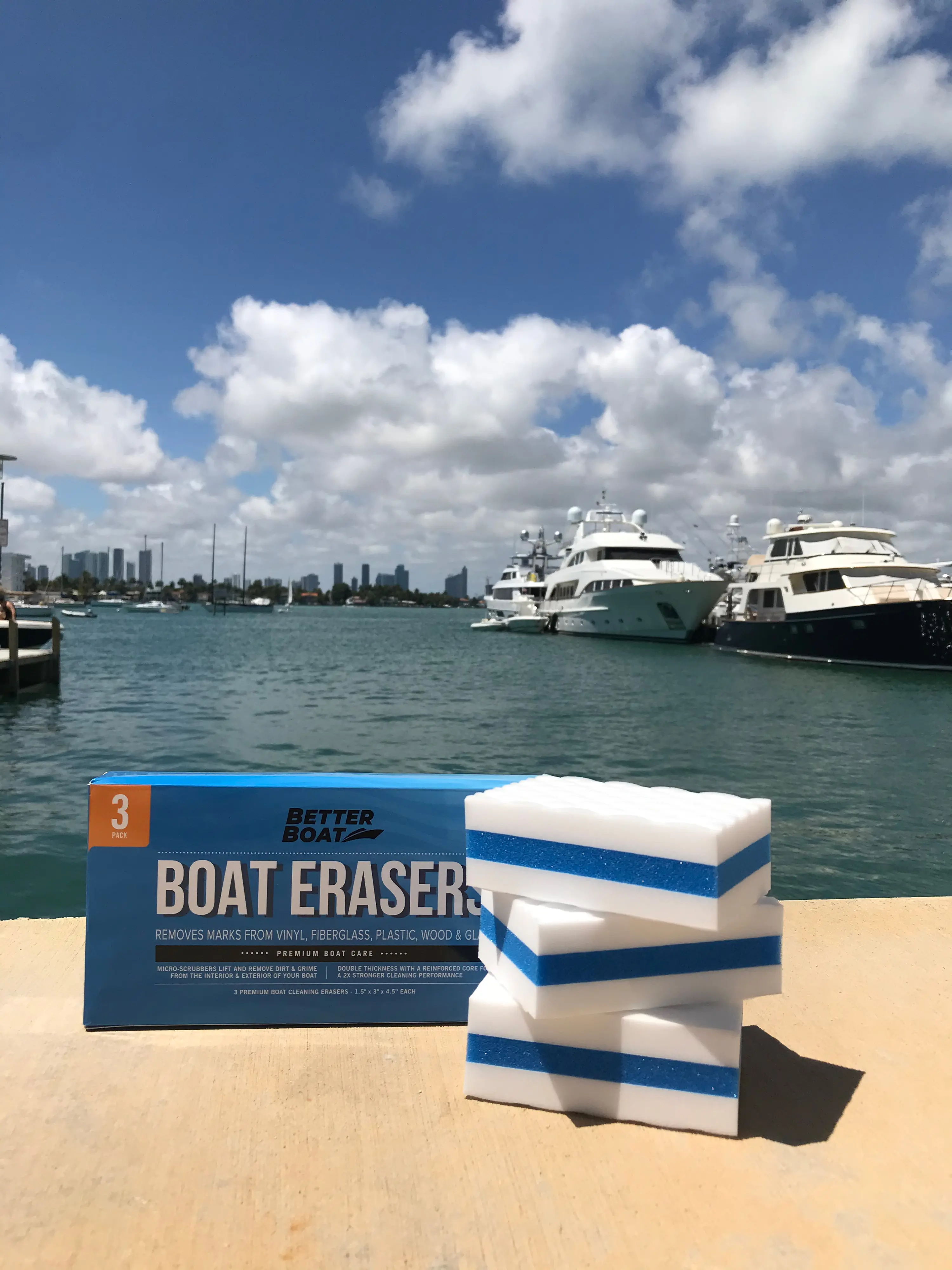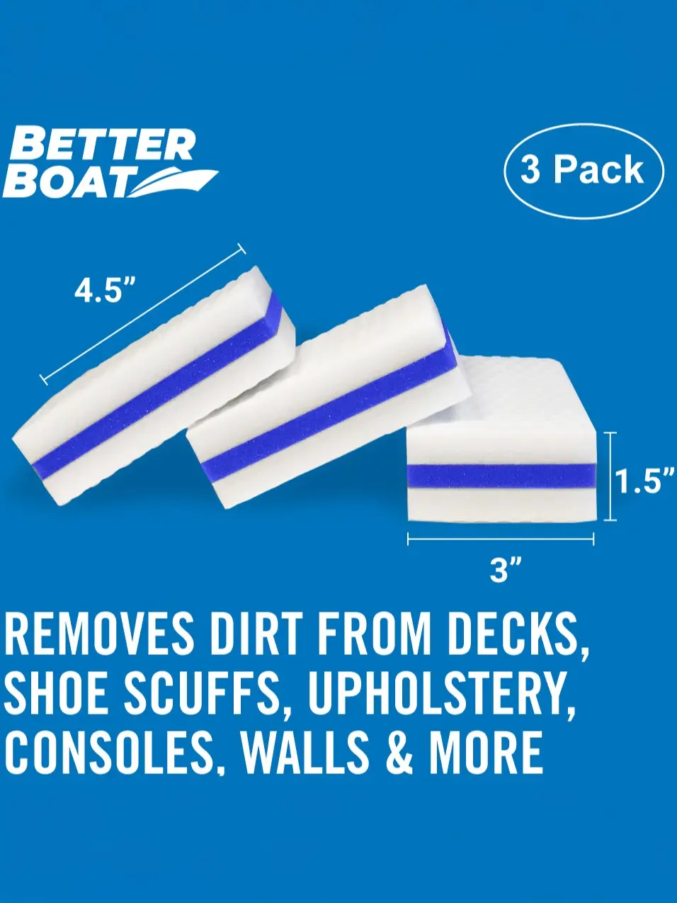 Our boat scuff erasers offer a fast and easy clean! Quickly removes marks and grime with water alone. The reinforced core ensures 2x durability. The textured surface tackles tough stains. Simply wet the eraser sponge, squeeze, and wipe away dirt. Perfect for a quick clean after a day on the water! Each sponge measures 1.5" x 3" x 4.5".